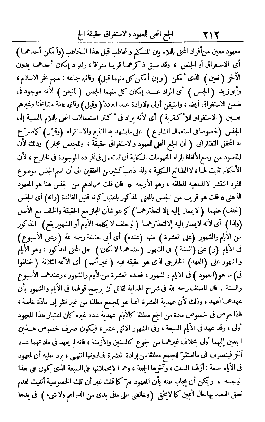 مَعْهُود معِين من أَفْرَاد الْمحلي بِاللَّامِ بَين الْمُتَكَلّم والمخاطب قبل هَذَا التخاطب (وَأمكن أَحدهمَا) أَي الِاسْتِغْرَاق أَو الْجِنْس، وَقد سبق ذكرهمَا قَرِيبا مفرقا، وَالْمرَاد إِمْكَان أَحدهمَا بِدُونِ الآخر (تعين) الَّذِي أمكن (وَإِن أمكن كل مِنْهُمَا قيل) وقائله جمَاعَة: مِنْهُم فَخر الْإِسْلَام، وَأَبُو زيد (الْجِنْس) أَي المُرَاد عِنْد إِمْكَان كل مِنْهُمَا الْجِنْس (للتيقن) لِأَنَّهُ مَوْجُود فِي ضمن الِاسْتِغْرَاق أَيْضا، والمتيقن أولى بالإرادة عِنْد التَّرَدُّد (وَقيل) وقائله عَامَّة مَشَايِخنَا وَغَيرهم تعين (الِاسْتِغْرَاق للأكثرية) أَي لِأَنَّهُ يُرَاد فِي أَكثر استعمالات الْمحلي بِاللَّامِ بِالنِّسْبَةِ إِلَى الْجِنْس (خُصُوصا فِي اسْتِعْمَال الشَّارِع) على مَا يشْهد بِهِ التتبع والاستقراء (وَقرر) كَمَا صرح بِهِ الْمُحَقق التَّفْتَازَانِيّ (أَن الْجمع الْمحلي للمعهود والاستغراق حَقِيقَة، وللجنس مجَاز) وَذَلِكَ لِأَن الْمَقْصُود من وضع الْأَلْفَاظ بِإِزَاءِ المفهومات الْكُلية أَن تسْتَعْمل فِي أَفْرَاده الْمَوْجُودَة فِي الْخَارِج لِأَن الْأَحْكَام تثبت لَهَا، لَا الطبائع الْكُلية، وَلذَا ذهب كثير من الْمُحَقِّقين إِلَى أَن اسْم الْجِنْس مَوْضُوع للفرد الْمُنْتَشِر لَا الْمَاهِيّة الْمُطلقَة، وَهُوَ الْأَوْجه فَإِن قلت مُرَادهم من الْجِنْس هُنَا هُوَ الْمَعْهُود الذهْنِي قلت هُوَ قريب من الْجِنْس بِالْمَعْنَى الْمَذْكُور بِاعْتِبَار كَونه قَلِيل الْفَائِدَة (وَأَنه) أَي الْجِنْس (خلف) عَنْهُمَا (لَا يُصَار إِلَيْهِ إِلَّا لتعذرهما) كَمَا هُوَ شَأْن الْمجَاز مَعَ الْحَقِيقَة وَالْخلف مَعَ الأَصْل (ولدا) أَي لِأَنَّهُ لَا يُصَار إِلَيْهِ لتعذرهما (لَو حلف لَا يكلمهُ الْأَيَّام أَو الشُّهُور يَقع) الْمَذْكُور من الْأَيَّام والشهور (على الْعشْرَة) مِنْهَا (عِنْده) أَي أبي حنيفَة رَحمَه الله (وعَلى الْأُسْبُوع) فِي الْأَيَّام (و) على (السّنة) فِي الشُّهُور (عِنْدهمَا لَا مَكَان) حمل الْمحلي الْمَذْكُور: وَهُوَ الْأَيَّام والشهور على (الْعَهْد) الْخَارِجِي الَّذِي هُوَ حَقِيقَة فِيهِ (غير أَنهم) أَي الْأَئِمَّة الثَّلَاثَة (اخْتلفُوا فِي) مَا هُوَ (الْمَعْهُود) فِي الْأَيَّام والشهور، فَعنده الْعشْرَة من الْأَيَّام والشهور، وَعِنْدَهُمَا الْأُسْبُوع وَالسّنة. قَالَ المُصَنّف رَحمَه الله فِي شرح الْهِدَايَة لقَائِل أَن يرجح قَوْلهمَا فِي الْأَيَّام والشهور بِأَن عهد هما أَعهد، وَذَلِكَ لِأَن عهدية الْعشْرَة إِنَّمَا هُوَ للْجمع مُطلقًا من غير نظر إِلَى مَادَّة خَاصَّة، فَإِذا عرض فِي خُصُوص مَادَّة من الْجمع مُطلقًا كالأيام عهدية عدد غَيره كَانَ اعْتِبَار هَذَا الْمَعْهُود أولى، وَقد عهد فِي الْأَيَّام السَّبْعَة، وَفِي الشُّهُور الاثنى عشر، فَيكون صرف خُصُوص هذَيْن الجمعين إِلَيْهِمَا أولى بِخِلَاف غَيرهمَا من الجموع كالسنين والأزمنة، فَإِنَّهُ لم يعْهَد فِي مادتهما عدد آخر فَيَنْصَرِف إِلَى مَا اسْتَقر للْجمع مُطلقًا من إِرَادَة الْعشْرَة فَمَا دونهَا انْتهى، يرد عَلَيْهِ أَن الْمَعْهُود فِي الْأَيَّام سَبْعَة: أَولهَا السبت، وَآخِرهَا الْجُمُعَة، وهما لَا يحملانها على السَّبْعَة الَّذِي يكون على هَذَا الْوَجْه، وَيُمكن أَن يُجَاب عَنهُ بِأَن الْمَعْهُود يعم كَمَا قلت غير أَن تِلْكَ الخصوصية ألغيت لعدم تعلق الْقَصْد بهَا حَال الْيَمين كَمَا لَا يخفى (وخالعني على مَا فِي يَدي من الدَّرَاهِم وَلَا شَيْء) فِي يَدهَا