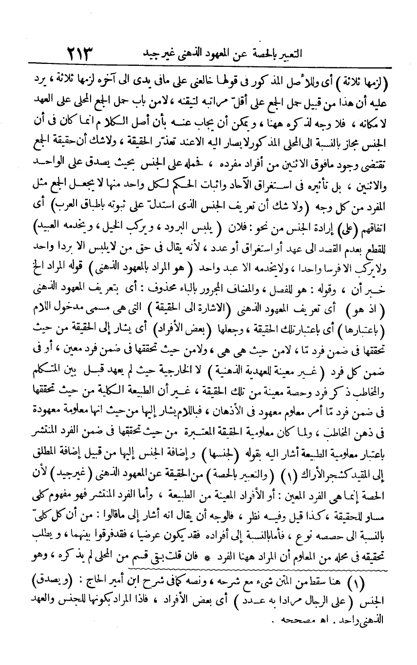 (لَزِمَهَا ثَلَاثَة) أَي وللأصل الْمَذْكُور فِي قَوْلهَا خالعني على مَا فِي يَدي إِلَى آخِره لَزِمَهَا ثَلَاثَة، يرد عَلَيْهِ أَن هَذَا من قبيل حمل الْجمع على أقل مراتبه لتيقنه، لَا من بَاب حمل الْجمع الْمحلي على الْعَهْد لامكانه، فَلَا وَجه لذكره هَهُنَا، وَيُمكن أَن يُجَاب عَنهُ بِأَن أصل الْكَلَام إِنَّمَا كَانَ فِي أَن الْجِنْس مجَاز بِالنِّسْبَةِ إِلَى الْمحلي الْمَذْكُور لَا يُصَار إِلَيْهِ إِلَّا عِنْد تعذر الْحَقِيقَة، وَلَا شكّ أَن حَقِيقَة الْجمع تَقْتَضِي وجود مَا فَوق الِاثْنَيْنِ من أَفْرَاد مفرده، فَحَمله على الْجِنْس بِحَيْثُ يصدق على الْوَاحِد والاثنين، بل تَأْثِيره فِي استغراق الْآحَاد وَإِثْبَات الحكم لكل وَاحِد مِنْهَا لَا يَجْعَل الْجمع مثل الْمُفْرد من كل وَجه (وَلَا شكّ أَن تَعْرِيف الْجِنْس الَّذِي اسْتدلَّ على ثُبُوته باطباق الْعَرَب) أَي اتِّفَاقهم (على) إِرَادَة الْجِنْس من نَحْو: فلَان (يلبس البرود، ويركب الْخَيل، ويخدمه العبيد) للْقطع بِعَدَمِ الْقَصْد إِلَى عهد أَو استغراق أَو عدد، لِأَنَّهُ يُقَال فِي حق من لَا يلبس إِلَّا بردا وَاحِدًا وَلَا يركب إِلَّا فرسا وَاحِدًا، وَلَا يَخْدمه إِلَى عبد وَاحِد (هُوَ المُرَاد بالمعهود الذهْنِي) قَوْله المُرَاد الخ خَبره أَن، وَقَوله: هُوَ للفصل، والمضاف الْمَجْرُور بِالْبَاء مَحْذُوف: أَي بتعريف الْمَعْهُود الذهْنِي (إِذْ هُوَ) أَي تَعْرِيف الْمَعْهُود الذهْنِي (الْإِشَارَة إِلَى الْحَقِيقَة) الَّتِي هِيَ مُسَمّى مَدْخُول اللَّام (باعتبارها) أَي بِاعْتِبَار تِلْكَ الْحَقِيقَة، وَجعلهَا (بعض الْأَفْرَاد) أَي يشار إِلَى الْحَقِيقَة من حَيْثُ تحققها فِي ضمن فَرد مَا، لَا من حَيْثُ هِيَ هِيَ، وَلَا من حَيْثُ تحققها فِي ضمن فَرد معِين، أَو فِي ضمن كل فَرد (غير مُعينَة للعهدية الذهنية) لَا الخارجية حَيْثُ لم يعْهَد قبل بَين الْمُتَكَلّم والمخاطب ذكر فَرد وَحِصَّة مُعينَة من تِلْكَ الْحَقِيقَة، غير أَن الطبيعة الْكُلية من حَيْثُ تحققها فِي ضمن فَرد مَا أَمر مَعْلُوم مَعْهُود فِي الأذهان، فباللام يشار إِلَيْهَا من حَيْثُ أَنَّهَا مَعْلُومَة معهودة فِي ذهن الْمُخَاطب، وَلما كَانَ معلومية الْحَقِيقَة الْمُعْتَبرَة من حَيْثُ تحققها فِي ضمن الْفَرد الْمُنْتَشِر بِاعْتِبَار معلومية الطبيعة أَشَارَ إِلَيْهِ بقوله (لجنسها) وَإِضَافَة الْجِنْس إِلَيْهَا من قبيل إِضَافَة الْمُطلق إِلَى الْمُقَيد كشجر الْأَرَاك (وَالتَّعْبِير بِالْحِصَّةِ) من الْحَقِيقَة عَن الْمَعْهُود الذهْنِي (غير جيد) لِأَن الْحصَّة إِنَّمَا هِيَ الْفَرد الْمعِين: أَو الْأَفْرَاد الْمعينَة من الطبيعة، وَأما الْفَرد الْمُنْتَشِر فَهُوَ مَفْهُوم كلي مسَاوٍ للْحَقِيقَة، كَذَا قيل وَفِيه نظر، فَالْوَجْه أَن يُقَال أَنه أَشَارَ إِلَى مَا قَالُوا: من أَن كل كلي بِالنِّسْبَةِ إِلَى حصصه نوع، فَأَما بِالنِّسْبَةِ إِلَى أَفْرَاده فقد يكون عرضيا، فقد فرقوا بَينهمَا، وَيطْلب تَحْقِيقه فِي مَحَله من الْمَعْلُوم أَن المُرَاد هَهُنَا الْفَرد فَإِن قلت بَقِي قسم من الْمحلي لم يذكرهُ، وَهُوَ