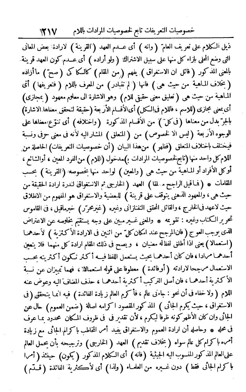ذيل الْكَلَام على تَعْرِيف الْعَام (وَأَنه) أَي عدم الْعَهْد (الْقَرِينَة) لإِرَادَة بعض الْمعَانِي الَّتِي وضع الْمحلى بِإِزَاءِ كل مِنْهَا على سَبِيل الِاشْتِرَاك (وَلَو أَرَادَهُ) أَي عدم كَون الْعَهْد قرينَة بِالْمَعْنَى الْمَذْكُور (قَائِل أَن الِاسْتِغْرَاق) يفهم (من الْمقَام) كالسكاكي (صَحَّ) مَا أَرَادَهُ (بِخِلَاف الْمَاهِيّة من حَيْثُ هِيَ) فَإِنَّهَا (لم تتبادر) من الْمُعَرّف بِاللَّامِ (فتعريفها) أَي الْمَاهِيّة من حَيْثُ هِيَ (تَعْلِيق معنى حَقِيقِيّ للام) وَهُوَ الْإِشَارَة إِلَى مَعْلُوم مَعْهُود (بمجازى) أَي بِمَعْنى مجازى (للاسم، فَاللَّام فِي الْكل) أَي الْأَقْسَام الْأَرْبَعَة (حَقِيقَة لتحَقّق مَعْنَاهَا الْإِشَارَة) بِالْجَرِّ بدل من مَعْنَاهَا (فِي كل) من الْأَقْسَام الْمَذْكُورَة (واختلافه) أَي تنوع مَعْنَاهَا على الْوُجُوه الْأَرْبَعَة (لَيْسَ إِلَّا لخُصُوص) من (الْمُتَعَلّق) الْمشَار إِلَيْهِ لِأَنَّهُ فِي معنى حرفي وَنسبَة فيختلف باخْتلَاف الْمُتَعَلّق (فَظهر) من هَذَا الْبَيَان (أَي خصوصيات التعريفات) الْحَاصِلَة من اللَّام كل وَاحِد مِنْهَا (تَابع لخصوصيات المرادات ب) مَدْخُول (اللَّام) من الْفَرد الْمعِين، أَو الشَّائِع، أَو كل الْأَفْرَاد أَو الْمَاهِيّة من حَيْثُ هِيَ (والمعين) لوَاحِد مِنْهَا بِخُصُوصِهِ (الْقَرِينَة) بِحَسب المقامات (فَمَا قيل الرَّاجِح مُطلقًا) الْعَهْد (الْخَارِجِي ثمَّ الِاسْتِغْرَاق لندرة إِرَادَة الْحَقِيقَة من حَيْثُ هِيَ، والمعهود الذهْنِي يتَوَقَّف على قرينَة) للبعضية والاستغراق هُوَ الْمَفْهُوم من الاطلاق حَيْثُ لَا عهد فِي الْخَارِج، وَالْقَائِل الْمُحَقق التَّفْتَازَانِيّ وَغَيره (غير مُحَرر) خبر مَا قيل، فِي الْقَامُوس تَحْرِير الْكتاب وَغَيره: تقويمه وَالْمعْنَى غير مُبين على وَجه يَسْتَقِيم بخلوصه عَن الِاعْتِرَاض الَّذِي يُوجب العوج (فَإِن الْمُرَجح عِنْد إِمْكَان كل من اثْنَيْنِ فِي الْإِرَادَة الأكثرية) لأَحَدهمَا (اسْتِعْمَالا) يَعْنِي إِذا أطلق لفظ لَهُ مَعْنيانِ، وَيصِح فِي ذَلِك الْمقَام إِرَادَة كل مِنْهُمَا فَلَا يتَعَيَّن أَحدهمَا مرَادا، فَإِن كَانَ أَحدهمَا بِحَيْثُ يسْتَعْمل اللَّفْظ فِيهِ أَكثر تكون أكثريته بِحَسب الِاسْتِعْمَال مرجحا لإرادته (أَو فَائِدَة) مَعْطُوفًا على قَوْله اسْتِعْمَالا، فهما تمييزان عَن نِسْبَة الأكثرية أَحدهمَا، فَإِن أصل التَّرْكِيب أكثرية أَحدهمَا، حذف الْمُضَاف إِلَيْهِ وَعوض عَنهُ اللَّام (وَلَا خَفَاء فِي أَن نَحْو: جَاءَنِي عَالم، فَأكْرم الْعَالم زِيَادَة الْفَائِدَة) فِيهِ إِنَّمَا يتَحَقَّق (فِي الِاسْتِغْرَاق، حَيْثُ يكرم الجائي) الْمَذْكُور الْمَقْصُود إكرامه أَصَالَة (ضمن الْعُمُوم) حَال عَن الجائي وَإِن كَانَ الْأَظْهر كَونه ظرفا ليكرم، لِأَن تَقْدِير فِي فِي ظروف الْمَكَان مَحْدُود بِمَا عرف فِي مَحَله وَحَاصِله أَن إِرَادَة الْعُمُوم والاستغراق يُفِيد أَمر الْمُخَاطب بإكرام الجائي مَعَ زِيَادَة أمره بإكرام كل عَالم سواهُ (بِخِلَاف تَقْدِيم) الْعَهْد (الْخَارِجِي) وترجيحه بِأَن يحمل الْعَالم على الْعَالم الْمَذْكُور الْمَنْسُوب إِلَيْهِ الجيئية (فَإِنَّهُ) أَي الْكَلَام الْمَذْكُور (يكون) حِينَئِذٍ (أمرا بإكرام الجائي فَقَط) دون غَيره من الْعلمَاء (وَلذَا) أَي لأكثرية الْفَائِدَة (قدم)