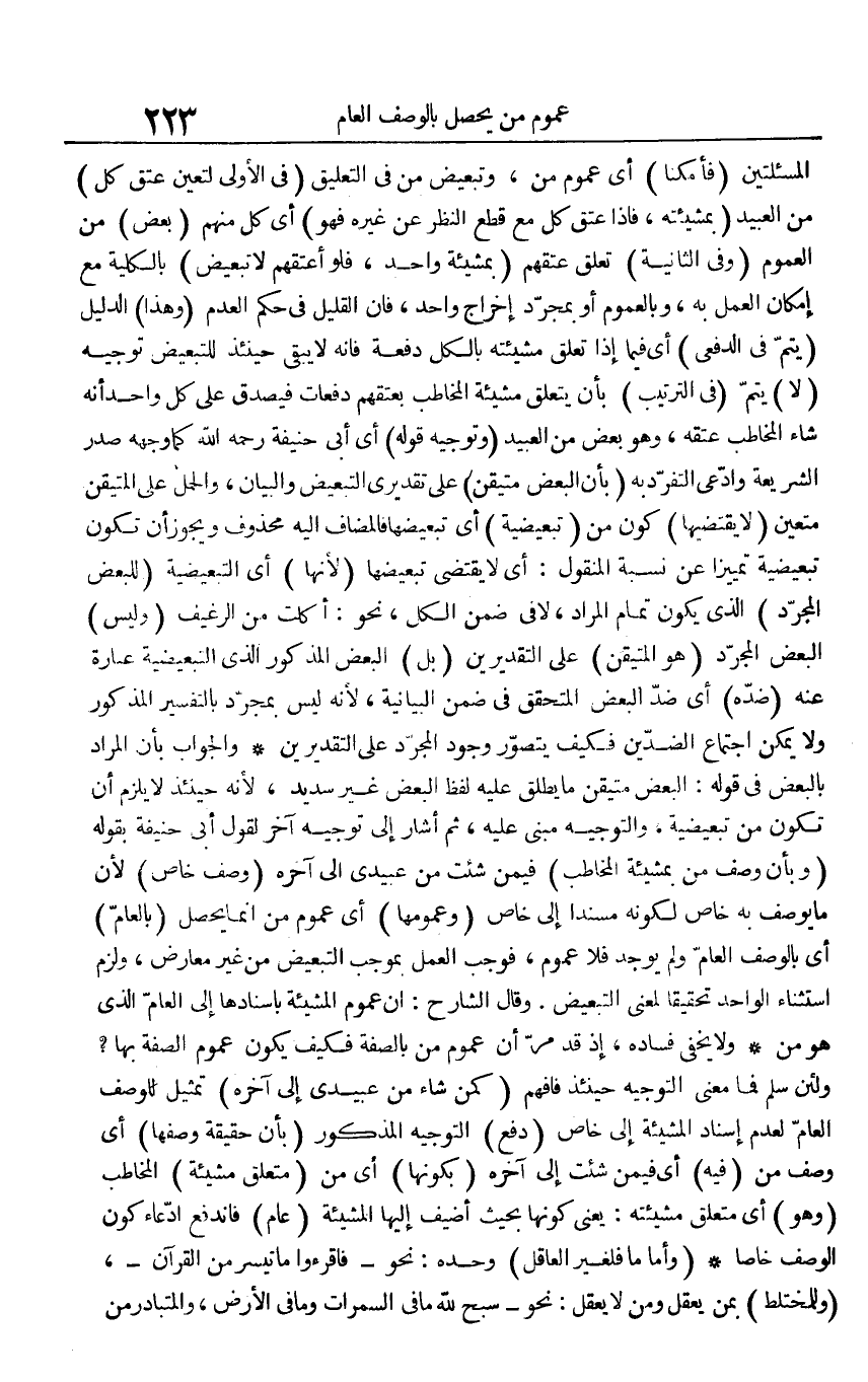 المسئلتين (فأمكنا) أَي عُمُوم من، وتبعيض من فِي التَّعْلِيق (فِي الأولى لتعين عتق كل) من العبيد (بمشيئته، فَإِذا عتق كل مَعَ قطع النّظر عَن غَيره فَهُوَ) أَي كل مِنْهُم (بعض) من الْعُمُوم (وَفِي الثَّانِيَة) تعلق عتقهم (بِمَشِيئَة وَاحِد، فَلَو أعتقهم لَا تبعيض) بِالْكُلِّيَّةِ مَعَ إِمْكَان الْعَمَل بِهِ، وبالعموم أَو بِمُجَرَّد إِخْرَاج وَاحِد، فَإِن الْقَلِيل فِي حكم الْعَدَم (وَهَذَا) الدَّلِيل (يتم فِي الدفعى) أَي فِيمَا إِذا تعلق مَشِيئَته بِالْكُلِّ دفْعَة فَإِنَّهُ لَا يبْقى حِينَئِذٍ للتَّبْعِيض تَوْجِيه (لَا) يتم (فِي التَّرْتِيب) بِأَن يتَعَلَّق مَشِيئَة الْمُخَاطب بعتقهم دفعات فَيصدق على كل وَاحِد أَنه شَاءَ الْمُخَاطب عتقه، وَهُوَ بعض من العبيد (وتوجيه قَوْله) أَي أبي حنيفَة رَحمَه الله كَمَا وَجهه صدر الشَّرِيعَة وَادّعى التفرد بِهِ (بِأَن الْبَعْض مُتَيَقن) على تقديري التَّبْعِيض وَالْبَيَان، وَالْحمل على الْمُتَيَقن مُتَعَيّن (لَا يقتضيها) كَون من (تبعيضية) أَي تبعيضها فالمضاف إِلَيْهِ مَحْذُوف وَيجوز أَن تكون تبعيضية تمييزا عَن نِسْبَة الْمَنْقُول: أَي لَا يقتضى تبعيضها (لِأَنَّهَا) أَي التبعيضية (للْبَعْض الْمُجَرّد) الَّذِي يكون تَمام المُرَاد، لَا فِي ضمن الْكل، نَحْو: أكلت من الرَّغِيف (وَلَيْسَ) الْبَعْض الْمُجَرّد (هُوَ الْمُتَيَقن) على التَّقْدِيرَيْنِ (بل) الْبَعْض الْمَذْكُور الَّذِي التبعيضية عبارَة عَنهُ (ضِدّه) أَي ضد الْبَعْض المتحقق فِي ضمن البيانية، لِأَنَّهُ لَيْسَ بِمُجَرَّد بالتفسير الْمَذْكُور وَلَا يُمكن اجْتِمَاع الضدين فَكيف يتَصَوَّر وجود الْمُجَرّد على التَّقْدِيرَيْنِ وَالْجَوَاب بِأَن المُرَاد بِالْبَعْضِ فِي قَوْله: الْبَعْض مُتَيَقن مَا يُطلق عَلَيْهِ لفظ الْبَعْض غير سديد، لِأَنَّهُ حِينَئِذٍ لَا يلْزم أَن تكون من تبعيضية، والتوجيه مَبْنِيّ عَلَيْهِ، ثمَّ أَشَارَ إِلَى تَوْجِيه آخر لقَوْل أبي حنيفَة بقوله (وَبِأَن وصف من بِمَشِيئَة الْمُخَاطب) فِيمَن شِئْت من عَبِيدِي إِلَى آخِره (وصف خَاص) لِأَن مَا يُوصف بِهِ خَاص لكَونه مُسْندًا إِلَى خَاص (وعمومها) أَي عُمُوم من إِنَّمَا يحصل (بِالْعَام) أَي بِالْوَصْفِ الْعَام وَلم يُوجد فَلَا عُمُوم، فَوَجَبَ الْعَمَل بِمُوجب التَّبْعِيض من غير معَارض، وَلزِمَ اسْتثِْنَاء الْوَاحِد تَحْقِيقا لِمَعْنى التَّبْعِيض. وَقَالَ الشَّارِح: أَن عُمُوم الْمَشِيئَة بإسنادها إِلَى الْعَام الَّذِي هُوَ من وَلَا يخفى فَسَاده، إِذْ قد مر أَن عُمُوم من بِالصّفةِ فَكيف يكون عُمُوم الصّفة بهَا؟ وَلَئِن سلم فَمَا معنى التَّوْجِيه حِينَئِذٍ فَافْهَم (كمن شَاءَ من عَبِيدِي إِلَى آخِره) تَمْثِيل للوصف الْعَام لعدم إِسْنَاد الْمَشِيئَة إِلَى خَاص (دفع) التَّوْجِيه الْمَذْكُور (بِأَن حَقِيقَة وصفهَا) أَي وصف من (فِيهِ) أَي فِيمَن شِئْت إِلَى آخِره (بِكَوْنِهَا) أَي من (مُتَعَلق مَشِيئَة) الْمُخَاطب (وَهُوَ) أَي مُتَعَلق مَشِيئَته: يَعْنِي كَونهَا بِحَيْثُ أضيف إِلَيْهَا الْمَشِيئَة (عَام) فَانْدفع ادِّعَاء كَون الْوَصْف خَاصّا (وَأما مَا فلغير الْعَاقِل) وَحده: نَحْو - {فاقرءوا مَا تيَسّر من الْقُرْآن} -، (وللمختلط) بِمن يعقل وَمن لَا يعقل: نَحْو - {سبح لله مَا فِي السَّمَاوَات وَمَا فِي الأَرْض}، والمتبادر من