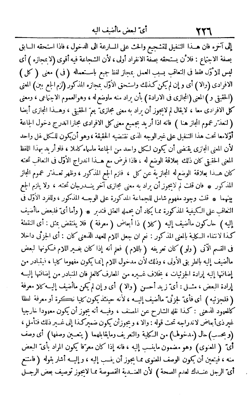 إِلَى آخِره فَإِن هَذَا التَّنْفِيل للتشجيع والحث على المسارعة إِلَى الدُّخُول، فَإِذا اسْتَحَقَّه السَّابِق بِصفة الِاجْتِمَاع: فَلِأَن يسْتَحقّهُ بِصفة الِانْفِرَاد أولى، لِأَن الشجَاعَة فِيهِ أقوى (لَا بمجازه) أَي لَيْسَ للْأولِ فَقَط فِي التَّعَاقُب بِسَبَب الْعَمَل بمجاز لفظ جَمِيع اسْتِعْمَاله (فِي) معنى (كل) الإفرادي (وَإِلَّا) أَي وَإِن لم يكن كَذَلِك وَاسْتحق الأول بمجازه الْمَذْكُور (لزم الْجمع بَين) الْمَعْنى (الْحَقِيقِيّ و) الْمَعْنى (الْمجَازِي فِي الْإِرَادَة) بِأَن يُرَاد مِنْهُ مَا وضع لَهُ، وَهُوَ الْعُمُوم الاجتماعي، وَمعنى كل الإفرادي مَعًا، لَا يُقَال لم لَا يجوز أَن يُرَاد لَهُ معنى مجازي يعم الْحَقِيقِيّ، وَهَذَا الْمجَازِي أَيْضا (لتعذر عُمُوم الْمجَاز هُنَا) فَإِنَّهُ إِذا أُرِيد بِجَمِيعِ معنى كل الإفرادي مجَازًا اندرج دُخُول الْجَمَاعَة أَولا مَعًا تَحت هَذَا التَّنْفِيل على غير الْوَجْه الَّذِي تَقْتَضِيه الْحَقِيقَة، وَهُوَ أَن يكون للْكُلّ نفل وَاحِد لِأَن الْمَعْنى الْمجَازِي يَقْتَضِي أَن يكون لكل وَاحِد من الْجَمَاعَة مَا سَمَّاهُ كَامِلا، فَلَو أُرِيد بِهَذَا اللَّفْظ الْمَعْنى الْحَقِيقِيّ كَانَ ذَلِك بعلاقة الْوَضع لَهُ، فَإِذا فرض مَعَ هَذَا اندراج الأول فِي التَّعَاقُب تَحْتَهُ كَانَ هَذَا بعلاقة الْوَضع لَهُ المجازية عَن كل، فَلَزِمَ الْجمع الْمَذْكُور، وَظهر تعذر عُمُوم الْمجَاز الْمَذْكُور فَإِن قلت لم لَا يجوز أَن يُرَاد بِهِ معنى مجازي آخر يندرجان تَحْتَهُ، وَلَا يلْزم الْجمع بَينهمَا قلت وجود مَفْهُوم شَامِل للْجَمَاعَة الْمَذْكُورَة على الْوَجْه الْمَذْكُور، وللفرد الأول فِي التَّعَاقُب على الْكَيْفِيَّة الْمَذْكُورَة مِمَّا يكَاد أَن يحملهُ الْعقل فَتدبر (وَأما أَي فلبعض مَا أضيف إِلَيْهِ) حَال كَون مَا أضيف إِلَيْهِ (كلا) ذَا أبعاض (معرفَة) فَلَا ينْتَقض بِمثل: أَي النقطة كَذَا الانتفاء الْكُلية بِالْمَعْنَى الْمَذْكُور: نعم إِن جعل اللَّام للْعهد الذهْنِي كَانَ: أَي الجزئي دَاخِلا فِي الْقسم الْآتِي (وَلَو) كَانَ تَعْرِيفه (بِاللَّامِ) فَعلم أَنه إِذا كَانَ بِغَيْر اللَّام فكونها لبَعض مَا أضيف إِلَيْهِ بِالطَّرِيقِ الأولى، وَذَلِكَ لِأَن مَدْخُول اللَّام إِنَّمَا يكون مفهوما كليا، فيتبادر من إضافتها إِلَيْهِ إِرَادَة الجزئيات، بِخِلَاف غَيره من المعارف كَالْعلمِ فَإِن الْمُتَبَادر من إضافتها إِلَيْهِ إِرَادَة الْبَعْض، مثل: أَي زيد أحسن (وَإِلَّا) أَي وَإِن لم يكن مَا أضيف إِلَيْهِ كلا معرفَة (فلجزئيه) أَي فَأَي لجزئي مَا أضيف إِلَيْهِ، لِأَنَّهُ حِينَئِذٍ يكون كليا نكرَة أَو معرفَة لفظا كالمعهود الذهْنِي: كَذَا نَقله الشَّارِح عَن المُصَنّف، وَفِيه أَنه يجوز أَن يكون معهودا خارجيا غير ذِي أبعاض لاندراجه تَحت قَوْله: وَإِلَّا، وَيجوز أَن يكون ضمير كَذَا إِلَى غير ذَلِك فَتَأمل، (وبحسب) حَال (مدخولها) من الْكُلية والتعريف وَمَا يقابلهما (يتَعَيَّن وصفهَا) أَي وصف أَي (الْمَعْنَوِيّ) وَهُوَ مَضْمُون مَا ينْسب إِلَيْهِ، فَإِنَّهُ إِذا كَانَ مُعَرفا يكون المُرَاد بِأَيّ الْبَعْض مِنْهُ، فَيتَعَيَّن أَن يكون الْوَصْف الْمَعْنَوِيّ مِمَّا يجوز أَن ينْسب إِلَيْهِ، وَإِلَيْهِ أَشَارَ بقوله (فَامْتنعَ أَي الرجل عنْدك لعدم الصِّحَّة) لِأَن العندية الْمَخْصُوصَة مِمَّا لَا يجوز توصيف بعض الرجل