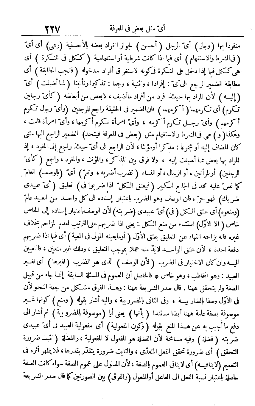 مُنْفَردا بهَا (وَجَاز) أَي الرجل (أحسن) لجَوَاز انْفِرَاد بعضه بالأحسنية (وَهِي) أَي أَي (فِي الشَّرْط والاستفهام) أَي فِيمَا إِذا كَانَت شَرْطِيَّة أَو استفهامية (ككل فِي النكرَة) أَي هِيَ ككل فِيمَا إِذا دخل على النكرَة فِي كَونه لاستغراق أَفْرَاد مدخوله (فَتجب الْمُطَابقَة) أَي مُطَابقَة الضَّمِير الرَّاجِع إِلَى أَي: إفرادا، وتثنية، وجمعا: تذكيرا وتأنيثا (لما أضيفت) أَي (إِلَيْهِ) لِأَن المُرَاد بهَا حِينَئِذٍ فَرد من أَفْرَاد مَا أضيف، لَا بعض من أَبْعَاضه (كأي رجلَيْنِ تكرم) أَي تكرمهما (أكرمهما) فَإِن الضَّمِير فِي الْحَقِيقَة رَاجع للرجلين (وَأي رجال تكرم أكْرمهم) وَأي رجل تكرم أكْرمه، وَأي امْرَأَة تكرم أكرمها، وَأي امْرَأَة قَامَت، وَهَكَذَا (و) هِيَ فِي الشَّرْط والاستفهام مثل (بعض فِي الْمعرفَة فيتحد) الضَّمِير الرَّاجِع إِلَيْهَا مثنى كَانَ الْمُضَاف إِلَيْهِ أَو مجموعا: مذكرا أَو مؤنثا، لِأَن الرَّاجِع إِلَى أَي حِينَئِذٍ رَاجع إِلَى الْمُفْرد، إِذْ المُرَاد بهَا بعض مِمَّا أضيف إِلَيْهِ، وَلَا فرق بَين الْمُذكر، والمؤنث، والمفرد، وَالْجمع (كأي الرجلَيْن) أَو الْمَرْأَتَيْنِ، أَو الرِّجَال، أَو النِّسَاء (تضرب أضربه، وتعم) أَي (بِالْوَصْفِ) الْعَام كَمَا نَص عَلَيْهِ مُحَمَّد فِي الْجَامِع الْكَبِير (فَيعتق الْكل إِذا ضربوا فِي) تَعْلِيق (أَي عَبِيدِي ضربك) فَهُوَ حر، فَإِن الْوَصْف وَهُوَ الضَّرْب بِاعْتِبَار إِسْنَاده إِلَى كل وَاحِد من العبيد عَام (ومنعوه) أَي عتق الْكل (فِي) أَي عَبِيدِي (ضَربته) لِأَن الْوَصْف بِاعْتِبَار إِسْنَاده إِلَى الْخَاص خَاص (إِلَّا الأول) اسْتثِْنَاء من منع الْكل: يَعْنِي إِذا ضَربهمْ على التَّرْتِيب لعدم المزاحم بِخِلَاف غَيره فَإِنَّهُ يزاحمه انْتِهَاء عَن التَّعْلِيق بِعِتْق الأول (أَو مَا يُعينهُ الْمولى فِي الْمَعِيَّة) أَي فِيمَا إِذا ضَربهمْ دفْعَة وَاحِدَة، لِأَن عتق الْوَاحِد لَا بُد مِنْهُ عملا بِمُوجب التَّعْلِيق، وَذَلِكَ غير مُتَعَيّن، فالتعيين إِلَيْهِ وَإِن كَانَ الِاخْتِيَار فِي الضَّرْب (لِأَن الْوَصْف) الَّذِي هُوَ الضَّرْب (لغَيْرهَا) أَي لغير العبيد: وَهُوَ الْمُخَاطب، وَهُوَ خَاص فَالْحَاصِل أَن الْعُمُوم فِي المسئلة السَّابِقَة إِنَّمَا جَاءَ من قبيل الصّفة وَلم يتَحَقَّق هَهُنَا. قَالَ صدر الشَّرِيعَة هَهُنَا: وَهَذَا الْفرق مُشكل من جِهَة النَّحْو لِأَن فِي الأول وَصفا بالضاربية، وَفِي الثَّانِي بالمضروبية، وَإِلَيْهِ أَشَارَ بقوله (وَمنع) كَونهَا غير مَوْصُوفَة بِصفة عَامَّة هَهُنَا أَيْضا مُسْتَندا (بِأَنَّهَا) يَعْنِي أيا (مَوْصُوفَة بالمضروبية) ثمَّ أَشَارَ إِلَى دفع مَا أُجِيب بِهِ عَن هَذَا الْمَنْع بقوله (وَكَون المفعولية) أَي مفعولية العبيد فِي أَي عَبِيدِي ضَربته (فضلَة) وَفِيه مُسَامَحَة لِأَن الفضلة هُوَ الْمَفْعُول لَا المفعولية، والفضلة (تثبت ضَرُورَة التحقق) أَي ضَرُورَة تحقق الْفِعْل الْمُتَعَدِّي، وَالثَّابِت ضَرُورَة يتَقَدَّر بِقَدرِهَا، فَلَا يظْهر أَثَره فِي التَّعْمِيم (لَا يُنَافِيهِ) أَي لَا يُنَافِي الْعُمُوم بِالصّفةِ، لِأَن الْمَدْلُول على عُمُوم الصّفة سَوَاء كَانَت الصّفة حَاصِلَة بِاعْتِبَار نِسْبَة الْفِعْل إِلَى الْفَاعِل أَو الْمَفْعُول (وَالْفرق) بَين الصُّورَتَيْنِ كَمَا قَالَ صدر الشَّرِيعَة