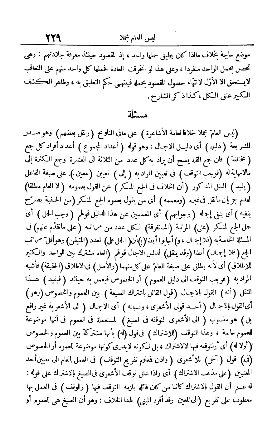 (لَيْسَ الْعَام مُجملا خلافًا لعامة الأشاعرة) على مَا فِي التَّلْوِيح (وَنقل بَعضهم) وَهُوَ صدر الشَّرِيعَة (دَلِيله) أَي دَلِيل الْإِجْمَال: وَهُوَ قَوْله (أعداد الْمَجْمُوع) أعداد أَفْرَاد كل جمع (مُخْتَلفَة) فَإِن جمع الْقلَّة يَصح أَن يُرَاد بِهِ كل عدد من الثَّلَاثَة إِلَى الْعشْرَة وَجمع الْكَثْرَة إِلَى مَا لَا نِهَايَة لَهُ (فَوَجَبَ التَّوَقُّف) فِي تعْيين المُرَاد بِهِ (إِلَى) تعْيين (معِين) على صِيغَة الْفَاعِل (يُفِيد) النَّقْل الْمَذْكُور (أَن الْخلاف فِي الْجمع الْمُنكر) عَن القَوْل بِعُمُومِهِ (لَا الْعَام مُطلقًا) لعدم جَرَيَان مَا نقل فِي غَيره (ومعممه) أَي من يَقُول بِعُمُوم الْجمع الْمُنكر (من الْحَنَفِيَّة يُصَرح بنفيه) أَي بِنَفْي إجماله (وجوابهم) أَي المعممين عَن هَذَا الدَّلِيل قَوْلهم (وَجب الْحمل) أَي حمل الْجمع الْمُنكر (على) الْمرتبَة (المستغرقة) لكل عدد من مراتبه (على مَا تقدم عَنْهُم) فِي المسئلة الْخَاصَّة بِهِ (فَلَا إِجْمَال، و) أجابوا أَيْضا (ب) أَن (الْحمل على) الْعدَد (الْمُتَيَقن) وَهُوَ أقل مَرَاتِب الْجمع (فَلَا إِجْمَال) أَيْضا (وَقد ينْقل) لدَلِيل الْإِجْمَال قَوْلهم (الْعَام مُشْتَرك بَين الْوَاحِد وَالْكثير للإطلاق) أَي لِأَنَّهُ يُطلق على صِيغَة الْعَام على كل مِنْهُمَا (وَالْأَصْل) فِي الْإِطْلَاق (الْحَقِيقَة) فَأشبه المُرَاد بِهِ (فَوَجَبَ التَّوَقُّف إِلَى دَلِيل الْعُمُوم) أَو الْخُصُوص فَيعْمل بِهِ حِينَئِذٍ (فَيُفِيد) هَذَا النَّقْل (أَنه) القَوْل بالإجمال (قَول الْقَائِل باشتراك الصِّيغَة) بَين الْعُمُوم وَالْخُصُوص (وَهُوَ) أَي القَوْل بالإجمال (أحد قولي الْأَشْعَرِيّ، ونسبته) أَي الْإِجْمَال (إِلَى الأشعرية غير وَاقع بل) هُوَ مَنْسُوب (إِلَى الْأَشْعَرِيّ لتوقفه فِي الصِّيَغ) المستعملة فِي الْعُمُوم فِي أَنَّهَا مَوْضُوعَة للْعُمُوم خَاصَّة، وَهَذَا التَّوَقُّف (للاشتراك) فِي قَول (لَهُ) بِأَنَّهَا مُشْتَركَة بَين الْعُمُوم وَالْخُصُوص (أَو لَا لَهُ) أَي أَو لتوقفه فِيهَا لَا لاشتراك، بل لكَونه لَا يدْرِي كَونهَا مَوْضُوعَة للْعُمُوم أَو الْخُصُوص (فِي) قَول (آخر) للأشعري (وَإِذن فمعلوم تَفْرِيع التَّوَقُّف) فِي الْعَمَل بِالْعَام إِلَى تعْيين أحد الْمَعْنيين (على مَذْهَب الِاشْتِرَاك) أَي وَإِذا علل توقف الْأَشْعَرِيّ فِي الصِّيَغ بالاشتراك على قَوْله: لَهُ علم أَن القَوْل بالاشتراك كَائِنا من كَانَ قَائِله يلْزمه التَّوَقُّف فِيهَا (وَالْوَقْف) فِي الْعَمَل بهَا مَعْطُوف على تَفْرِيع (إِلَى الْمعِين وَقد أفرد الْمَبْنِيّ) لهَذَا الْخلاف: وَهُوَ أَن الصِّيَغ هِيَ للْعُمُوم أَو