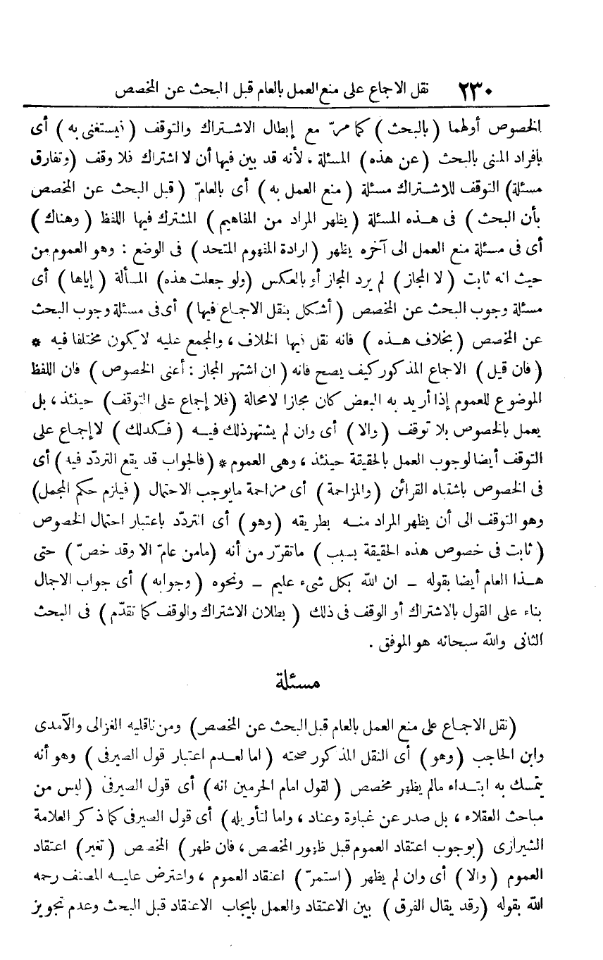 الْخُصُوص أَولهمَا (بالبحث) كَمَا مر مَعَ إبِْطَال الِاشْتِرَاك والتوقف (فيستغني بِهِ) أَي بإفراد الْمَبْنِيّ بالبحث (عَن هَذِه) المسئلة، لِأَنَّهُ قد بَين فِيهَا أَن لَا اشْتِرَاك فَلَا وقف (وتفارق مسئلة) التَّوَقُّف للاشتراك مسئلة (منع الْعَمَل بِهِ) أَي بالعالم (قبل الْبَحْث عَن الْمُخَصّص بِأَن الْبَحْث) فِي هَذِه المسئلة (يظْهر المُرَاد من المفاهيم) الْمُشْتَرك فِيهَا اللَّفْظ (وَهُنَاكَ) أَي فِي مسئلة منع الْعَمَل إِلَى آخِره يظْهر (إِرَادَة الْمَفْهُوم المتحد) فِي الْوَضع: وَهُوَ الْعُمُوم من حَيْثُ أَنه ثَابت (لَا الْمجَاز) لم يرد الْمجَاز أَو بِالْعَكْسِ (وَلَو جعلت هَذِه) الْمَسْأَلَة (إِيَّاهَا) أَي مسئلة وجوب الْبَحْث عَن الْمُخَصّص (أشكل بِنَقْل الْإِجْمَاع فِيهَا) أَي فِي مسئلة وجوب الْبَحْث عَن الْمُخَصّص (بِخِلَاف هَذِه) فَإِنَّهُ نقل فِيهَا الْخلاف، وَالْمجْمَع عَلَيْهِ لَا يكون مُخْتَلفا فِيهِ (فَإِن قيل) الْإِجْمَاع الْمَذْكُور كَيفَ يَصح فَإِنَّهُ (إِن اشْتهر الْمجَاز: أَعنِي الْخُصُوص) فَإِن اللَّفْظ الْمَوْضُوع للْعُمُوم إِذا أُرِيد بِهِ الْبَعْض كَانَ مجَازًا لَا محَالة (فَلَا إِجْمَاع على التَّوَقُّف) حِينَئِذٍ، بل يعْمل بالخصوص بِلَا توقف (وَإِلَّا) أَي وَإِن لم يشْتَهر ذَلِك فِيهِ (فَكَذَلِك) لَا إِجْمَاع على التَّوَقُّف أَيْضا لوُجُوب الْعَمَل بِالْحَقِيقَةِ حِينَئِذٍ، وَهِي الْعُمُوم (فَالْجَوَاب قد يَقع التَّرَدُّد فِيهِ) أَي فِي الْخُصُوص باشتباه الْقَرَائِن (والمزاحمة) أَي مزاحمة مَا يُوجب الِاحْتِمَال (فَيلْزم حكم الْمُجْمل) وَهُوَ التَّوَقُّف إِلَى أَن يظْهر المُرَاد مِنْهُ بطريقه (وَهُوَ) أَي التَّرَدُّد بِاعْتِبَار احْتِمَال الْخُصُوص (ثَابت فِي خُصُوص هَذِه الْحَقِيقَة بِسَبَب) مَا تقرر من أَنه (مَا من عَام إِلَّا وَقد خص) حَتَّى هَذَا الْعَام أَيْضا بقوله - {إِن الله بِكُل شَيْء عليم} - وَنَحْوه (وَجَوَابه) أَي جَوَاب الْإِجْمَال بِنَاء على القَوْل بالاشتراك أَو الْوَقْف فِي ذَلِك (بطلَان الِاشْتِرَاك وَالْوَقْف كَمَا تقدم) فِي الْبَحْث الثَّانِي وَالله سُبْحَانَهُ هُوَ الْمُوفق.