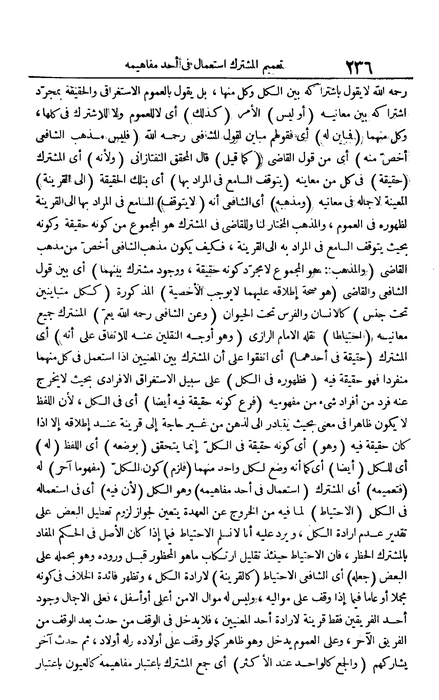 رَحمَه الله لَا يَقُول باشتراكه بَين الْكل وكل مِنْهَا، بل يَقُول بِالْعُمُومِ الاستغراقي والحقيقة بِمُجَرَّد اشتراكه بَين مَعَانِيه (أَو لَيْسَ) الْأَمر (كَذَلِك) أَي لَا الْعُمُوم وَلَا للاشتراك فِي كلهَا، وكل مِنْهُمَا (فمباين لَهُ) أَي فَقَوْلهم مباين لقَوْل الشَّافِعِي رَحمَه الله (فَلَيْسَ مَذْهَب الشَّافِعِي أخص مِنْهُ) أَي من قَول القَاضِي (كَمَا قيل) قَالَ الْمُحَقق التَّفْتَازَانِيّ (وَلِأَنَّهُ) أَي الْمُشْتَرك (حَقِيقَة) فِي كل من مَعَانِيه (يتَوَقَّف السَّامع فِي المُرَاد بهَا) أَي بِتِلْكَ الْحَقِيقَة (إِلَى الْقَرِينَة) الْمعينَة لإجماله فِي مَعَانِيه (ومذهبه) أَي الشَّافِعِي أَنه (لَا يتَوَقَّف) السَّامع فِي المُرَاد بهَا إِلَى الْقَرِينَة لظُهُوره فِي الْعُمُوم، وَالْمذهب الْمُخْتَار لنا وللقاضي فِي الْمُشْتَرك هُوَ الْمَجْمُوع من كَونه حَقِيقَة وَكَونه بِحَيْثُ يتَوَقَّف السَّامع فِي المُرَاد بِهِ إِلَى الْقَرِينَة، فَكيف يكون مَذْهَب الشَّافِعِي أخص من مَذْهَب القَاضِي (وَالْمذهب: هُوَ الْمَجْمُوع لَا مُجَرّد كَونه حَقِيقَة، وَوُجُود مُشْتَرك بَينهمَا) أَي بَين قَول الشَّافِعِي وَالْقَاضِي (هُوَ صِحَة إِطْلَاقه عَلَيْهِمَا لَا يُوجب الأخصية) الْمَذْكُورَة (ككل متباينين تَحت جنس) كالإنسان وَالْفرس تَحت الْحَيَوَان (وَعَن الشَّافِعِي رَحمَه الله يعم) الْمُشْتَرك جَمِيع مَعَانِيه (احْتِيَاطًا) نَقله الإِمَام الرَّازِيّ (وَهُوَ أوجه النقلين عَنهُ للاتفاق على أَنه) أَي الْمُشْتَرك (حَقِيقَة فِي أَحدهمَا) أَي اتَّفقُوا على أَن الْمُشْتَرك بَين الْمَعْنيين إِذا اسْتعْمل فِي كل مِنْهُمَا مُنْفَردا فَهُوَ حَقِيقَة فِيهِ (فظهوره فِي الْكل) على سَبِيل الِاسْتِغْرَاق الإفرادي بِحَيْثُ لَا يخرج عَنهُ فَرد من أَفْرَاد شَيْء من مفهوميه (فرع كَونه حَقِيقَة فِيهِ أَيْضا) أَي فِي الْكل، لِأَن اللَّفْظ لَا يكون ظَاهرا فِي معنى بِحَيْثُ يتَبَادَر إِلَى لذهن من غير حَاجَة إِلَى قرينَة عِنْد إِطْلَاقه، إِلَّا إِذا كَانَ حَقِيقَة فِيهِ (وَهُوَ) أَي كَونه حَقِيقَة فِي الْكل إِنَّمَا يتَحَقَّق (بِوَضْعِهِ) أَي اللَّفْظ (لَهُ) أَي للْكُلّ (أَيْضا) أَي كَمَا أَنه وضع لكل وَاحِد مِنْهُمَا (فَلَزِمَ) كَون الْكل (مفهوما آخر) لَهُ (فتعميمه) أَي الْمُشْتَرك (اسْتِعْمَال فِي أحد مفاهيمه) وَهُوَ الْكل (لِأَن فِيهِ) أَي فِي اسْتِعْمَاله فِي الْكل (الِاحْتِيَاط) لما فِيهِ من الْخُرُوج عَن الْعهْدَة يتَعَيَّن لجَوَاز لُزُوم تَعْطِيل الْبَعْض على تَقْدِير عدم إِرَادَة الْكل، وَيرد عَلَيْهِ أَنا لَا نسلم الِاحْتِيَاط فِيمَا إِذا كَانَ الأَصْل فِي الحكم المفاد بالمشترك الْحَظْر، فَإِن الِاحْتِيَاط حِينَئِذٍ تقليل ارْتِكَاب مَا هُوَ الْمَحْظُور قبل وُرُوده وَهُوَ بِحمْلِهِ على الْبَعْض (جعله) أَي الشَّافِعِي الِاحْتِيَاط (كالقرينة) لإِرَادَة الْكل، وَتظهر فَائِدَة الْخلاف فِي كَونه مُجملا أَو عَاما فِيمَا إِذا وقف على موَالِيه، وَلَيْسَ لَهُ موَالٍ إِلَّا من أَعلَى أَو أَسْفَل، فعلى الْإِجْمَال وجود أحد الْفَرِيقَيْنِ فَقَط قرينَة لإِرَادَة أحد الْمَعْنيين، فَلَا يدْخل فِي الْوَقْف من حدث بعد الْوَقْف من الْفَرِيق الآخر، وعَلى الْعُمُوم يدْخل وَهُوَ ظَاهر كَمَا لَو وقف على أَوْلَاده وَله أَوْلَاد، ثمَّ حدث آخر يشاركهم (وَالْجمع كالواحد عِنْد الْأَكْثَر) أَي جمع الْمُشْتَرك بِاعْتِبَار مفاهيمه كالعيون بِاعْتِبَار