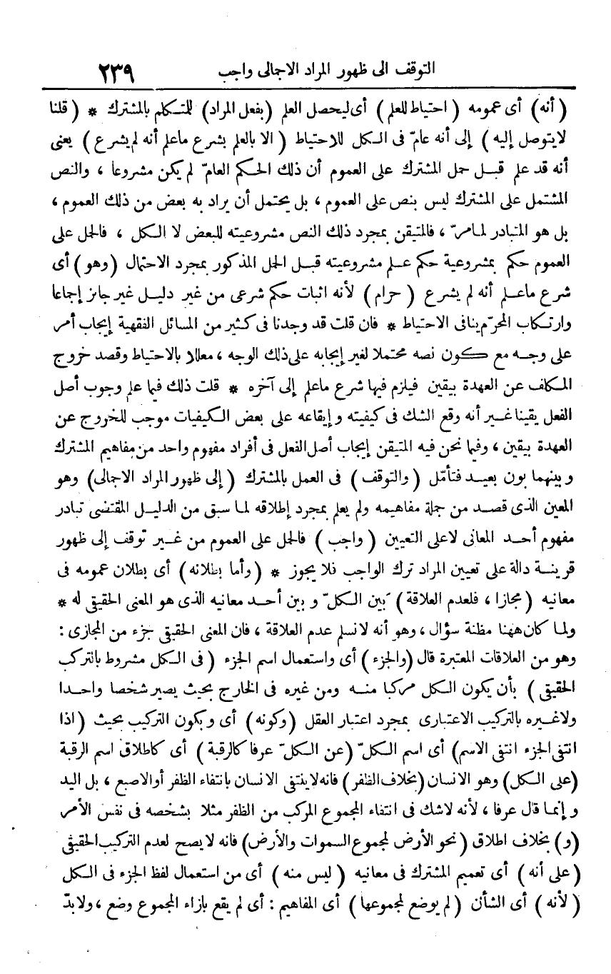 (أَنه) أَي عُمُومه (احْتِيَاط للْعلم) أَي ليحصل الْعلم (بِفعل المُرَاد) للمتكلم بالمشترك (قُلْنَا لَا يتَوَصَّل إِلَيْهِ) إِلَى أَنه عَام فِي الْكل للِاحْتِيَاط (أَلا بِالْعلمِ بشرع مَا علم أَنه لم يشرع) يَعْنِي أَنه قد علم قبل حمل الْمُشْتَرك على الْعُمُوم أَن ذَلِك الحكم الْعَام لم يكن مَشْرُوعا، وَالنَّص الْمُشْتَمل على الْمُشْتَرك لَيْسَ بِنَصّ على الْعُمُوم، بل يحْتَمل أَن يُرَاد بِهِ بعض من ذَلِك الْعُمُوم، بل هُوَ الْمُتَبَادر لما مر، فالمتيقن بِمُجَرَّد ذَلِك النَّص مشروعيته للْبَعْض لَا الْكل، فالحمل على الْعُمُوم حكم بمشروعية حكم علم مشروعيته قبل الْحمل الْمَذْكُور بِمُجَرَّد الِاحْتِمَال (وَهُوَ) أَي شرع مَا علم أَنه لم يشرع (حرَام) لِأَنَّهُ إِثْبَات حكم شَرْعِي من غير دَلِيل غير جَائِز إِجْمَاعًا وارتكاب الْمحرم يُنَافِي الِاحْتِيَاط فَإِن قلت قد وجدنَا فِي كثير من الْمسَائِل الْفِقْهِيَّة إِيجَاب أَمر على وَجه مَعَ كَون نَصه مُحْتملا لغير إِيجَابه على ذَلِك الْوَجْه، مُعَللا بِالِاحْتِيَاطِ وَقصد خُرُوج الْمُكَلف عَن الْعهْدَة بِيَقِين فَيلْزم فِيهَا شرع مَا علم إِلَى آخِره قلت ذَلِك فِيمَا علم وجوب أصل الْفِعْل يَقِينا غير أَنه وَقع الشَّك فِي كيفيته وإيقاعه على بعض الكيفيات مُوجب لِلْخُرُوجِ عَن الْعهْدَة بِيَقِين، وَفِيمَا نَحن فِيهِ الْمُتَيَقن إِيجَاب أصل الْفِعْل فِي أَفْرَاد مَفْهُوم وَاحِد من مفاهيم الْمُشْتَرك وَبَينهمَا بون بعيد فَتَأمل (والتوقف) فِي الْعَمَل بالمشترك (إِلَى ظُهُور المُرَاد الإجمالي) وَهُوَ الْمعِين الَّذِي قصد من جملَة مفاهيمه وَلم يعلم بِمُجَرَّد إِطْلَاقه لما سبق من الدَّلِيل الْمُقْتَضى تبادر مَفْهُوم أحد الْمعَانِي لَا على التَّعْيِين (وَاجِب) فالحمل على الْعُمُوم من غير توقف إِلَى ظُهُور قرينَة دَالَّة على تعْيين المُرَاد ترك الْوَاجِب فَلَا يجوز (وَأما بُطْلَانه) أَي بطلَان عُمُومه فِي مَعَانِيه (مجَازًا، فلعدم العلاقة) بَين الْكل وَبَين أحد مَعَانِيه الَّذِي هُوَ الْمَعْنى الْحَقِيقِيّ لَهُ وَلما كَانَ هَهُنَا مَظَنَّة سُؤال، وَهُوَ أَنه لَا نسلم عدم العلاقة، فَإِن الْمَعْنى الْحَقِيقِيّ جُزْء من الْمجَازِي: وَهُوَ من العلاقات الْمُعْتَبرَة قَالَ (والجزء) أَي وَاسْتِعْمَال اسْم الْجُزْء (فِي الْكل مَشْرُوط بالتركب الْحَقِيقِيّ) بِأَن يكون الْكل مركبا مِنْهُ وَمن غَيره فِي الْخَارِج بِحَيْثُ يصير شخصا وَاحِدًا وَلَا غَيره بالتركيب الاعتباري بِمُجَرَّد اعْتِبَار الْعقل (وَكَونه) أَي وبكون التَّرْكِيب بِحَيْثُ (إِذا انْتَفَى الْجُزْء انْتَفَى الِاسْم) أَي اسْم الْكل (عَن الْكل عرفا كالرقبة) أَي كإطلاق اسْم الرَّقَبَة (على الْكل) وَهُوَ الْإِنْسَان (بِخِلَاف الظفر) فَإِنَّهُ لَا يَنْتَفِي الْإِنْسَان بِانْتِفَاء الظفر أَو الْأصْبع، بل الْيَد وَإِنَّمَا قَالَ عرفا، لِأَنَّهُ لَا شكّ فِي انْتِفَاء الْمَجْمُوع الْمركب من الظفر مثلا بشخصه فِي نفس الْأَمر (و) بِخِلَاف إِطْلَاق (نَحْو الأَرْض لمجموع السَّمَوَات وَالْأَرْض) فَإِنَّهُ لَا يَصح لعدم التَّرْكِيب الْحَقِيقِيّ (على أَنه) أَي تَعْمِيم الْمُشْتَرك فِي مَعَانِيه (لَيْسَ مِنْهُ) أَي من اسْتِعْمَال لفظ الْجُزْء فِي الْكل (لِأَنَّهُ) أَي الشَّأْن (لم يوضع لمجموعها) أَي المفاهيم: أَي لم يَقع بِإِزَاءِ الْمَجْمُوع وضع، وَلَا بُد