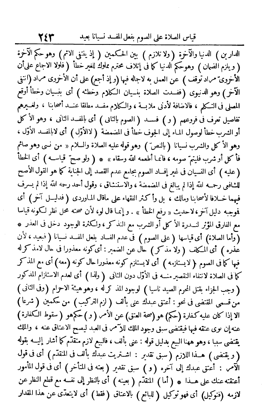 الدَّاريْنِ) الدُّنْيَا وَالْآخِرَة (وَلَا تلازم) بَين الْحكمَيْنِ (إِذْ ينتفى الْإِثْم) وَهُوَ حكم الْآخِرَة (وَيلْزم الضَّمَان) وَهُوَ حكم الدُّنْيَا كَمَا فِي إِتْلَاف مُحْتَرم مَمْلُوك للْغَيْر خطأ (فلولا الْإِجْمَاع على أَن الأخروي مُرَاد توقف) عَن الْعَمَل بِهِ لإجماله فِيهَا (وَإِذ أجمع) على أَن الأخروي مُرَاد (انْتَفَى الآخر) وَهُوَ الدنيوي (ففسدت الصَّلَاة بنسيان الْكَلَام وخطئه) أَي بنسيان وَخطأ أوقع الْمصلى فِي التَّكَلُّم، فالإضافة لأدنى مُلَابسَة، وَالْكَلَام مُفسد مُطلقًا عِنْد أَصْحَابنَا، ولغيرهم تفاصيل تعرف فِي فروعهم (و) فسد (الصَّوْم بِالثَّانِي) أَي بالمفسد الثَّانِي، وَهُوَ الْأكل أَو الشّرْب خطأ لوصول المَاء إِلَى الْجوف خطأ فِي الْمَضْمَضَة (لَا الأول) أَي لَا بالمفسد الأول، وَهُوَ الْأكل وَالشرب نِسْيَانا (بِالنَّصِّ) وَهُوَ قَوْله صلى الله عَلَيْهِ وَسلم " من نسى وَهُوَ صَائِم فَأكل أَو شرب فليتم صَوْمه، فَإِنَّمَا أطْعمهُ الله وسقاه " (وَلَو صَحَّ قِيَاسه) أَي الْخَطَأ (عَلَيْهِ) أَي النسْيَان فِي غير إِفْسَاد الصَّوْم بِجَامِع عدم الْقَصْد إِلَى الْجِنَايَة كَمَا هُوَ القَوْل الْأَصَح للشَّافِعِيّ رَحمَه الله إِذا لم يُبَالغ فِي الْمَضْمَضَة، وَالِاسْتِنْشَاق، وَقَول أَحْمد رَحمَه الله إِذا لم يسرف فيهمَا خلافًا لِأَصْحَابِنَا وَمَالك، بل وَأكْثر الْفُقَهَاء على مَا قَالَ الْمَاوَرْدِيّ (فدليل آخر) أَي فموجبه دَلِيل آخر، لَا حَدِيث " رفع الْخَطَأ ". وَإِنَّمَا قَالَ لَو، لِأَن صِحَّته مَحل نظر لكَونه قِيَاسا مَعَ الْفَارِق الْمُؤثر لندرة الْأكل اَوْ الشّرْب مَعَ التَّذَكُّر، ولكثرة الْوُجُود دخل فِي الْعذر (وَأما الصَّلَاة) أَي قياسها (على الصَّوْم) فِي عدم الْفساد بِفعل الْمُفْسد نِسْيَانا (فبعيد، لِأَن عذره) أَي الْمُكَلف (وَلَا مُذَكّر) حَال عَن الضَّمِير: أَي كَونه مَعْذُورًا فِي حَال لَا مُذَكّر لَهُ فِيهَا كَمَا فِي الصَّوْم (لَا يستلزمه) أَي لَا يسْتَلْزم كَونه مَعْذُورًا حَال كَونه (مَعَه) أَي مَعَ الْمُذكر كَمَا فِي الصَّلَاة لانْتِفَاء التَّقْصِير مِنْهُ فِي الأول دون الثَّانِي (وَلذَا) أَي لعدم الاستلزام الْمَذْكُور (وَجب الْجَزَاء بقتل الْمحرم الصَّيْد نَاسِيا) لوُجُود الْمُذكر لَهُ، وَهُوَ هَيْئَة الْإِحْرَام (وَفِي الثَّانِي) من قسمي الْمُقْتَضى فِي نَحْو: أعتق عَبدك عني بِأَلف (لزم التَّرْكِيب) من حكمين (شرعا) إِلَّا إِذا كَانَ عَلَيْهِ كَفَّارَة (حكم) هُوَ (صِحَة الْعتْق) عَن الْأَمر (و) حكم هُوَ (سُقُوط الْكَفَّارَة) عَنهُ إِن نوى عتقه فِيهَا فَيَقْتَضِي سبق وجود الْملك للْآمِر فِي العَبْد ليَصِح الاعتاق عَنهُ، وَالْملك يقتضى سَببا، وَهُوَ هَهُنَا البيع بِدَلِيل قَوْله: عني بِأَلف، فَالْبيع لَازم مُتَقَدم كَمَا أَشَارَ إِلَيْهِ بقوله (ويقتضى) هَذَا اللَّازِم (سبق تَقْدِير: اشْتريت عَبدك بِأَلف فِي الْمُتَقَدّم) أَي فِي قَول الْآمِر: أعتق عَبدك إِلَى آخِره (و) سبق تَقْدِير (بِعته فِي الْمُتَأَخر) أَي فِي قَول الْمَأْمُور أَعتَقته عَنْك على هَذَا (أما) الْمُتَقَدّم (بِعَيْنِه) أَي بِالنّظرِ إِلَى نَفسه مَعَ قطع النّظر عَن لَازمه (فتوكيل) أَي فَهُوَ تَوْكِيل (للْبَائِع) بالاعتاق (فَقَط) أَي لَا يتَعَدَّى عَن هَذَا الْمِقْدَار