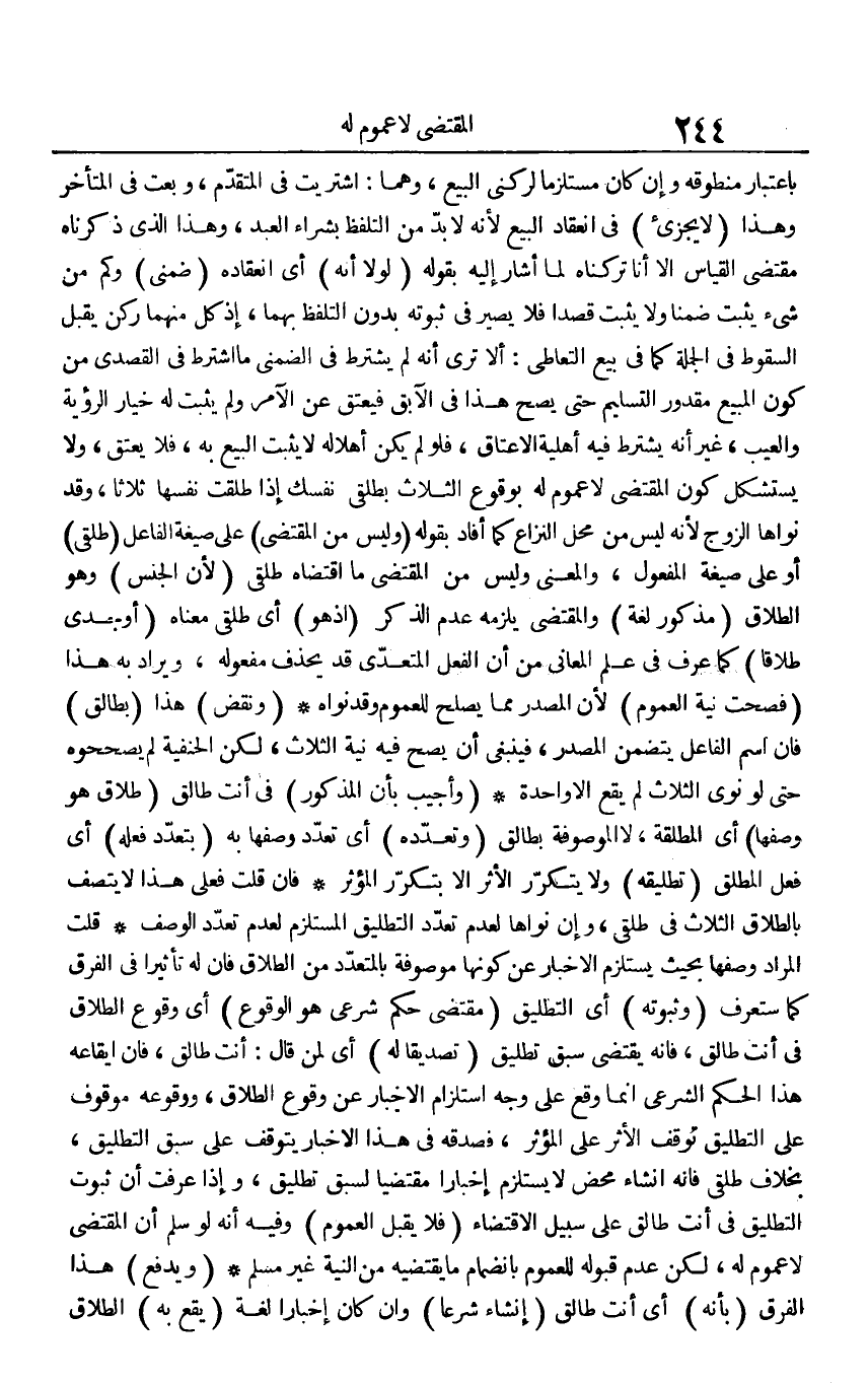 بِاعْتِبَار منطوقه وَإِن كَانَ مستلزما لركني البيع، وهما: اشْتريت فِي الْمُتَقَدّم، وبعت فِي الْمُتَأَخر وَهَذَا (لَا يُجزئ) فِي انْعِقَاد البيع لِأَنَّهُ لَا بُد من التَّلَفُّظ بشرَاء العَبْد، وَهَذَا الَّذِي ذَكرْنَاهُ مُقْتَضى الْقيَاس إِلَّا أَنا تَرَكْنَاهُ لما أَشَارَ إِلَيْهِ بقوله (لَوْلَا أَنه) أَي انْعِقَاده (ضمني) وَكم من شَيْء يثبت ضمنا وَلَا يثبت قصدا فَلَا يصير فِي ثُبُوته بِدُونِ التَّلَفُّظ بهما، إِذْ كل مِنْهُمَا ركن يقبل السُّقُوط فِي الْجُمْلَة كَمَا فِي بيع التعاطي: أَلا ترى أَنه لم يشْتَرط فِي الضمني مَا اشْترط فِي القصدي من كَون الْمَبِيع مَقْدُور التَّسْلِيم حَتَّى يَصح هَذَا فِي الْآبِق فَيعتق عَن الْآمِر وَلم يثبت لَهُ خِيَار الرُّؤْيَة وَالْعَيْب، غير أَنه يشْتَرط فِيهِ أَهْلِيَّة الاعتاق، فَلَو لم يكن أَهلا لَهُ لَا يثبت البيع بِهِ، فَلَا يعْتق، وَلَا يسْتَشْكل كَون الْمُقْتَضى لَا عُمُوم لَهُ بِوُقُوع الثَّلَاث بطلقي نَفسك إِذا طلقت نَفسهَا ثَلَاثًا، وَقد نَوَاهَا الزَّوْج لِأَنَّهُ لَيْسَ من مَحل النزاع كَمَا أَفَادَ بقوله (وَلَيْسَ من الْمُقْتَضى) على صِيغَة الْفَاعِل (طَلِّقِي) أَو على صِيغَة الْمَفْعُول، وَالْمعْنَى وَلَيْسَ من الْمُقْتَضى مَا اقْتَضَاهُ طَلِّقِي (لِأَن الْجِنْس) وَهُوَ الطَّلَاق (مَذْكُور لُغَة) والمقتضى يلْزمه عدم الذّكر (إِذْ هُوَ) أَي طَلِّقِي مَعْنَاهُ (أوجدي طَلَاقا) كَمَا عرف فِي علم الْمعَانِي من أَن الْفِعْل الْمُتَعَدِّي قد يحذف مَفْعُوله، وَيُرَاد بِهِ هَذَا (فَصحت نِيَّة الْعُمُوم) لِأَن الْمصدر مِمَّا يصلح للْعُمُوم وَقد نَوَاه (وَنقض) هَذَا (بطالق) فَإِن اسْم الْفَاعِل يتَضَمَّن الْمصدر، فَيَنْبَغِي أَن يَصح فِيهِ نِيَّة الثَّلَاث، لَكِن الْحَنَفِيَّة لم يصححوه حَتَّى لَو نوى الثَّلَاث لم يَقع إِلَّا وَاحِدَة (وَأجِيب بِأَن الْمَذْكُور) فِي أَنْت طَالِق (طَلَاق هُوَ وصفهَا) أَي الْمُطلقَة، لَا الموصوفة بطالق (وتعدده) أَي تعدد وصفهَا بِهِ (بِتَعَدُّد فعله) أَي فعل الْمُطلق (تطليقه) وَلَا يتَكَرَّر الْأَثر إِلَّا بِتَكَرُّر الْمُؤثر فَإِن قلت فعلى هَذَا لَا يَتَّصِف بِالطَّلَاق الثَّلَاث فِي طَلِّقِي، وَإِن نَوَاهَا لعدم تعدد التَّطْلِيق المستلزم لعدم تعدد الْوَصْف قلت المُرَاد وصفهَا بِحَيْثُ يسْتَلْزم الْأَخْبَار عَن كَونهَا مَوْصُوفَة بالمتعدد من الطَّلَاق فَإِن لَهُ تَأْثِيرا فِي الْفرق كَمَا ستعرف (وثبوته) أَي التَّطْلِيق (مُقْتَضى حكم شَرْعِي هُوَ الْوُقُوع) أَي وُقُوع الطَّلَاق فِي أَنْت طَالِق، فَإِنَّهُ يقتضى سبق تطليق (تَصْدِيقًا لَهُ) أَي لمن قَالَ: أَنْت طَالِق، فَإِن إِيقَاعه هَذَا الحكم الشَّرْعِيّ إِنَّمَا وَقع على وَجه استلزام الْأَخْبَار عَن وُقُوع الطَّلَاق، ووقوعه مَوْقُوف على التَّطْلِيق توقف الْأَثر على الْمُؤثر، فَصدقهُ فِي هَذَا الاخبار يتَوَقَّف على سبق التَّطْلِيق، بِخِلَاف طَلِّقِي فَإِنَّهُ انشاء مَحْض لَا يسْتَلْزم إِخْبَارًا مقتضيا لسبق تطليق، وَإِذا عرفت أَن ثُبُوت التَّطْلِيق فِي أَنْت طَالِق على سَبِيل الِاقْتِضَاء (فَلَا يقبل الْعُمُوم) وَفِيه أَنه لَو سلم أَن الْمُقْتَضى لَا عُمُوم لَهُ، لَكِن عدم قبُوله للْعُمُوم بانضمام مَا يَقْتَضِيهِ من النِّيَّة غير مُسلم (وَيدْفَع) هَذَا الْفرق (بِأَنَّهُ) أَي أَنْت طَالِق (إنْشَاء شرعا) وَإِن كَانَ إِخْبَارًا لُغَة (يَقع بِهِ) الطَّلَاق