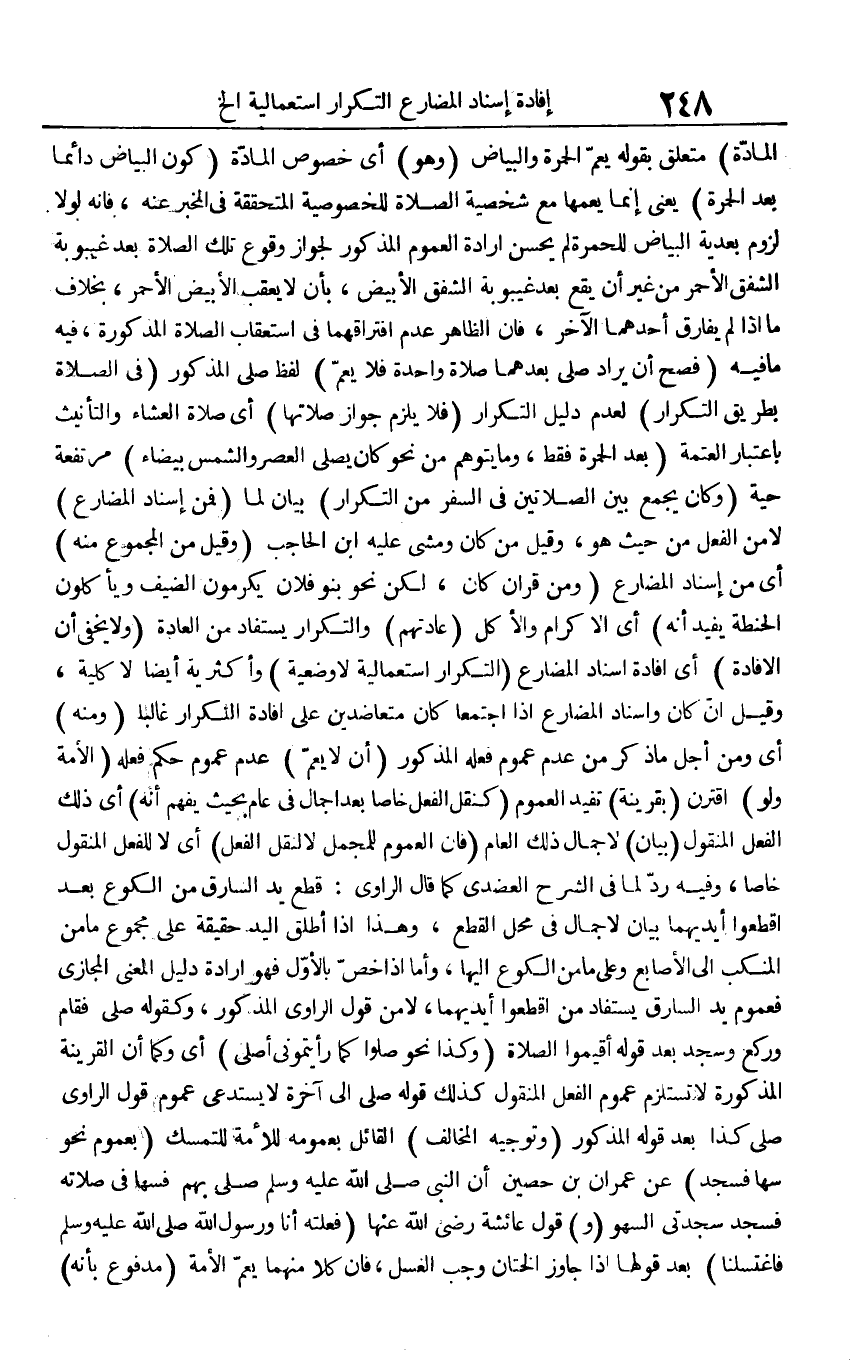 الْمَادَّة) مُتَعَلق بقوله يعم الْحمرَة وَالْبَيَاض (وَهُوَ) أَي خُصُوص الْمَادَّة (كَون الْبيَاض دَائِما بعد الْحمرَة) يَعْنِي إِنَّمَا يعمها مَعَ شخصية الصَّلَاة للخصوصية المتحققة فِي الْمخبر عَنهُ، فَإِنَّهُ لَوْلَا لُزُوم بعدية الْبيَاض للحمرة لم يحسن إِرَادَة الْعُمُوم الْمَذْكُور لجَوَاز وُقُوع تِلْكَ الصَّلَاة بعد غيبوبة الشَّفق الْأَحْمَر من غير أَن يَقع بعد غيبوبة الشَّفق الْأَبْيَض، بِأَن لَا يعقب الْأَبْيَض الْأَحْمَر، بِخِلَاف مَا إِذا لم يُفَارق أَحدهمَا الآخر، فَإِن الظَّاهِر عدم افتراقهما فِي استعقاب الصَّلَاة الْمَذْكُورَة، فِيهِ مَا فِيهِ (فصح أَن يُرَاد صلى بعدهمَا صَلَاة وَاحِدَة فَلَا يعم) لفظ صلى الْمَذْكُور (فِي الصَّلَاة بطرِيق التّكْرَار) لعدم دَلِيل التّكْرَار (فَلَا يلْزم جَوَاز صلَاتهَا) أَي صَلَاة الْعشَاء والتأنيث بِاعْتِبَار الْعَتَمَة (بعد الْحمرَة فَقَط، وَمَا يتَوَهَّم من نَحْو كَانَ يُصَلِّي الْعَصْر وَالشَّمْس بَيْضَاء) مُرْتَفعَة حَيَّة (وَكَانَ يجمع بَين الصَّلَاتَيْنِ فِي السّفر من التّكْرَار) بَيَان لما (فَمن إِسْنَاد الْمُضَارع) لَا من الْفِعْل من حَيْثُ هُوَ، وَقيل من كَانَ وَمَشى عَلَيْهِ ابْن الْحَاجِب (وَقيل من الْمَجْمُوع مِنْهُ) أَي من إِسْنَاد الْمُضَارع (وَمن قرَان كَانَ، لَكِن نَحْو بَنو فلَان يكرمون الضَّيْف ويأكلون الْحِنْطَة يُفِيد أَنه) أَي الْإِكْرَام وَالْأكل (عَادَتهم) والتكرار يُسْتَفَاد من الْعَادة (وَلَا يخفى أَن الإفادة) أَي إِفَادَة إِسْنَاد الْمُضَارع (التّكْرَار استعمالية لَا وضعية) وأكثرية أَيْضا لَا كُلية، وَقيل إِن كَانَ وَإسْنَاد الْمُضَارع إِذا اجْتمعَا كَانَ متعاضدين على إِفَادَة التّكْرَار غَالِبا (وَمِنْه) أَي وَمن أجل مَا ذكر من عدم عُمُوم فعله الْمَذْكُور (أَن لَا يعم) عدم عُمُوم حكم فعله (الْأمة وَلَو) اقْترن (بِقَرِينَة) تفِيد الْعُمُوم (كنقل الْفِعْل خَاصّا بعد اجمال فِي عَام بِحَيْثُ يفهم أَنه) أَي ذَلِك الْفِعْل الْمَنْقُول (بَيَان) لاجمال ذَلِك الْعَام (فَإِن الْعُمُوم للمجمل لَا لنقل الْفِعْل) أَي لَا للْفِعْل الْمَنْقُول خَاصّا، وَفِيه رد لما فِي الشَّرْح العضدي كَمَا قَالَ الرَّاوِي: قطع يَد السَّارِق من الْكُوع بعد اقْطَعُوا أَيْدِيهِمَا بَيَان لإجمال فِي مَحل الْقطع، وَهَذَا إِذا أطلق الْيَد حَقِيقَة على مَجْمُوع مَا من الْمنْكب إِلَى الْأَصَابِع وعَلى مَا من الْكُوع إِلَيْهَا، وَأما إِذا خص بِالْأولِ فَهُوَ إِرَادَة دَلِيل الْمَعْنى الْمجَازِي فعموم يَد السَّارِق يُسْتَفَاد من اقْطَعُوا أَيْدِيهِمَا، لَا من قَول الرَّاوِي الْمَذْكُور، وَكَقَوْلِه صلي فَقَامَ وَركع وَسجد بعد قَوْله أقِيمُوا الصَّلَاة (وَكَذَا نَحْو صلوا كَمَا رَأَيْتُمُونِي أُصَلِّي) أَي وكما أَن الْقَرِينَة الْمَذْكُورَة لَا تَسْتَلْزِم عُمُوم الْفِعْل الْمَنْقُول كَذَلِك قَوْله صلي إِلَى آخِره لَا يستدعى عُمُوم قَول الرَّاوِي صلي كَذَا بعد قَوْله الْمَذْكُور (وتوجيه الْمُخَالف) الْقَائِل بِعُمُومِهِ للْأمة للتمسك (بِعُمُوم نَحْو سَهَا فَسجدَ) عَن عمرَان بن حُصَيْن أَن النَّبِي صلى الله عَلَيْهِ وَسلم صلى بهم فَسَهَا فِي صلَاته فَسجدَ سَجْدَتي السَّهْو (و) قَول عَائِشَة رَضِي الله عَنْهَا (فعلته أَنا وَرَسُول الله صلى الله عَلَيْهِ وَسلم فاغتسلنا) بعد قَوْلهَا إِذا جَاوز الْخِتَان وَجب الْغسْل، فَإِن كلا مِنْهُمَا يعم الْأمة (مَدْفُوع بِأَنَّهُ)