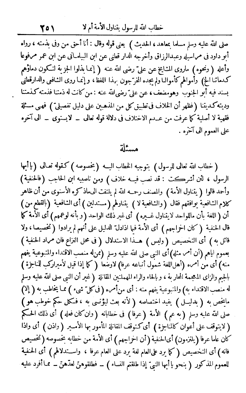 (خطاب الله تَعَالَى للرسول) بتوجيه الْخطاب إِلَيْهِ (بِخُصُوصِهِ) كَقَوْلِه تَعَالَى {يَا أَيهَا الرَّسُول، لَئِن أشركت}: قد نصب فِيهِ خلاف) وَمن ناصبيه ابْن الْحَاجِب (فالحنفية) وَأحمد قَالُوا (يتَنَاوَل الْأمة) وَالْمُصَنّف رَحمَه الله لم يلْتَفت إِلَى مَا ذكره الأسنوي من أَن ظَاهر كَلَام الشَّافِعِيَّة يوافقهم فَقَالَ (وَالشَّافِعِيَّة لَا) يتناولهم (مستدلين) أَي الشَّافِعِيَّة (بِالْقطعِ من) أَن (اللُّغَة بِأَن مَا للْوَاحِد لَا يتَنَاوَل غَيره) أَي غير ذَلِك الْوَاحِد (وَبِأَنَّهُ لَو عمهم) أَي الْأمة كَمَا قَالَ الْحَنَفِيَّة (كَانَ إخراجهم) أَي الْأمة فِيمَا إِذا دلّ الدَّلِيل على أَنهم لم يرادوا (تَخْصِيصًا، وَلَا قَائِل بِهِ) أَي التَّخْصِيص (وَلَيْسَ) هَذَا الِاسْتِدْلَال (فِي مَحل النزاع فَإِن مُرَاد الْحَنَفِيَّة) بِعُمُوم إيَّاهُم (أَن أَمر مثله) أَي النَّبِي صلى الله عَلَيْهِ وَسلم (مِمَّن لَهُ منصب الِاقْتِدَاء والمتبوعية يفهم مِنْهُ) أَي من أمره (أهل اللُّغَة شُمُول أَتْبَاعه عرفا) لَا وضعا كَمَا إِذا قيل لأمير اركب للمناجزة) بِالْجِيم وَالزَّاي الْمُعْجَمَة الْمُحَاربَة، وَبِالْحَاءِ وَالرَّاء الْمُهْمَلَتَيْنِ الْمُقَاتلَة (غير أَن النَّبِي صلى الله عَلَيْهِ وَسلم لَهُ منصب الِاقْتِدَاء بِهِ) والمتبوعية يفهم مِنْهُ: أَي من أمره (فِي كل شَيْء) مِمَّا يُخَاطب بِهِ (إِلَّا) مَا يخص بِهِ (بِدَلِيل) يُفِيد اخْتِصَاصه (لِأَنَّهُ بعث ليؤتسى بِهِ، فَكل حكم خُوطِبَ هُوَ) صلى الله عَلَيْهِ وَسلم (بِهِ عَم) الْأمة (عرفا) فِي خطاباته (وَإِن كَانَ فعله) أَي ذَلِك الحكم (لَا يتَوَقَّف على أعوان كالمناجزة) أَي كتوقف الْمُقَاتلَة الْمَأْمُور بهَا الْأَمِير (واذن) أَي وَإِذا كَانَ عَاما عرفا (يلتزمون) أَي الْحَنَفِيَّة (أَن إخراجهم) أَي الْأمة من خطابه بِخُصُوصِهِ (تَخْصِيص فَإِنَّهُ) أَي التَّخْصِيص (كَمَا يرد على الْعَام لُغَة يرد على الْعَام عرفا، واستدلالهم) أَي الْحَنَفِيَّة للْعُمُوم الْمَذْكُور {بِنَحْوِ يَا أَيهَا النَّبِي إِذا طلّقْتُم النِّسَاء} - فطلقوهن لعدهن - مِمَّا أفرد صلى الله عَلَيْهِ وَسلم