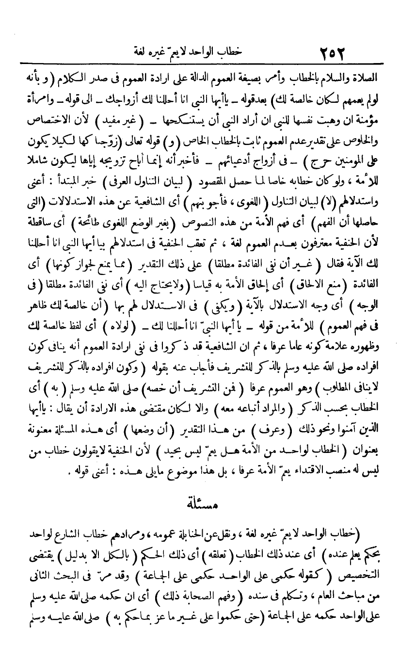 بِالْخِطَابِ وَأمر بِصِيغَة الْعُمُوم الدَّالَّة على إِرَادَة الْعُمُوم فِي صدر الْكَلَام (وَبِأَنَّهُ لَو لم يعمهم لَكَانَ خَالِصَة لَك) بعد قَوْله - {يَا أَيهَا النَّبِي إِنَّا أَحللنَا لَك أَزوَاجك} - إِلَى قَوْله - {وَامْرَأَة مُؤمنَة إِن وهبت نَفسهَا للنَّبِي إِن أَرَادَ النَّبِي أَن يستنكحها} - (غير مُفِيد) لِأَن الِاخْتِصَاص والخلوص على تَقْدِير عدم الْعُمُوم ثَابت بِالْخِطَابِ الْخَاص (و) قَوْله تَعَالَى {زَوَّجْنَاكهَا لكيلا يكون على الْمُؤمنِينَ حرج} - فِي أَزوَاج أدعيائهم - فَأخْبر أَنه إِنَّمَا أَبَاحَ تَزْوِيجه إِيَّاهَا ليَكُون شَامِلًا للْأمة، وَلَو كَانَ خطابه خَاصّا لما حصل الْمَقْصُود (لبَيَان التَّنَاوُل الْعرفِيّ) خبر الْمُبْتَدَأ: أَعنِي واستدلالهم (لَا) لبَيَان التَّنَاوُل (اللّغَوِيّ، فأجوبتهم) أَي الشَّافِعِيَّة عَن هَذِه الاستدلالات (الَّتِي حاصلها أَن الْفَهم) أَي فهم الْأمة من هَذِه النُّصُوص (بِغَيْر الْوَضع اللّغَوِيّ طائحة) أَي سَاقِطَة لِأَن الْحَنَفِيَّة معترفون، بِعَدَمِ الْعُمُوم لُغَة، ثمَّ تعقب الْحَنَفِيَّة فِي استدلالهم ب {يَا أَيهَا النَّبِي إِنَّا أَحللنَا لَك} الْآيَة فَقَالَ (غير أَن نفي الْفَائِدَة مُطلقًا) على ذَلِك التَّقْدِير (مِمَّا يمْنَع لجَوَاز كَونهَا) أَي الْفَائِدَة (منع الْإِلْحَاق) أَي إِلْحَاق الْأمة بِهِ قِيَاسا (وَلَا يحْتَاج إِلَيْهِ) أَي نفي الْفَائِدَة مُطلقًا (فِي الْوَجْه) أَي وَجه الِاسْتِدْلَال بِالْآيَةِ (وَيَكْفِي) فِي الِاسْتِدْلَال لَهُم بهَا (أَن خَالِصَة لَك ظَاهر فِي فهم الْعُمُوم) للْأمة من قَوْله - {يَا أَيهَا النَّبِي إِنَّا أَحللنَا لَك} - (لولاه) أَي لفظ خَالِصَة لَك وظهوره عَلامَة كَونه عَاما عرفا، ثمَّ أَن الشَّافِعِيَّة قد ذكرُوا فِي نفي إِرَادَة الْعُمُوم أَنه يُنَافِي كَون أَفْرَاده صلى الله عَلَيْهِ وَسلم بِالذكر للتشريف فَأجَاب عَنهُ بقوله (وَكَون إِفْرَاده بِالذكر للتشريف لَا يُنَافِي الْمَطْلُوب) وَهُوَ الْعُمُوم عرفا (فَمن التشريف أَن خصّه) صلى الله عَلَيْهِ وَسلم (بِهِ) أَي الْخطاب بِحَسب الذّكر (وَالْمرَاد أَتْبَاعه مَعَه) وَإِلَّا لَكَانَ مُقْتَضى هَذِه الْإِرَادَة أَن يُقَال: يَا أَيهَا الَّذين آمنُوا وَنَحْو ذَلِك (وَعرف) من هَذَا التَّقْدِير (أَن وَضعهَا) أَي هَذِه المسئلة معنونة بعنوان (الْخطاب لوَاحِد من الْأمة هَل يعم لَيْسَ بحيد) لِأَن الْحَنَفِيَّة لَا يَقُولُونَ خطاب من لَيْسَ لَهُ منصب الِاقْتِدَاء يعم الْأمة عرفا، بل هَذَا مَوْضُوع مَا يَلِي هَذِه: أَعنِي قَوْله.