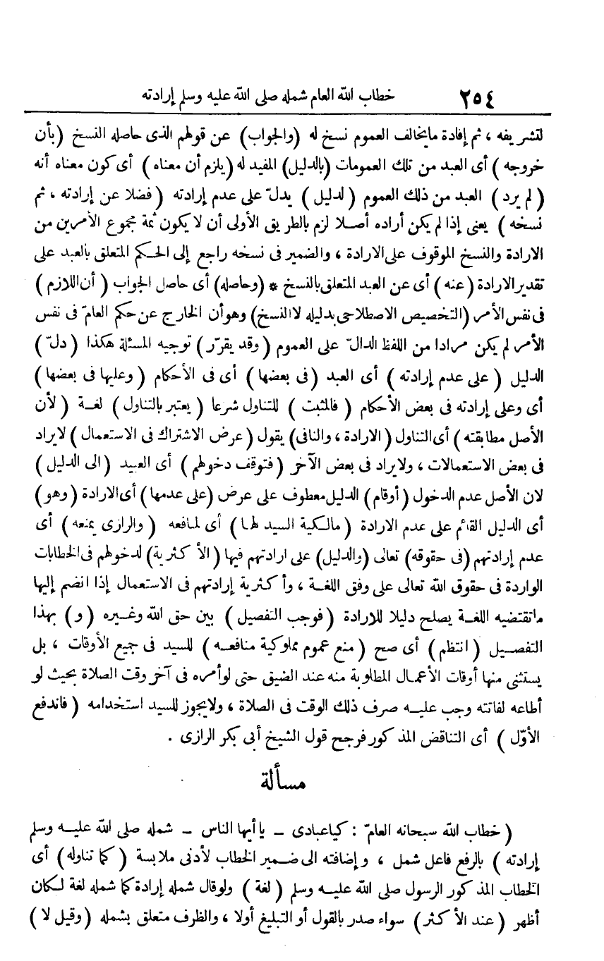 لتشريفه، ثمَّ إِفَادَة مَا يُخَالف الْعُمُوم نسخ لَهُ (وَالْجَوَاب) عَن قَوْلهم الَّذِي حَاصله النّسخ (بِأَن خُرُوجه) أَي العَبْد من تِلْكَ العمومات (بِالدَّلِيلِ) الْمُفِيد لَهُ (يلْزم أَن مَعْنَاهُ) أَي كَون مَعْنَاهُ أَنه (لم يرد) العَبْد من ذَلِك الْعُمُوم (لدَلِيل) يدل على عدم إِرَادَته (فضلا عَن إِرَادَته، ثمَّ نُسْخَة) يَعْنِي إِذا لم يكن أَرَادَهُ أصلا لزم بِالطَّرِيقِ الأولى أَن لَا يكون ثمَّة مَجْمُوع الْأَمريْنِ من الْإِرَادَة والنسخ الْمَوْقُوف على الْإِرَادَة، وَالضَّمِير فِي نُسْخَة رَاجع إِلَى الحكم الْمُتَعَلّق بِالْعَبدِ على تَقْدِير الْإِرَادَة (عَنهُ) أَي عَن العَبْد الْمُتَعَلّق بالنسخ (وَحَاصِله) أَي حَاصِل الْجَواب (أَن اللَّازِم) فِي نفس الْأَمر (التَّخْصِيص الاصطلاحي بدليله لَا النّسخ) وَهُوَ أَن الْخَارِج عَن حكم الْعَام فِي نفس الْأَمر لم يكن مرَادا من اللَّفْظ الدَّال على الْعُمُوم (وَقد يُقرر) تَوْجِيه المسئلة هَكَذَا (دلّ) الدَّلِيل (على عدم إِرَادَته) أَي العَبْد (فِي بَعْضهَا) أَي فِي الْأَحْكَام (وَعَلَيْهَا فِي بَعْضهَا) أَي وعَلى إِرَادَته فِي بعض الْأَحْكَام (فالمثبت (للتناول شرعا (يعْتَبر بالتناول) لُغَة لِأَن الأَصْل مطابقته) أَي التَّنَاوُل (الْإِرَادَة، والنافي) بقول (عرض الِاشْتِرَاك فِي الِاسْتِعْمَال) لَا يُرَاد فِي بعض الاستعمالات، وَلَا يُرَاد فِي بعض الآخر (فتوقف دُخُولهمْ) أَي العبيد (إِلَى الدَّلِيل لِأَن الأَصْل عدم الدُّخُول (أَو قَامَ) الدَّلِيل مَعْطُوف على عرض (على عدمهَا) أَي الْإِرَادَة (وَهُوَ) أَي الدَّلِيل الْقَائِم على عدم الْإِرَادَة (مالكية السَّيِّد لَهَا) أَي لمنافعه (والرازي يمنعهُ) أَي عدم إرادتهم (فِي حُقُوقه) تَعَالَى (وَالدَّلِيل) على إرادتهم فِيهَا (الأكثرية) لدخولهم فِي الخطابات الْوَارِدَة فِي حُقُوق الله تَعَالَى على وفْق اللُّغَة، وأكثرية إرادتهم فِي الِاسْتِعْمَال إِذا انْضَمَّ إِلَيْهَا مَا تَقْتَضِيه اللُّغَة يصلح دَلِيلا للإرادة (فَوَجَبَ التَّفْصِيل) بَين حق الله وَغَيره (و) بِهَذَا التَّفْصِيل (انتظم) أَي صَحَّ (منع عُمُوم مملوكية مَنَافِعه) للسَّيِّد فِي جَمِيع الْأَوْقَات، بل يسْتَثْنى مِنْهَا أَوْقَات الْأَعْمَال الْمَطْلُوبَة مِنْهُ عِنْد الضّيق حَتَّى لَو أمره فِي آخر وَقت الصَّلَاة بِحَيْثُ لَو أطاعه لفاتته وَجب عَلَيْهِ صرف ذَلِك الْوَقْت فِي الصَّلَاة، وَلَا يجوز للسَّيِّد استخدامه (فَانْدفع الأول) أَي التَّنَاقُض الْمَذْكُور فرجح قَول الشَّيْخ أبي بكر الرَّازِيّ.