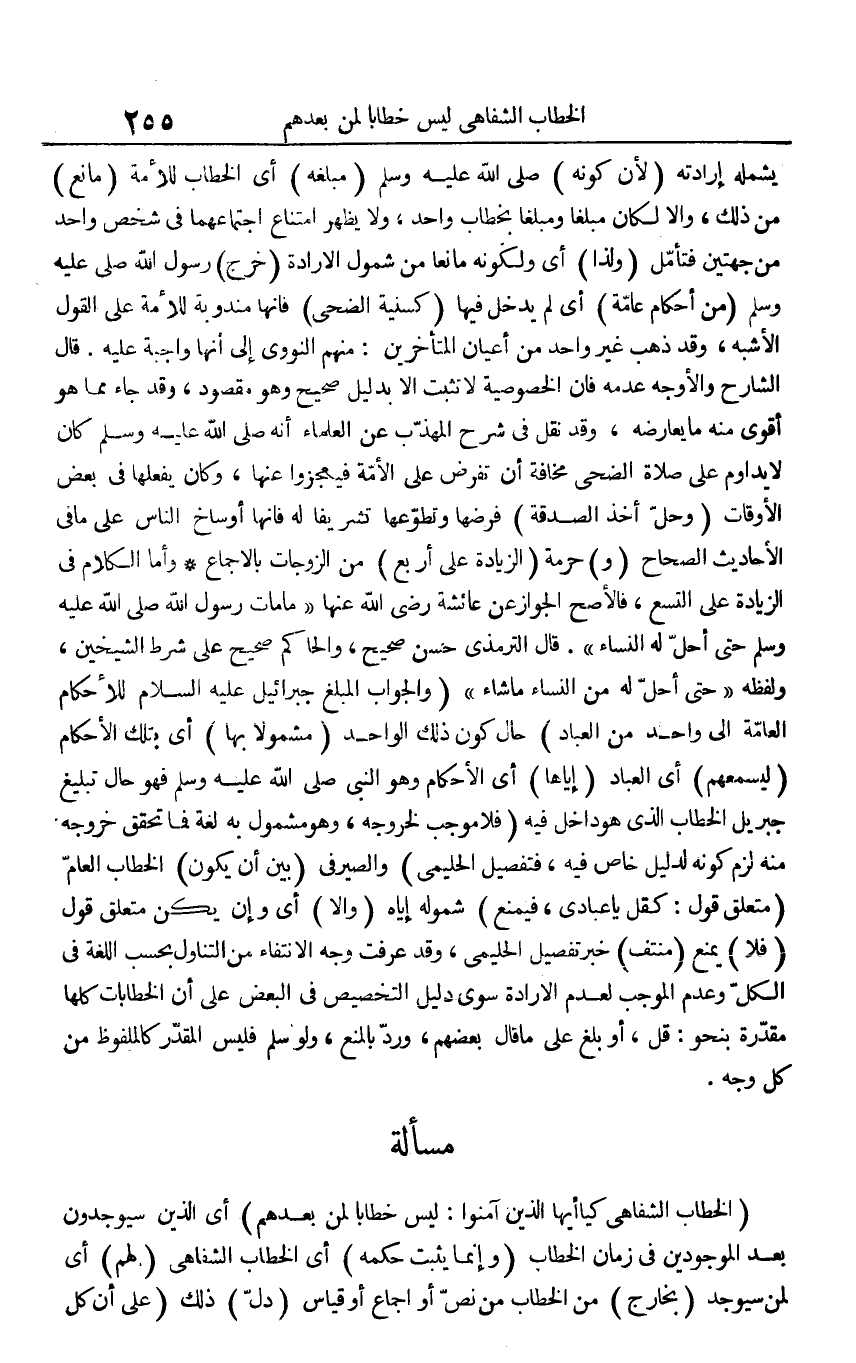 يَشْمَلهُ إِرَادَته (لِأَن كَونه) صلى الله عَلَيْهِ وَسلم (مبلغه) أَي الْخطاب للْأمة (مَانع) من ذَلِك، وَإِلَّا لَكَانَ مبلغا ومبلغا بخطاب وَاحِد، وَلَا يظْهر امْتنَاع اجْتِمَاعهمَا فِي شخص وَاحِد من جِهَتَيْنِ فَتَأمل (وَلذَا) أَي ولكونه مَانِعا من شُمُوله الْإِرَادَة (خرج) رَسُول الله صلى الله عَلَيْهِ وَسلم (من أَحْكَام عَامَّة) أَي لم يدْخل فِيهَا (كسنية الضُّحَى) فَإِنَّهَا مَنْدُوبَة للْأمة على القَوْل الْأَشْبَه، وَقد ذهب غير وَاحِد من أَعْيَان الْمُتَأَخِّرين: مِنْهُم النَّوَوِيّ إِلَى أَنَّهَا وَاجِبَة عَلَيْهِ. قَالَ الشَّارِح وَالْأَوْجه عَدمه فَإِن الخصوصية لَا تثبت إِلَّا بِدَلِيل صَحِيح وَهُوَ مَقْصُود، وَقد جَاءَ مِمَّا هُوَ أقوى مِنْهُ مَا يُعَارضهُ، وَقد نقل فِي شرح الْمُهَذّب عَن الْعلمَاء أَنه صلى الله عَلَيْهِ وَسلم كَانَ لَا يداوم على صَلَاة الضُّحَى مَخَافَة أَن تفرض على الْأمة فيعجزوا عَنْهَا، وَكَانَ يَفْعَلهَا فِي بعض الْأَوْقَات (وَحل أَخذ الصَّدَقَة) فَرضهَا وتطوعها تَشْرِيفًا لَهُ فَإِنَّهَا أوساخ النَّاس على مَا فِي الْأَحَادِيث الصِّحَاح (و) حُرْمَة (الزِّيَادَة على أَربع) من الزَّوْجَات بِالْإِجْمَاع وَأما الْكَلَام فِي الزِّيَادَة على التسع، فَالْأَصَحّ الْجَوَاز عَن عَائِشَة رَضِي الله عَنْهَا " مَا مَاتَ رَسُول الله صلى الله عَلَيْهِ وَسلم حَتَّى أحل لَهُ النِّسَاء ". قَالَ التِّرْمِذِيّ حسن صَحِيح، وَالْحَاكِم صَحِيح على شَرط الشَّيْخَيْنِ، وَلَفظه " حَتَّى أحل لَهُ من النِّسَاء مَا شَاءَ " (وَالْجَوَاب الْمبلغ جِبْرَائِيل عَلَيْهِ السَّلَام للْأَحْكَام الْعَامَّة إِلَى وَاحِد من الْعباد) حَال كَون ذَلِك الْوَاحِد (مشمولا بهَا) أَي بِتِلْكَ الْأَحْكَام (ليسمعهم) أَي الْعباد (إِيَّاهَا) أَي الْأَحْكَام وَهُوَ النَّبِي صلى الله عَلَيْهِ وَسلم فَهُوَ حَال تَبْلِيغ جِبْرِيل الْخطاب الَّذِي هُوَ دَاخل فِيهِ (فَلَا مُوجب لِخُرُوجِهِ، وَهُوَ مشمول بِهِ لُغَة فَمَا تحقق خُرُوجه مِنْهُ لزم كَونه لدَلِيل خَاص فِيهِ، فتفصيل الْحَلِيمِيّ) والصيرفي (بَين أَن يكون) الْخطاب الْعَام (مُتَعَلق قَول: كقل يَا عبَادي، فَيمْنَع) شُمُوله إِيَّاه (وَإِلَّا) أَي وَإِن يكن مُتَعَلق قَول (فَلَا) يمْنَع (مُنْتَفٍ) خبر تَفْصِيل الْحَلِيمِيّ، وَقد عرفت وَجه الانتفاء من التَّنَاوُل بِحَسب اللُّغَة فِي الْكل وَعدم الْمُوجب لعدم الْإِرَادَة سوى دَلِيل التَّخْصِيص فِي الْبَعْض على أَن الخطابات كلهَا مقدرَة بِنَحْوِ: قل، أَو بلغ على مَا قَالَ بَعضهم، ورد بِالْمَنْعِ، وَلَو سلم فَلَيْسَ الْمُقدر كالملفوظ من كل وَجه.