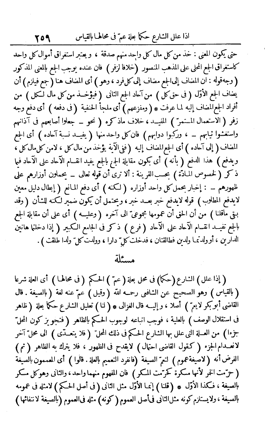 (إذا علل) الشارع (حكما) في محل بعلة (عم) الحكم (في محالها) أي العلة شرعا (بالقياس) وهو الصحيح عن الشافعي رحمه الله (وقيل) عم عنه لغة (بالصيغة: قال القاضي أبو بكر لا يعم) أصلا، وإليه قال الغزالي، (لنا) تعليل الشارع حكما بعلة (ظاهر في استقلال الوصف) بالعلية، فوجب اتباعه لوجوب الحكم بالظاهر، (فتجويز كون المحل جزءا) من العلة التي علل بها الشارع الحكم في ذلك المحل (فلا يتعدى) إلى محل آخر لانعدام الجزء (كقول القاضي احتمال) لا يقدح في الظهور، فلا يترك به الظاهر (ثم) الفرض أنه (لا صيغة عموم) لتعم الصيغة (فانفرد التعميم بعلة. قالوا) أي المعممون بالصيغة (حرمت الخمر لأنها مسكرة كحرمت المسكر) فإن المفهوم منهما واحد، والثاني وهو كل مسكر بالصيغة، فكذا الأول (قلنا) إنما الأول مثل الثاني (في أصل الحكم) لا مثله في عمومه بالصيغة، ولا يستلزم كونه مثل الثاني في أصل العموم (كونه) مثله في العموم (بالصيغة لانتفائها)