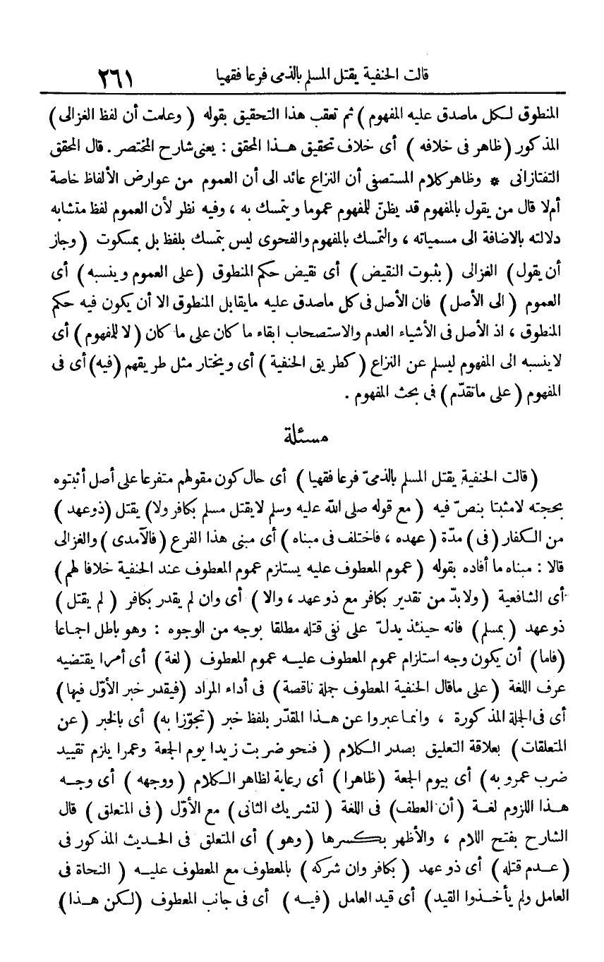 (قَالَت الْحَنَفِيَّة يقتل الْمُسلم بالذمي فرعا فقهيا) أَي حَال كَون مقولهم متفرعا على أصل أثبتوه بحجته لَا مثبتا بِنَصّ فِيهِ (مَعَ قَوْله صلى الله عَلَيْهِ وَسلم لَا يقتل مُسلم بِكَافِر وَلَا) يقتل (ذُو عهد) من الْكفَّار (فِي) مُدَّة (عَهده، فَاخْتلف فِي مبناه) أَي مبْنى هَذَا الْفَرْع (فالآمدي) وَالْغَزالِيّ قَالَا: مبناه مَا أَفَادَهُ بقوله (عُمُوم الْمَعْطُوف عَلَيْهِ يسْتَلْزم عُمُوم الْمَعْطُوف عِنْد الْحَنَفِيَّة خلافًا لَهُم) أَي الشَّافِعِيَّة (وَلَا بُد من تَقْدِير بِكَافِر مَعَ ذُو عهد، وَإِلَّا) أَي وَإِن لم يقدر بِكَافِر (لم يقتل) ذُو عهد (بِمُسلم) فَإِنَّهُ حِينَئِذٍ يدل على نفي قَتله مُطلقًا بِوَجْه من الْوُجُوه: وَهُوَ بَاطِل إِجْمَاعًا (فإمَّا) أَن يكون وَجه استلزام عُمُوم الْمَعْطُوف عَلَيْهِ عُمُوم الْمَعْطُوف (لُغَة) أَي أمرا يَقْتَضِيهِ عرف اللُّغَة (على مَا قَالَ الْحَنَفِيَّة الْمَعْطُوف جملَة نَاقِصَة) فِي أَدَاء المُرَاد (فَيقدر خبر الأول فِيهَا) أَي فِي الْجُمْلَة الْمَذْكُورَة، وَإِنَّمَا عبروا عَن هَذَا الْمُقدر بِلَفْظ خبر (تجوزا بِهِ) أَي بالْخبر (عَن المتعلقات) بعلاقة التَّعْلِيق بصدر الْكَلَام (فنحو ضربت زيدا يَوْم الْجُمُعَة وعمرا يلْزم تَقْيِيد ضرب عَمْرو بِهِ) أَي بِيَوْم الْجُمُعَة (ظَاهرا) أَي رِعَايَة لظَاهِر الْكَلَام (وَوَجهه) أَي وَجه هَذَا اللُّزُوم لُغَة (أَن الْعَطف) فِي اللُّغَة (لتشريك الثَّانِي) مَعَ الأول (فِي الْمُتَعَلّق) قَالَ الشَّارِح بِفَتْح اللَّام، وَالْأَظْهَر بِكَسْرِهَا (وَهُوَ) أَي الْمُتَعَلّق فِي الحَدِيث الْمَذْكُور فِي (عدم قَتله) أَي ذُو عهد (بِكَافِر وَإِن شركه) بالمعطوف مَعَ الْمَعْطُوف عَلَيْهِ (النجَاة فِي الْعَامِل وَلم يَأْخُذُوا الْقَيْد) أَي قيد الْعَامِل (فِيهِ) أَي فِي جَانب الْمَعْطُوف (لَكِن هَذَا)
