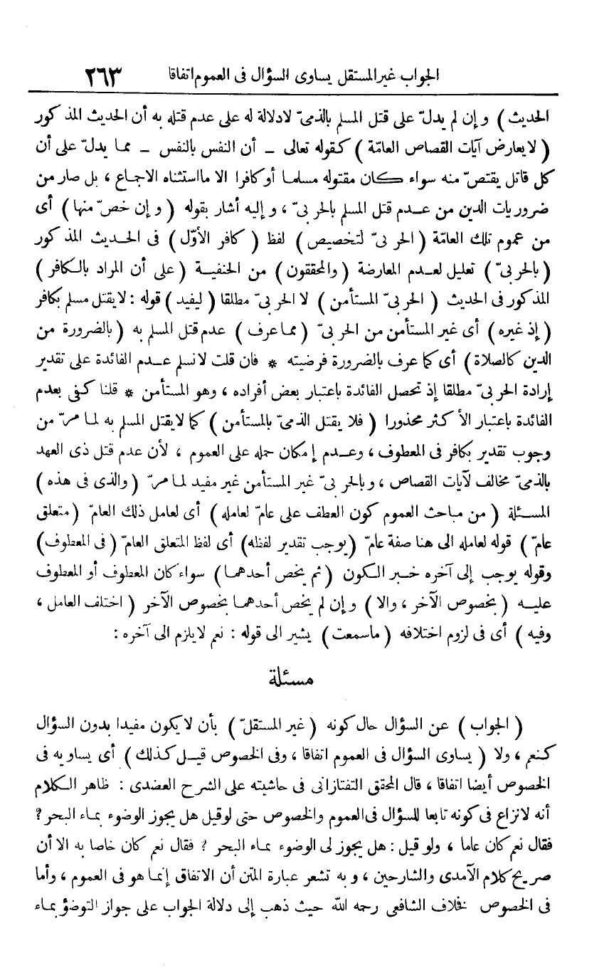 (الْجَواب) عَن السُّؤَال حَال كَونه (غير المستقل) بِأَن لَا يكون مُفِيدا بِدُونِ السُّؤَال كنعم، وَلَا (يُسَاوِي السُّؤَال فِي الْعُمُوم اتِّفَاقًا، وَفِي الْخُصُوص قيل كَذَلِك) أَي يُسَاوِيه فِي الْخُصُوص أَيْضا اتِّفَاقًا، قَالَ الْمُحَقق التَّفْتَازَانِيّ فِي حَاشِيَته على الشَّرْح العضدي: ظَاهر الْكَلَام أَنه لَا نزاع فِي كَونه تَابعا للسؤال فِي الْعُمُوم وَالْخُصُوص حَتَّى لَو قيل هَل يجوز الْوضُوء بِمَاء الْبَحْر؟ فَقَالَ نعم كَانَ عَاما، وَلَو قيل: هَل يجوز لي الْوضُوء بِمَاء الْبَحْر؟ فَقَالَ نعم كَانَ خَاصّا بِهِ إِلَّا أَن صَرِيح كَلَام الْآمِدِيّ والشارحين، وَبِه تشعر عبارَة الْمَتْن أَن الِاتِّفَاق إِنَّمَا هُوَ فِي الْعُمُوم، وَأما فِي الْخُصُوص، فخلاف الشَّافِعِي رَحمَه الله حَيْثُ ذهب إِلَى دلَالَة الْجَواب على جَوَاز التَّوَضُّؤ بِمَاء