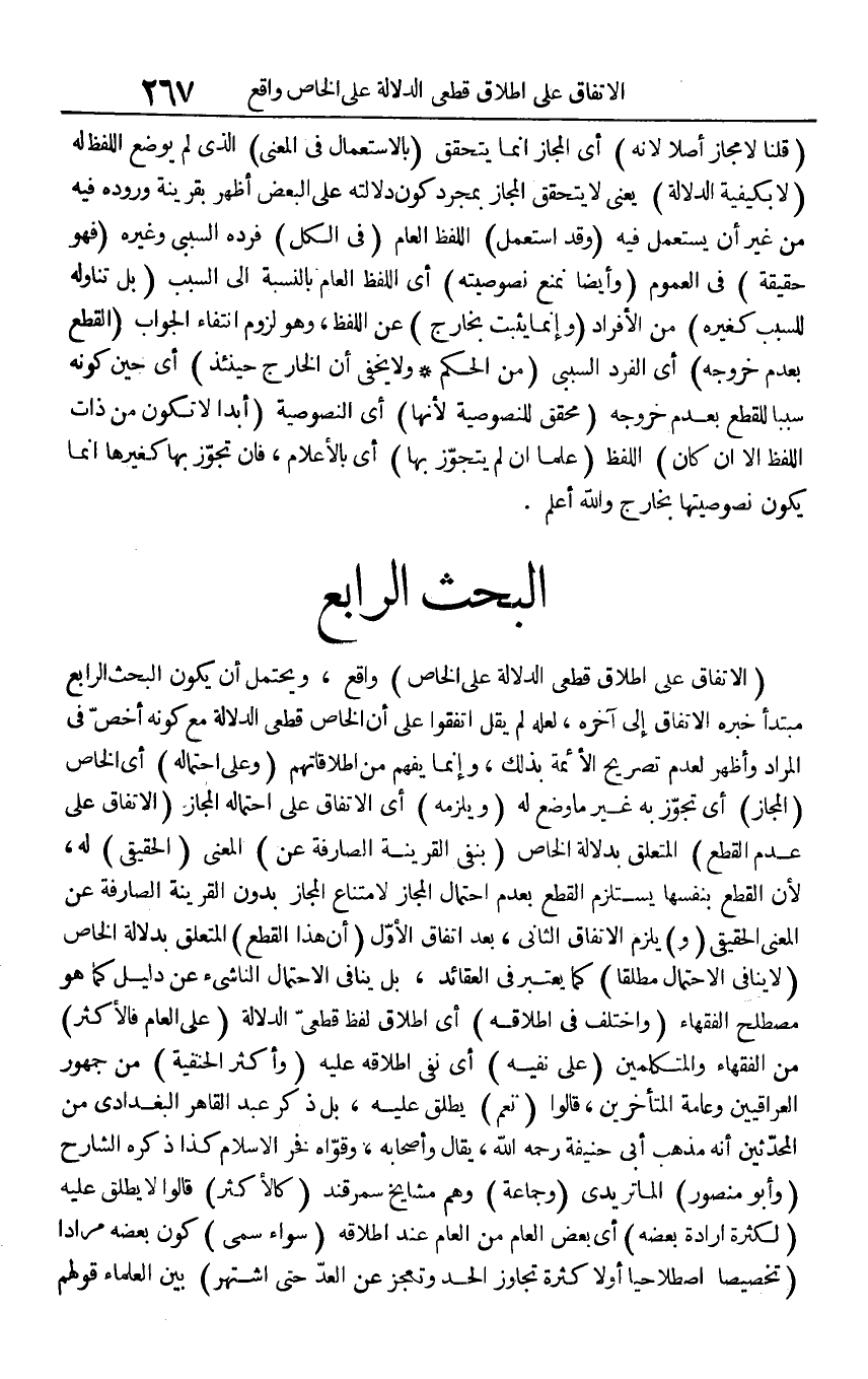 (الِاتِّفَاق على إِطْلَاق قَطْعِيّ الدّلَالَة على الْخَاص) وَاقع، وَيحْتَمل أَن يكون الْبَحْث الرَّابِع مُبْتَدأ خَبره الِاتِّفَاق إِلَى آخِره، لَعَلَّه لم يقل اتَّفقُوا على أَن الْخَاص قَطْعِيّ الدّلَالَة مَعَ كَونه أخص فِي المُرَاد وَأظْهر لعدم تَصْرِيح الْأَئِمَّة بذلك، وَإِنَّمَا يفهم من إطلاقاتهم (وعَلى احْتِمَاله) أَي الْخَاص (الْمجَاز) أَي تجوز بِهِ غير مَا وضع لَهُ (وَيلْزمهُ) أَي الِاتِّفَاق على احْتِمَاله الْمجَاز (الِاتِّفَاق على عدم الْقطع) الْمُتَعَلّق بِدلَالَة الْخَاص (بِنَفْي الْقَرِينَة الصارمة عَن) الْمَعْنى (الْحَقِيقِيّ) لَهُ، لِأَن الْقطع بِنَفسِهَا يسْتَلْزم الْقطع بِعَدَمِ احْتِمَال الْمجَاز لِامْتِنَاع الْمجَاز بِدُونِ الْقَرِينَة الصارفة عَن الْمَعْنى الْحَقِيقِيّ (و) يلوم الِاتِّفَاق الثَّانِي، بعد اتِّفَاق الأول (أَن هَذَا الْقطع) الْمُتَعَلّق بِدلَالَة الْخَاص (لَا يُنَافِي الِاحْتِمَال مُطلقًا) كَمَا يعْتَبر فِي العقائد، بل يُنَافِي الِاحْتِمَال النَّاشِئ عَن دَلِيل كَمَا هُوَ مصطلح الْفُقَهَاء (وَاخْتلف فِي إِطْلَاقه) أَي إِطْلَاق لفظ قَطْعِيّ الدّلَالَة (على الْعَام فالأكثر) من الْفُقَهَاء والمتكلمين (على نَفْيه) أَي نفي إِطْلَاقه عَلَيْهِ (وَأكْثر الْحَنَفِيَّة) من جُمْهُور الْعِرَاقِيّين وَعَامة الْمُتَأَخِّرين، قَالُوا (نعم) يُطلق عَلَيْهِ، بل ذكر عبد القاهر الْبَغْدَادِيّ من الْمُحدثين أَنه مَذْهَب أبي حنيفَة رَحمَه الله، يُقَال وَأَصْحَابه، وَقواهُ فَخر الْإِسْلَام كَذَا ذكره الشَّارِح (وَأَبُو مَنْصُور) الماتريدي (وَجَمَاعَة) وهم مَشَايِخ سَمَرْقَنْد (كالأكثر) قَالُوا لَا يُطلق عَلَيْهِ (لِكَثْرَة إِرَادَة بعضه) أَي بعض الْعَام من الْعَام عِنْد إِطْلَاقه (سَوَاء سمي) كَون بعضه مرَادا (تَخْصِيصًا اصطلاحيا أَو لَا كَثْرَة تجَاوز الْحَد وتعجز عَن الْعد حَتَّى اشْتهر) بَين الْعلمَاء قَوْلهم