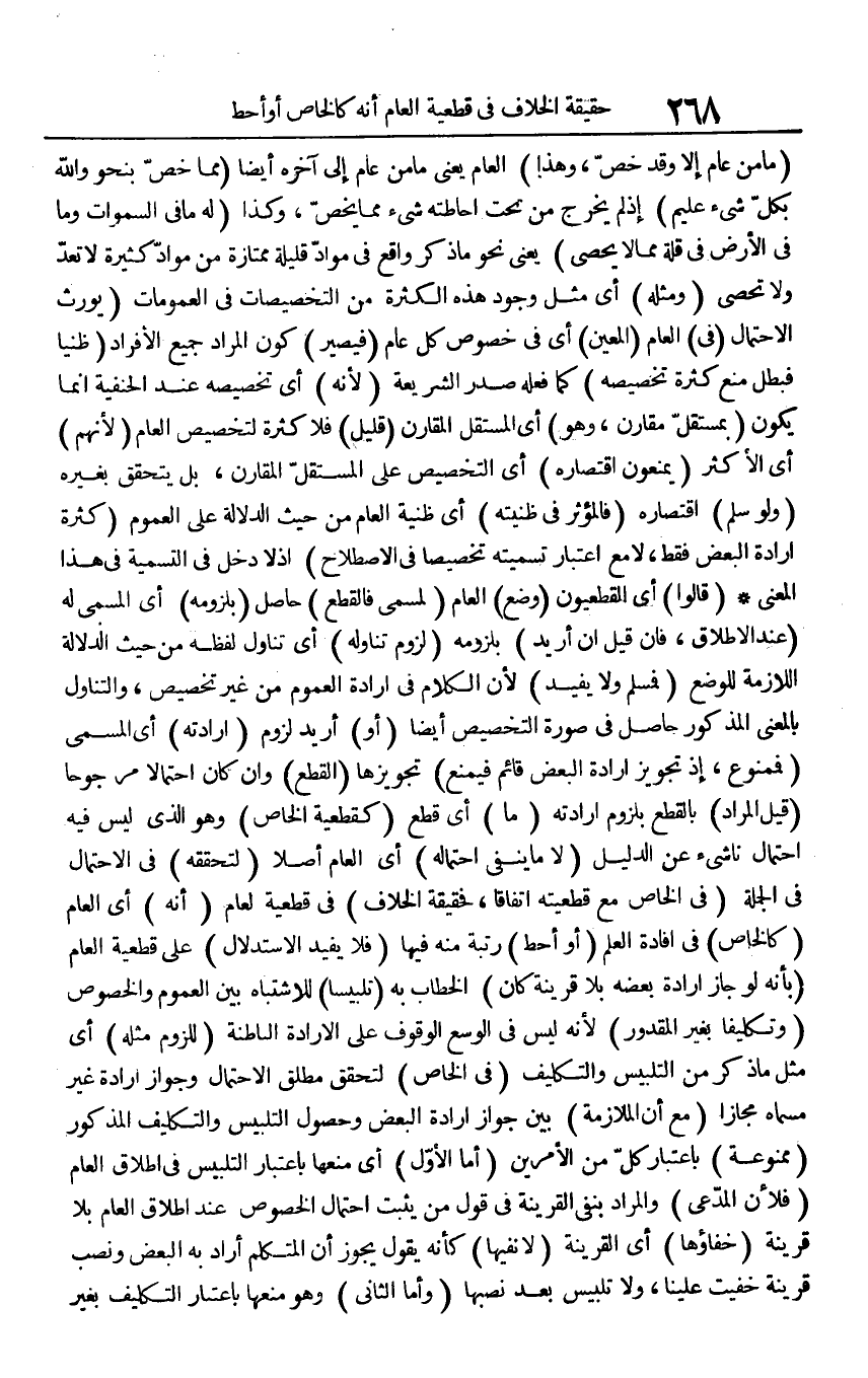 (مَا من عَام إِلَّا وَقد خص، وَهَذَا) الْعَام يَعْنِي مَا من عَام إِلَى آخِره أَيْضا (مِمَّا خص بِنَحْوِ وَالله بِكُل شَيْء عليم) إِذْ لم يخرج من تَحت إحاطته شَيْء مِمَّا يخص، وَكَذَا {لَهُ مَا فِي السَّمَاوَات وَمَا فِي الأَرْض} فِي قلَّة مِمَّا لَا يُحْصى) يَعْنِي نَحْو مَا ذكر وَاقع فِي مواد قَلِيله ممتازة من مواد كَثِيرَة لَا تعد وَلَا تحصى (وَمثله) أَي مثل وجود هَذِه الْكَثْرَة من التخصيصات فِي العمومات (يُورث الِاحْتِمَال (فِي) الْعَام (الْمعِين) أَي فِي خُصُوص كل عَام (فَيصير) كَون المُرَاد جَمِيع الْأَفْرَاد (ظنيا فَبَطل منع كَثْرَة تَخْصِيصه) كَمَا فعله صدر الشَّرِيعَة (لِأَنَّهُ) أَي تَخْصِيصه عِنْد الْحَنَفِيَّة إِنَّمَا يكون (بمستقل مُقَارن، وَهُوَ) أَي المستقل الْمُقَارن (قَلِيل) فَلَا كَثْرَة لتخصيص الْعَام (لأَنهم) أَي الْأَكْثَر (يمْنَعُونَ اقْتِصَاره) أَي التَّخْصِيص على المستقل الْمُقَارن، بل يتَحَقَّق بِغَيْرِهِ (وَلَو سلم) اقْتِصَاره (فالمؤثر فِي ظنيته) أَي ظنية الْعَام من حَيْثُ الدّلَالَة على الْعُمُوم (كَثْرَة إِرَادَة الْبَعْض فَقَط، لَا مَعَ اعْتِبَار تَسْمِيَته تَخْصِيصًا فِي الِاصْطِلَاح) إِذْ لَا دخل فِي التَّسْمِيَة فِي هَذَا الْمَعْنى (قَالُوا) أَي القطعيون (وضع) الْعَام (لمسمى فالقطع) حَاصِل (بلزومه) أَي الْمُسَمّى لَهُ (عِنْد الْإِطْلَاق، فَإِن قيل إِن أُرِيد) بلزومه (لُزُوم تنَاوله) أَي تنَاول لَفظه من حَيْثُ الدّلَالَة اللَّازِمَة للوضع (فَمُسلم وَلَا يُفِيد) لِأَن الْكَلَام فِي إِرَادَة الْعُمُوم من غير تَخْصِيص، والتناول بِالْمَعْنَى الْمَذْكُور حَاصِل فِي صُورَة التَّخْصِيص أَيْضا (أَو) أُرِيد لُزُوم (إِرَادَته) أَي الْمُسَمّى (فَمَمْنُوع، إِذْ تَجْوِيز إِرَادَة الْبَعْض قَائِم فَيمْنَع) تجويزها (الْقطع) وَإِن كَانَ احْتِمَالا مرجوحا (قيل المُرَاد) بِالْقطعِ بِلُزُوم إِرَادَته (مَا) أَي قطع (كقطعية الْخَاص) وَهُوَ الَّذِي لَيْسَ فِيهِ احْتِمَال نَاشِئ عَن الدَّلِيل (لَا مَا يَنْفِي احْتِمَاله) أَي الْعَام أصلا (لتحققه) فِي الِاحْتِمَال فِي الْجُمْلَة (فِي الْخَاص مَعَ قطعيته اتِّفَاقًا، فحقيقة الْخلاف) فِي قَطْعِيَّة لعام (أَنه) أَي الْعَام (كالخاص) فِي إِفَادَة الْعلم (أَو أحط) رُتْبَة مِنْهُ فِيهَا (فَلَا يُفِيد الِاسْتِدْلَال) على قَطْعِيَّة الْعَام (بِأَنَّهُ لَو جَازَ إِرَادَة بعضه بِلَا قرينَة كَانَ) الْخطاب بِهِ (تلبيسا) للاشتباه بَين الْعُمُوم وَالْخُصُوص (وتكليفا بِغَيْر الْمَقْدُور) لِأَنَّهُ لَيْسَ فِي الوسع الْوُقُوف على الْإِرَادَة الْبَاطِنَة (للُزُوم مثله) أَي مثل مَا ذكر من التلبيس والتكليف (فِي الْخَاص) لتحَقّق مُطلق الِاحْتِمَال وَجَوَاز إِرَادَة غير مُسَمَّاهُ مجَازًا (مَعَ أَن الْمُلَازمَة) بَين جَوَاز إِرَادَة الْبَعْض وَحُصُول التلبيس والتكليف الْمَذْكُور (مَمْنُوعَة) بِاعْتِبَار كل من الْأَمريْنِ (أما الأول) أَي منعهَا بِاعْتِبَار التلبيس فِي إِطْلَاق الْعَام (فَلِأَن الْمُدعى) وَالْمرَاد بِنَفْي الْقَرِينَة فِي قَول من يثبت احْتِمَال الْخُصُوص عِنْد إِطْلَاق الْعَام بِلَا قرينَة (خفاؤها) أَي الْقَرِينَة (لَا نَفيهَا) كَأَنَّهُ يَقُول يجوز أَن الْمُتَكَلّم أَرَادَ بِهِ الْبَعْض وَنصب قرينَة خفيت علينا، وَلَا تلبيس بعد نصبها (وَأما الثَّانِي) وَهُوَ منعهَا بِاعْتِبَار التَّكْلِيف بِغَيْر