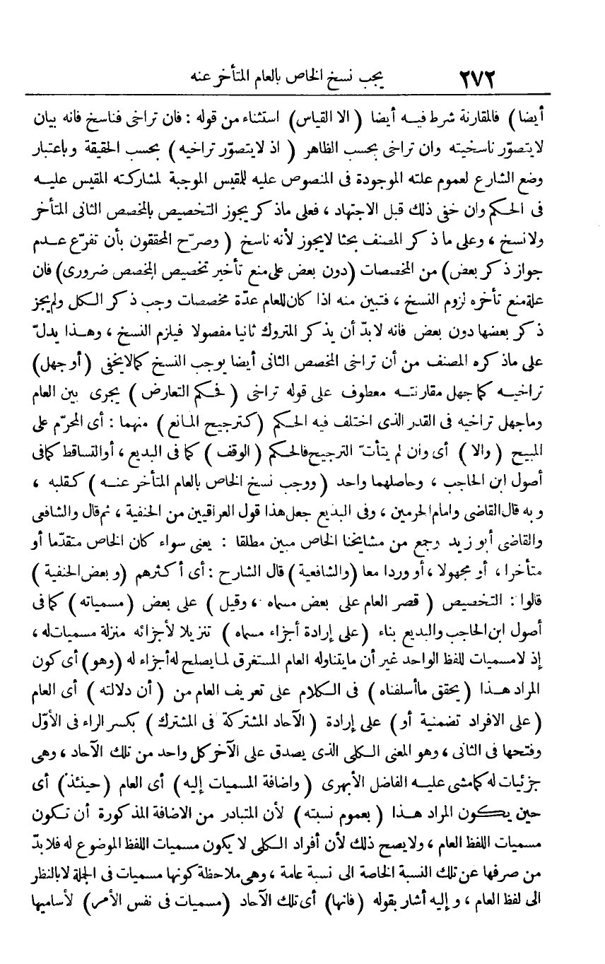 أَيْضا) فالمقارنة شَرط فِيهِ أَيْضا (إِلَّا الْقيَاس) اسْتثِْنَاء من قَوْله: فَإِن تراخي فناسخ فَإِنَّهُ بَيَان لَا يتَصَوَّر ناسخيته وَإِن تراخي بِحَسب الظَّاهِر (إِذْ لَا يتَصَوَّر تراخيه) بِحَسب الْحَقِيقَة وَبِاعْتِبَار وضع الشَّارِع لعُمُوم علته الْمَوْجُودَة فِي الْمَنْصُوص عَلَيْهِ للمقيس الْمُوجبَة لمشاركته الْمَقِيس عَلَيْهِ فِي الحكم وَإِن خَفِي ذَلِك قبل الِاجْتِهَاد، فعلى مَا ذكر يجوز التَّخْصِيص بالمخصص الثَّانِي الْمُتَأَخر وَلَا نسخ، وعَلى مَا ذكر المُصَنّف بحثا لَا يجوز لِأَنَّهُ نَاسخ (وَصرح الْمُحَقِّقُونَ بِأَن تفرع عدم جَوَاز ذكر بعض) من المخصصات (دون بعض على منع تَأْخِير تَخْصِيص الْمُخَصّص ضَرُورِيّ) فَإِن عِلّة منع تَأَخره لُزُوم النّسخ، فَتبين مِنْهُ إِذا كَانَ للعام عدَّة مخصصات وَجب ذكر الْكل وَلم يجز ذكر بَعْضهَا دون بعض فَإِنَّهُ لَا بُد أَن يذكر الْمَتْرُوك ثَانِيًا مَفْصُولًا فَيلْزم النّسخ، وَهَذَا يدل على مَا ذكره المُصَنّف من أَن تراخي الْمُخَصّص الثَّانِي أَيْضا يُوجب النّسخ كَمَا لَا يخفى (أَو جهل) تراخيه كَمَا جهل مقارنته مَعْطُوف على قَوْله تراخي (فَحكم التَّعَارُض) يجْرِي بَين الْعَام وَمَا جهل تراخيه فِي الْقدر الَّذِي اخْتلف فِيهِ الحكم (كترجيح الْمَانِع) مِنْهُمَا: أَي الْمحرم على الْمُبِيح (وَإِلَّا) أَي وَإِن لم يتأت التَّرْجِيح فَالْحكم (الْوَقْف) كَمَا فِي البديع، أَو التساقط كَمَا فِي أصُول ابْن الْحَاجِب، وحاصلهما وَاحِد (وَوَجَب نسخ الْخَاص بِالْعَام الْمُتَأَخر عَنهُ) كقلبه، وَبِه قَالَ القَاضِي وَإِمَام الْحَرَمَيْنِ، وَفِي البديع جعل هَذَا قَول الْعِرَاقِيّين من الْحَنَفِيَّة، ثمَّ قَالَ وَالشَّافِعِيّ وَالْقَاضِي أَبُو زيد وَجمع من مَشَايِخنَا الْخَاص مُبين مُطلقًا: يَعْنِي سَوَاء كَانَ الْخَاص مُتَقَدما أَو مُتَأَخِّرًا، أَو مَجْهُولا، أَو وردا مَعًا (وَالشَّافِعِيَّة) قَالَ الشَّارِح: أَي أَكْثَرهم (وَبَعض الْحَنَفِيَّة) قَالُوا: التَّخْصِيص (قصر الْعَام على بعض مُسَمَّاهُ، وَقيل) على بعض (مسمياته) كَمَا فِي أصُول ابْن الْحَاجِب والبديع بِنَاء (على إِرَادَة أَجزَاء مُسَمَّاهُ) تَنْزِيلا لأجزائه منزلَة مسميات لَهُ، إِذْ لَا مسميات للفظ الْوَاحِد غير أَن مَا يتَنَاوَلهُ الْعَام الْمُسْتَغْرق لما يصلح لَهُ أَجزَاء لَهُ (وَهُوَ) أَي كَون المُرَاد هَذَا (يُحَقّق مَا أسلفناه) فِي الْكَلَام على تَعْرِيف الْعَام من (أَن دلَالَته) أَي الْعَام (على الْأَفْرَاد تضمنية أَو) على إِرَادَة (الْآحَاد الْمُشْتَركَة فِي الْمُشْتَرك) بِكَسْر الرَّاء فِي الأول وَفتحهَا فِي الثَّانِي، وَهُوَ الْمَعْنى الْكُلِّي الَّذِي يصدق على الآخر كل وَاحِد من تِلْكَ الْآحَاد، وَهِي جزئيات لَهُ كَمَا مَشى عَلَيْهِ الْفَاضِل الْأَبْهَرِيّ (وَإِضَافَة المسميات إِلَيْهِ) أَي الْعَام (حِينَئِذٍ) أَي حِين يكون المُرَاد هَذَا (بِعُمُوم نسبته) لِأَن الْمُتَبَادر من الْإِضَافَة الْمَذْكُورَة أَن تكون مسميات اللَّفْظ الْعَام، وَلَا يَصح ذَلِك لِأَن أَفْرَاد الْكُلِّي لَا يكون مسميات اللَّفْظ الْمَوْضُوع لَهُ فَلَا بُد من صرفهَا عَن تِلْكَ النِّسْبَة الْخَاصَّة إِلَى نِسْبَة عَامَّة، وَهِي مُلَاحظَة كَونهَا مسميات فِي الْجُمْلَة لَا بِالنّظرِ إِلَى لفظ الْعَام، وَإِلَيْهِ أَشَارَ بقوله (فَإِنَّهَا) أَي تِلْكَ الْآحَاد (مسميات فِي نفس الْأَمر) لأساميها
