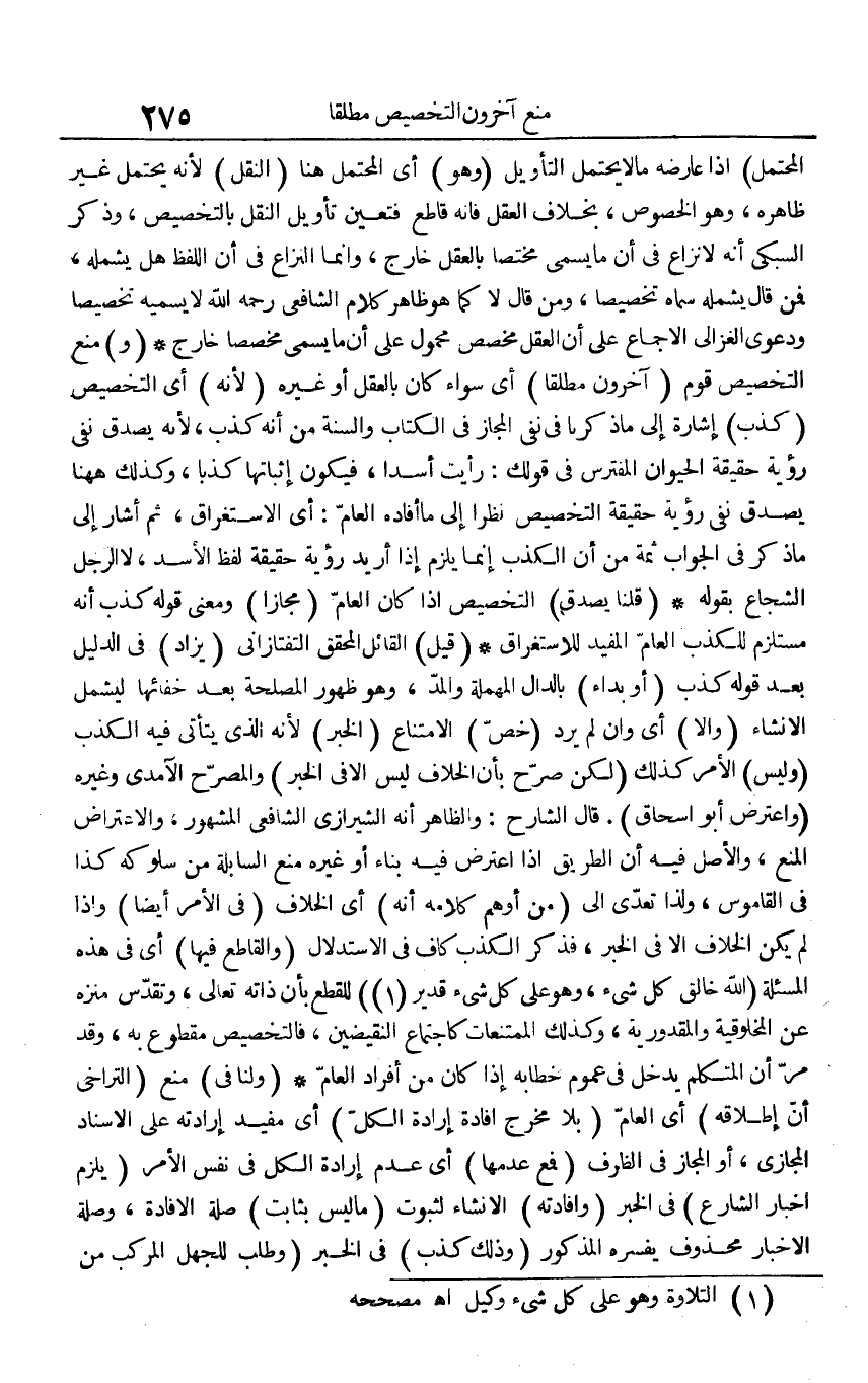 الْمُحْتَمل) إِذا عَارضه مَا لَا يحْتَمل التَّأْوِيل (وَهُوَ) أَي الْمُحْتَمل هُنَا (النَّقْل) لِأَنَّهُ يحْتَمل غير ظَاهره، وَهُوَ الْخُصُوص، بِخِلَاف الْعقل فَإِنَّهُ قَاطع فَتعين تَأْوِيل النَّقْل بالتخصيص، وَذكر السُّبْكِيّ أَنه لَا نزاع فِي أَن مَا يُسمى مُخْتَصًّا بِالْعقلِ خَارج، وَإِنَّمَا النزاع فِي أَن اللَّفْظ هَل يَشْمَلهُ، فَمن قَالَ يَشْمَلهُ سَمَّاهُ تَخْصِيصًا، وَمن قَالَ لَا كَمَا هُوَ ظَاهر كَلَام الشَّافِعِي رَحمَه الله لَا يُسَمِّيه تَخْصِيصًا وَدَعوى الْغَزالِيّ الْإِجْمَاع على أَن الْعقل مُخَصص مَحْمُول على أَن مَا يُسمى مُخَصّصا خَارج (و) منع التَّخْصِيص قوم (آخَرُونَ مُطلقًا) أَي سَوَاء كَانَ بِالْعقلِ أَو غَيره (لِأَنَّهُ) أَي التَّخْصِيص (كذب) إِشَارَة إِلَى مَا ذكرنَا فِي نفي الْمجَاز فِي الْكتاب وَالسّنة من أَنه كذب، لِأَنَّهُ يصدق نفي رُؤْيَة حَقِيقَة الْحَيَوَان المفترس فِي قَوْلك: رَأَيْت أسدا، فَيكون إِثْبَاتهَا كذبا، وَكَذَلِكَ هَهُنَا يصدق نفي رُؤْيَة حَقِيقَة التَّخْصِيص نظرا إِلَى مَا أَفَادَهُ الْعَام: أَي الِاسْتِغْرَاق، ثمَّ أَشَارَ إِلَى مَا ذكر فِي الْجَواب ثمَّة من أَن الْكَذِب إِنَّمَا يلْزم إِذا أُرِيد رُؤْيَة حَقِيقَة لفظ الْأسد، لَا الرجل الشجاع بقوله (قُلْنَا يصدق) التَّخْصِيص إِذا كَانَ الْعَام (مجَازًا) وَمعنى قَوْله كذب أَنه مُسْتَلْزم للكذب الْعَام الْمُفِيد للاستغراق (قيل) الْقَائِل الْمُحَقق التَّفْتَازَانِيّ (يُزَاد) فِي الدَّلِيل بعد قَوْله كذب (أَو بداء) بِالدَّال الْمُهْملَة وَالْمدّ، وَهُوَ ظُهُور الْمصلحَة بعد خفائها ليشْمل الْإِنْشَاء (وَإِلَّا) أَي وَإِن لم يرد (خص) الِامْتِنَاع (الْخَبَر) لِأَنَّهُ الَّذِي يَتَأَتَّى فِيهِ الْكَذِب (وَلَيْسَ) الْأَمر كَذَلِك (لَكِن صرح بِأَن الْخلاف لَيْسَ إِلَّا فِي الْخَبَر) والمصرح الْآمِدِيّ وَغَيره (وَاعْترض أَبُو إِسْحَاق). قَالَ الشَّارِح: وَالظَّاهِر أَنه الشِّيرَازِيّ الشَّافِعِي الْمَشْهُور، والاعتراض الْمَنْع، وَالْأَصْل فِيهِ أَن الطَّرِيق إِذا اعْترض فِيهِ بِنَاء أَو غَيره منع السابلة من سلوكه كَذَا فِي الْقَامُوس، وَلذَا تعدى إِلَى (من أوهم كَلَامه أَنه) أَي الْخلاف (فِي الْأَمر أَيْضا) وَإِذا لم يكن الْخلاف إِلَّا فِي الْخَبَر، فَذكر الْكَذِب كَاف فِي الِاسْتِدْلَال (والقاطع فِيهَا) أَي فِي هَذِه المسئلة (الله خَالق كل شَيْء، وَهُوَ على كل شَيْء قدير) للْقطع بِأَن ذَاته تَعَالَى، وتقدس منزه عَن المخلوقية والمقدورية، وَكَذَلِكَ الممتنعات كاجتماع النقيضين، فالتخصيص مَقْطُوع بِهِ، وَقد مر أَن الْمُتَكَلّم يدْخل فِي عُمُوم خطابه إِذا كَانَ من أَفْرَاد الْعَام (وَلنَا فِي) منع (التَّرَاخِي أَن إِطْلَاقه) أَي الْعَام (بِلَا مخرج إِفَادَة إِرَادَة الْكل) أَي مُفِيد إِرَادَته على الْإِسْنَاد الْمجَازِي، أَو الْمجَاز فِي الظّرْف (فَمَعَ عدمهَا) أَي عدم إِرَادَة الْكل فِي نفس الْأَمر (يلْزم أَخْبَار الشَّارِع) فِي الْخَبَر (وإفادته) الْإِنْشَاء لثُبُوت (مَا لَيْسَ بِثَابِت) صلَة الإفادة، وصلَة الْأَخْبَار مَحْذُوف يفسره الْمَذْكُور (وَذَلِكَ كذب) فِي الْخَبَر (وَطلب للْجَهْل الْمركب من