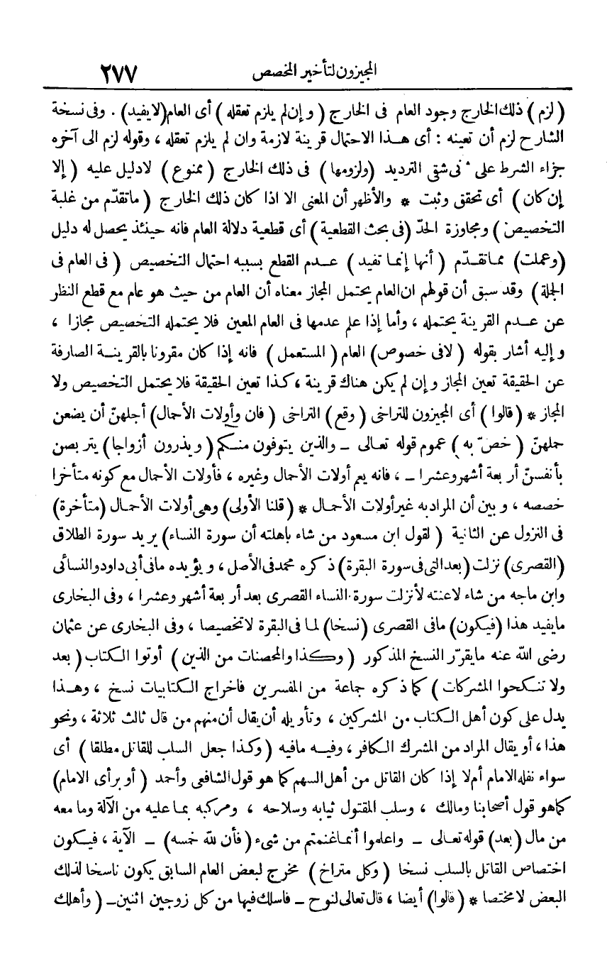 (لزم) ذَلِك الْخَارِج وجود الْعَام فِي الْخَارِج (وَإِن لم يلْزم تعقله) أَي الْعَام (لَا يُفِيد. وَفِي نُسْخَة الشَّارِح لزم أَن تعينه: أَي هَذَا الِاحْتِمَال قرينَة لَازِمَة وَإِن لم يلْزم تعقله، وَقَوله لزم إِلَى آخِره جَزَاء الشَّرْط على ثَانِي شقي الترديد (ولزومها) فِي ذَلِك الْخَارِج (مَمْنُوع) لَا دَلِيل عَلَيْهِ (إِلَّا إِن كَانَ) أَي تحقق وَثَبت وَالْأَظْهَر أَن الْمَعْنى إِلَّا إِذا كَانَ ذَلِك الْخَارِج (مَا تقدم من غَلَبَة التَّخْصِيص) ومجاوزة الْحَد (فِي بحث القطعية) أَي قَطْعِيَّة دلَالَة الْعَام فَإِنَّهُ حِينَئِذٍ يحصل لَهُ دَلِيل (وعملت) مِمَّا تقدم (أَنَّهَا إِنَّمَا تفِيد) عدم الْقطع بِسَبَبِهِ احْتِمَال التَّخْصِيص (فِي الْعَام فِي الْجُمْلَة) وَقد سبق أَن قَوْلهم أَن الْعَام يحْتَمل الْمجَاز مَعْنَاهُ أَن الْعَام من حَيْثُ هُوَ عَام من قطع النّظر عَن عدم الْقَرِينَة يحْتَملهُ، وَأما إِذا علم عدمهَا فِي الْعَام الْمعِين فَلَا يحْتَملهُ التَّخْصِيص مجَازًا، وَإِلَيْهِ أَشَارَ بقوله (لَا فِي خُصُوص) الْعَام (الْمُسْتَعْمل) فَإِنَّهُ إِذا كَانَ مَقْرُونا بِالْقَرِينَةِ الصارفة عَن الْحَقِيقَة تعين الْمجَاز وَإِن لم يكن هُنَاكَ قرينَة، كَذَا تعين الْحَقِيقَة فَلَا يحْتَمل التَّخْصِيص وَلَا الْمجَاز (قَالُوا) أَي المجيزون للتراخي (وَقع) التَّرَاخِي (فَإِن وَأولَات الْأَحْمَال) أَجلهنَّ أَن يَضعن حَملهنَّ (خص بِهِ) عُمُوم قَوْله تَعَالَى - {وَالَّذين يتوفون مِنْكُم ويذرون أَزْوَاجًا يَتَرَبَّصْنَ بِأَنْفُسِهِنَّ أَرْبَعَة أشهر وَعشرا} -، فَإِنَّهُ يعم أولات الْأَحْمَال وَغَيره، فأولات الْأَحْمَال مَعَ كَونه مُتَأَخِّرًا خصصه، وَبَين أَن المُرَاد بِهِ غير أولات الْأَحْمَال (قُلْنَا الأولى) وَهِي أولات الْأَحْمَال (مُتَأَخِّرَة) فِي النُّزُول عَن الثَّانِيَة (لقَوْل ابْن مَسْعُود من شَاءَ باهلته أَن سُورَة النِّسَاء) يُرِيد سُورَة الطَّلَاق (الْقصرى) نزلت (بعدالتي فِي سُورَة الْبَقَرَة) ذكره مُحَمَّد فِي الأَصْل، وَيُؤَيِّدهُ مَا فِي أبي دَاوُد وَالنَّسَائِيّ وَابْن مَاجَه من شَاءَ لَاعَنته لأنزلت سُورَة النِّسَاء الْقصرى بعد أَرْبَعَة أشهر وَعشرا، وَفِي البُخَارِيّ مَا يُفِيد هَذَا (فَيكون) مَا فِي الْقصرى (نسخا) لما فِي الْبَقَرَة لَا تَخْصِيصًا، وَفِي البُخَارِيّ عَن عُثْمَان رَضِي الله عَنهُ مَا يُقرر النّسخ الْمَذْكُور (وَكَذَا وَالْمُحصنَات من الَّذين) أُوتُوا الْكتاب (بعد وَلَا تنْكِحُوا المشركات) كَمَا ذكره جمَاعَة من الْمُفَسّرين فإخراج الكتابيات نسخ، وَهَذَا يدل على كَون أهل الْكتاب من الْمُشْركين، وتأويله أَن يُقَال أَن مِنْهُم من قَالَ ثَالِث ثَلَاثَة، وَنَحْو هَذَا، أَو يُقَال المُرَاد من الْمُشرك الْكَافِر، وَفِيه مَا فِيهِ (وَكَذَا جعل السَّلب للْقَاتِل مُطلقًا) أَي سَوَاء نفله الإِمَام أم لَا إِذا كَانَ الْقَاتِل من أهل السهْم كَمَا هُوَ قَول الشَّافِعِي وَأحمد (أَو بِرَأْي الإِمَام) كَمَا هُوَ قَول أَصْحَابنَا وَمَالك، وسلب الْمَقْتُول ثِيَابه وسلاحه، ومركبه بِمَا عَلَيْهِ من الْآلَة وَمَا مَعَه من مَال (بعد) قَوْله تَعَالَى - {وَاعْلَمُوا أَنما غَنِمْتُم من شَيْء (فَأن لله خمسه}} - الْآيَة، فَيكون اخْتِصَاص الْقَاتِل بالسلب نسخا (وكل متراخ) مخرج لبَعض الْعَام السَّابِق يكون نَاسِخا لذَلِك الْبَعْض لَا مُخْتَصًّا (قَالُوا) أَيْضا، قَالَ تَعَالَى لنوح - {فاسلك فِيهَا من كل زَوْجَيْنِ اثْنَيْنِ} - (وَأهْلك