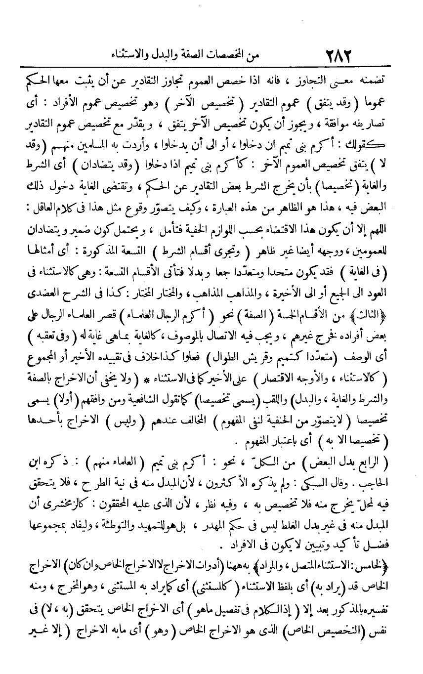 (الثَّالِث) من الْأَقْسَام الْخَمْسَة (الصّفة) نَحْو (أكْرم الرِّجَال الْعلمَاء) قصر الْعلمَاء الرِّجَال على بعض أَفْرَاده فَخرج غَيرهم، وَيجب فِيهِ الِاتِّصَال بالموصوف، كالغاية بِمَا هِيَ غَايَة لَهُ (وَفِي تعقبه) أَي الْوَصْف (مُتَعَددًا كتميم وقريش الطوَال) فعلوا كَذَا خلاف فِي تَقْيِيده الْأَخير أَو الْمَجْمُوع (كالاستثناء، وَالْأَوْجه الِاقْتِصَار) على الْأَخير كَمَا فِي الِاسْتِثْنَاء (وَلَا يخفى أَن الْإِخْرَاج بِالصّفةِ وَالشّرط والغاية، وَالْبدل) واللقب (يُسمى تَخْصِيصًا) كَمَا تَقول الشَّافِعِيَّة وَمن وافقهم (أَولا) يُسمى تَخْصِيصًا (لَا يتَصَوَّر من الْحَنَفِيَّة لنفي الْمَفْهُوم) الْمُخَالف عِنْدهم (وَلَيْسَ) الْإِخْرَاج بأحدها (تَخْصِيصًا إِلَّا بِهِ) أَي بِاعْتِبَار الْمَفْهُوم.
