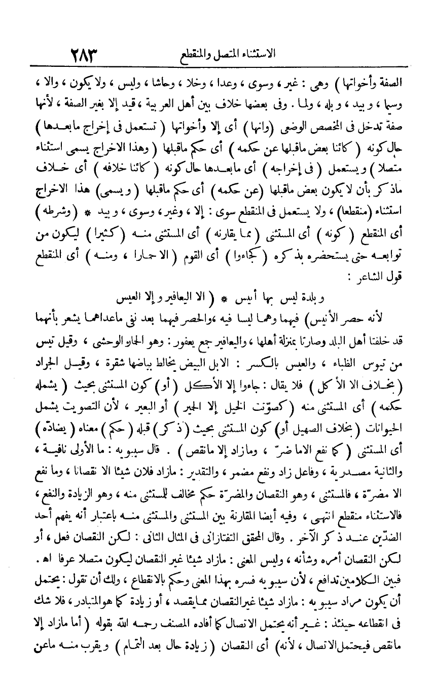 لِأَنَّهُ حصر الأنيس) فيهمَا وهما ليسَا فِيهِ، والحصر فيهمَا بعد نفي مَا عداهما يشْعر بِأَنَّهُمَا قد خلفتا أهل الْبَلَد وصارتا بِمَنْزِلَة أَهلهَا، واليعافير جمع يَعْفُور: وَهُوَ الْحمار الوحشي، وَقيل تَيْس من تيوس الظباء، والعيس بِالْكَسْرِ: الْإِبِل الْبيض يخالط بياضها شقرة، وَقيل الْجَرَاد (بِخِلَاف إِلَّا الْأكل) فَلَا يُقَال: جَاءُوا إِلَّا الْأكل (أَو) كَون الْمُسْتَثْنى بِحَيْثُ (يَشْمَلهُ حكمه) أَي الْمُسْتَثْنى مِنْهُ (كصونت الْخَيل إِلَّا الْحمير) أَو الْبَعِير، لِأَن التصويت يَشْمَل الْحَيَوَانَات (بِخِلَاف الصهيل أَو) كَون الْمُسْتَثْنى بِحَيْثُ (ذكر) قبله (حكم) مَعْنَاهُ (يضاده) أَي الْمُسْتَثْنى (كَمَا نفع إِلَّا مَا ضرّ، وَمَا زَاد إِلَّا مَا نقض). قَالَ سِيبَوَيْهٍ: مَا الأولى نَافِيَة، وَالثَّانيَِة مَصْدَرِيَّة، وفاعل زَاد ونفع مُضْمر، وَالتَّقْدِير: مَا زَاد فلَان شَيْئا إِلَّا نُقْصَانا، وَمَا نفع إِلَّا مضرَّة، فالمستثنى، وَهُوَ النُّقْصَان والمضرة حكم مُخَالف للمستثنى مِنْهُ، وَهُوَ الزِّيَادَة والنفع، فالاستثناء مُنْقَطع انْتهى، وَفِيه أَيْضا الْمُقَارنَة بَين الْمُسْتَثْنى والمستثنى مِنْهُ بِاعْتِبَار أَنه يفهم أحد الضدين عِنْد ذكر الآخر. وَقَالَ الْمُحَقق التَّفْتَازَانِيّ فِي الْمِثَال الثَّانِي: لَكِن النُّقْصَان فعل، أَو لَكِن النُّقْصَان أمره وشأنه، وَلَيْسَ الْمَعْنى: مَا زَاد شَيْئا غير النُّقْصَان ليَكُون مُتَّصِلا عرفا أهـ. فَبين الْكَلَامَيْنِ تدافع، لِأَن سِيبَوَيْهٍ فسره بِهَذَا الْمَعْنى وَحكم بالانقطاع، وَلَك أَن تَقول: يحْتَمل أَن يكون مُرَاد سِيبَوَيْهٍ: مَا زَاد شَيْئا غير النُّقْصَان مِمَّا يقْصد، أَو زِيَادَة كَمَا هُوَ الْمُتَبَادر، فَلَا شكّ فِي انْقِطَاعه حِينَئِذٍ: غير أَنه يحْتَمل الِاتِّصَال كَمَا أَفَادَهُ المُصَنّف رَحمَه الله بقوله (أما مَا زَاد إِلَّا مَا نقص فَيحْتَمل الِاتِّصَال، لِأَنَّهُ) أَي النُّقْصَان (زِيَادَة حَال بعد التَّمام) وَيقرب مِنْهُ مَا عَن
