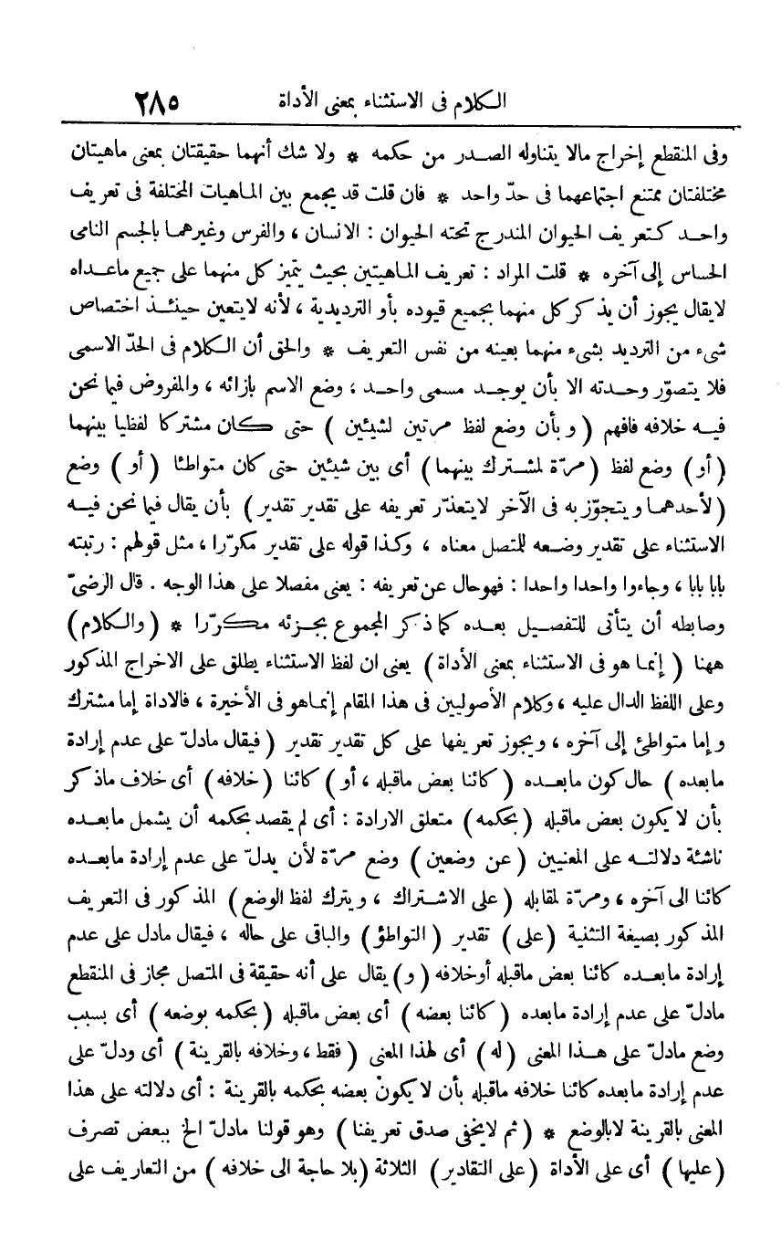 وَفِي الْمُنْقَطع إِخْرَاج مَا لَا يتَنَاوَلهُ الصَّدْر من حكمه وَلَا شكّ أَنَّهُمَا حقيقتان بِمَعْنى ماهيتان مُخْتَلِفَتَانِ مُمْتَنع اجْتِمَاعهمَا فِي حد وَاحِد فَإِن قلت قد يجمع بَين الماهيات الْمُخْتَلفَة فِي تَعْرِيف وَاحِد كتعريف الْحَيَوَان المندرج تَحْتَهُ الْحَيَوَان: الْإِنْسَان، وَالْفرس وَغَيرهمَا بالجسم النامي الحساس إِلَى آخِره قلت المُرَاد: تَعْرِيف الماهيتين بِحَيْثُ يتَمَيَّز كل مِنْهُمَا على جَمِيع مَا عداهُ لَا يُقَال يجوز أَن يذكر كل مِنْهُمَا بِجَمِيعِ قيوده بِأَو الترديدية، لِأَنَّهُ لَا يتَعَيَّن حِينَئِذٍ اخْتِصَاص شَيْء من الترديد بِشَيْء مِنْهُمَا بِعَيْنِه من نفس التَّعْرِيف وَالْحق أَن الْكَلَام فِي الْحَد الأسمى فَلَا يتَصَوَّر وحدته إِلَّا بِأَن يُوجد مُسَمّى وَاحِد، وضع الِاسْم بإزائه، والمفروض فِيمَا نَحن فِيهِ خِلَافه فَافْهَم (وَبِأَن وضع لفظ مرَّتَيْنِ لشيئين) حَتَّى كَانَ مُشْتَركا لفظيا بَينهمَا (أَو) وضع لفظ (مرّة لمشترك بَينهمَا) أَي بَين شَيْئَيْنِ حَتَّى كَانَ متواطئا (أَو) وضع (لأَحَدهمَا ويتجوز بِهِ فِي الآخر لَا يتَعَذَّر تَعْرِيفه على تَقْدِير تَقْدِير) بِأَن يُقَال فِيمَا نَحن فِيهِ الِاسْتِثْنَاء على تَقْدِير وَضعه للمتصل مَعْنَاهُ، وَكَذَا قَوْله على تَقْدِير مكررا، مثل قَوْلهم: رتبته بَابا بَابا، وَجَاءُوا وَاحِدًا وَاحِدًا: فَهُوَ حَال عَن تَعْرِيفه: يَعْنِي مفصلا على هَذَا الْوَجْه. قَالَ الرضي وصابطه أَن يَتَأَتَّى للتفصيل بعده كَمَا ذكر الْمَجْمُوع بجزئه مكررا (وَالْكَلَام) هَهُنَا (إِنَّمَا هُوَ فِي الِاسْتِثْنَاء بِمَعْنى الأداة) يَعْنِي أَن لفظ الِاسْتِثْنَاء يُطلق على الْإِخْرَاج الْمَذْكُور وعَلى اللَّفْظ الدَّال عَلَيْهِ، وَكَلَام الْأُصُولِيِّينَ فِي هَذَا الْمقَام إِنَّمَا هُوَ فِي الْأَخِيرَة، فالأداة إِمَّا مُشْتَرك وَإِمَّا متواطئ إِلَى آخِره، وَيجوز تَعْرِيفهَا على كل تَقْدِير تَقْدِير (فَيُقَال مَا دلّ على عدم إِرَادَة مَا بعده) حَال كَون مَا بعده (كَائِنا بعض مَا قبله، أَو) كَائِنا (خِلَافه) أَي خلاف مَا ذكر بِأَن لَا يكون بعض مَا قبله (بِحكمِهِ) مُتَعَلق الْإِرَادَة: أَي لم يقْصد بِحكمِهِ أَن يَشْمَل مَا بعده ناشئة دلَالَته على الْمَعْنيين (عَن وضعين) وضع مرّة لِأَن يدل على عدم إِرَادَة مَا بعده كَائِنا إِلَى آخِره، وَمرَّة لمقابله (على الِاشْتِرَاك، وَيتْرك لفظ الْوَضع) الْمَذْكُور فِي التَّعْرِيف الْمَذْكُور بِصِيغَة التَّثْنِيَة (على) تَقْدِير (التواطؤ) وَالْبَاقِي على حَاله، فَيُقَال مَا دلّ على عدم إِرَادَة مَا بعده كَائِنا بعض مَا قبله أَو خِلَافه (و) يُقَال على أَنه حَقِيقَة فِي الْمُتَّصِل مجَاز فِي الْمُنْقَطع مَا دلّ على عدم إِرَادَة مَا بعده (كَائِنا بعضه) أَي بعض مَا قبله (بِحكمِهِ بِوَضْعِهِ) أَي بِسَبَب وضع مَا دلّ على هَذَا الْمَعْنى (لَهُ) أَي لهَذَا الْمَعْنى (فَقَط، وخلافه بِالْقَرِينَةِ) أَي وَدلّ على عدم إِرَادَة مَا بعده كَائِنا خِلَافه مَا قبله بِأَن لَا يكون بعضه بِحكمِهِ بِالْقَرِينَةِ: أَي دلَالَته على هَذَا الْمَعْنى بِالْقَرِينَةِ لَا بِالْوَضْعِ (ثمَّ لَا يخفى صدق تعريفنا) وَهُوَ قَوْلنَا مَا دلّ الخ بِبَعْض تصرف (عَلَيْهَا) أَي على الأداة (على التقادير) الثَّلَاثَة (بِلَا حَاجَة إِلَى خِلَافه) من التعاريف على