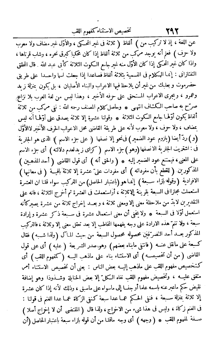 عَن اللُّغَة، إِذْ لَا تركيب من) أَلْفَاظ (ثَلَاثَة فِي غير المحكي، وَالْأول غير مُضَاف وَلَا مُعرب وَلَا حرف) فَعلم أَنه يُوجد مركب من ثَلَاثَة أَلْفَاظ إِذا كَانَ محكيا كبرق نَحره، وشاب قرناها، وَإِذا كَانَ غير المحكى إِذا كَانَ الأول مِنْهُ غير جَامع السُّكُوت الثَّلَاثَة كَأبي عبد الله. قَالَ الْمُحَقق التَّفْتَازَانِيّ: إِنَّمَا الْكَلَام فِي التَّسْمِيَة بِثَلَاثَة أَلْفَاظ فَصَاعِدا إِذا جعلت اسْما وَاحِدًا على طَرِيق حَضرمَوْت وبعلبك من غير أَن يُلَاحظ فِيهَا الْإِعْرَاب وَالْبناء الأصليان، بل يكون بِمَنْزِلَة زيد وَعَمْرو، وَيجْرِي الْإِعْرَاب الْمُسْتَحق على حرفه الْأَخير، وَهَذَا لَيْسَ من لُغَة الْعَرَب بِلَا نزاع صرح بِهِ صَاحب الْكَشَّاف انْتهى وَحَاصِل كَلَام المُصَنّف رَحمَه الله: نفى مركب من ثَلَاثَة أَلْفَاظ يكون أَولهَا جَامع السُّكُوت الثَّلَاثَة وَقَوْلنَا عشرَة إِلَّا ثَلَاثَة يصدق على أَولهَا أَنه لَيْسَ بمضاف، وَلَا حرف، وَلَا مُعرب لِأَنَّهُ على طَريقَة القَاضِي مَحل الْإِعْرَاب الْحَرْف الْأَخير لَا الأول (و) رد أَيْضا (بِلُزُوم عود الضَّمِير) فِي نَحْو إِلَّا نصفهَا (على جُزْء الِاسْم) الَّذِي هُوَ الْجَارِيَة فِي: اشْتريت الْجَارِيَة إِلَّا نصفهَا (وَهُوَ) جُزْء الِاسْم (كزاي زيد لعدم دلَالَته) أَي جُزْء الِاسْم على الْمَعْنى، فَيمْتَنع عود الضَّمِير إِلَيْهِ (وَالْحق أَنه) أَي قَول القَاضِي (أحد المذهبين) الْمَذْكُورين (للْقطع بِأَن مفرداته) أَي مُفْرَدَات عَليّ عشرَة إِلَّا ثَلَاثَة بَاقِيَة (فِي مَعَانِيهَا) الافرادية (وَقَوله بِإِزَاءِ سَبْعَة) إِنَّمَا هُوَ (بِاعْتِبَار الْحَاصِل) من التَّرْكِيب سَوَاء قُلْنَا أَن الْعشْرَة اسْتعْملت مجَازًا فِي السَّبْعَة بِقَرِينَة إِلَّا ثَلَاثَة، أَو اسْتعْملت فِي الْعشْرَة ثمَّ أخرج الثَّلَاثَة، فَإِنَّهُ على التَّقْدِيرَيْنِ لَا بُد من مُلَاحظَة معنى إِلَّا وَمعنى ثَلَاثَة، وَبعد إِخْرَاج ثَلَاثَة من عشرَة يصير كَأَنَّهُ اسْتعْمل أَولا فِي السَّبْعَة وَلَا يخفى أَن معنى اسْتِعْمَال عشرَة فِي سَبْعَة ذكر عشرَة وَإِرَادَة سَبْعَة، وَلَا تتمّ هَذِه الْإِرَادَة على وَجه يفهمها الْمُخَاطب إِلَّا بعد تعقل معنى إِلَّا وَثَلَاثَة، فالتركيب الْمَذْكُور بعد أحد التصرفين محصوله محصول السَّبْعَة من حَيْثُ الْمَآل (وَلذَا شبه) فَقَالَ كسبعة على مَا نقل عَنهُ (فَانْتفى مَا بناه بَعضهم) وَهُوَ صدر الشَّرِيعَة (عَلَيْهِ) أَي على قَول القَاضِي (من أَن تَخْصِيصه) أَي الِاسْتِثْنَاء بِنَاء على مَا ذهب إِلَيْهِ (كمفهوم اللقب) أَي كتخصيص مَفْهُوم اللقب على مَا ذهب إِلَيْهِ بعض النَّاس: يَعْنِي أَن تَخْصِيص الِاسْتِثْنَاء أَمر مُتَّفق عَلَيْهِ، وتخصيض مَفْهُوم اللقب نَفَاهُ الْكل إِلَّا بعض الْحَنَابِلَة وشذوذا وَهُوَ إِضَافَة نقيض حكم مَا عبر عَنهُ باسمه علما أَو جِنْسا إِلَى مَا سواهُ على مَا سبق، وَذَلِكَ لِأَنَّهُ إِذا كَانَ عشرَة إِلَّا ثَلَاثَة بِمَنْزِلَة سَبْعَة، فنفى الحكم عَمَّا عدا سَبْعَة كنفي الزَّكَاة عَمَّا عدا الْغنم فِي قَوْلنَا: فِي الْغنم زَكَاة، وَلَيْسَ فِي هَذَا شَيْء من الْإِخْرَاج، وَلذَا قَالَ (الْمُقْتَضى أَن لَا إِخْرَاج أصلا) صفة لمَفْهُوم اللقب (وَجهه) أَي وَجه مَا قُلْنَا من أَن قَوْله بِإِزَاءِ سَبْعَة بِاعْتِبَار الْحَاصِل (أَن