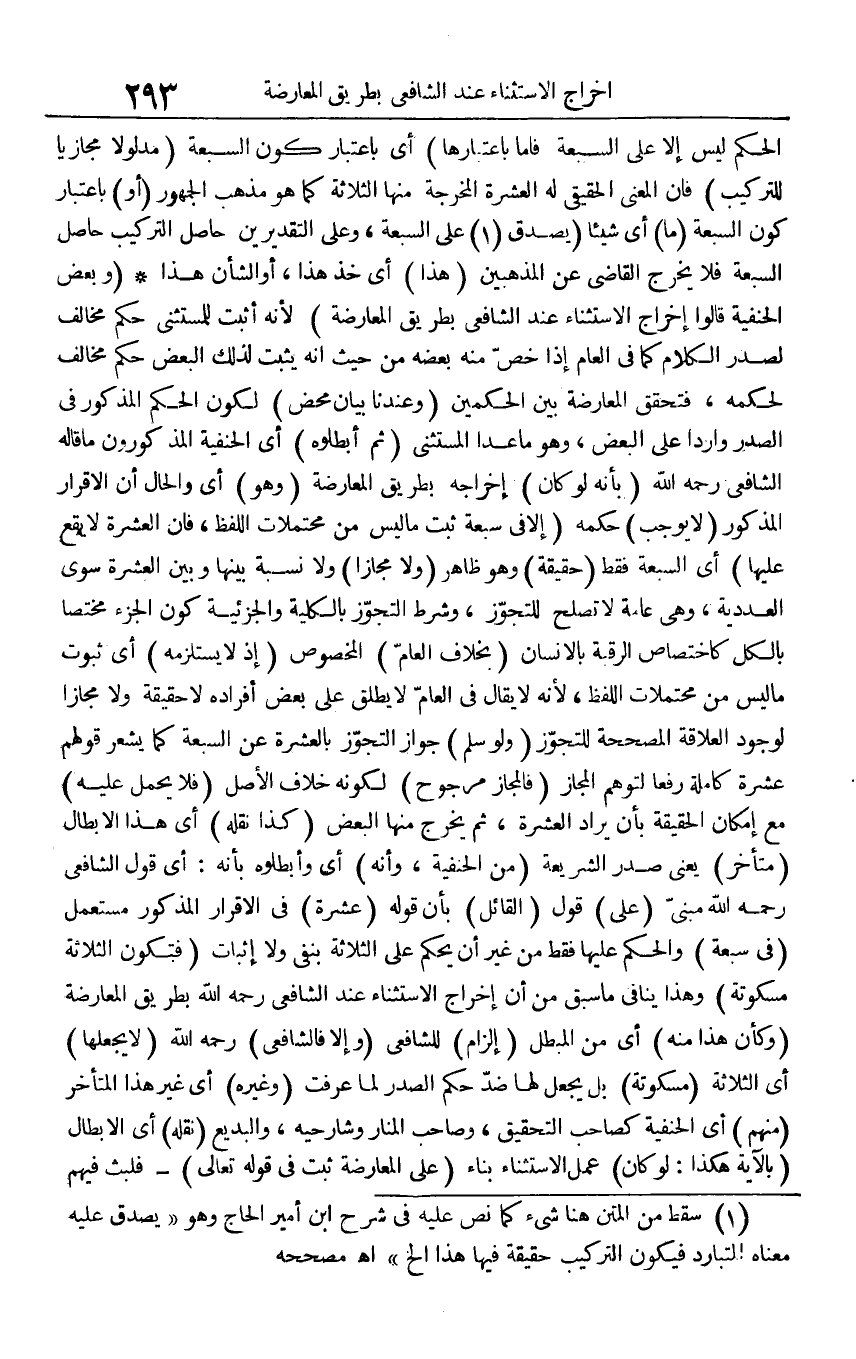 الحكم لَيْسَ إِلَّا على السَّبْعَة فَأَما باعتبارها) أَي بِاعْتِبَار كَون السَّبْعَة (مدلولا مجازيا للتركيب) فَإِن الْمَعْنى الْحَقِيقِيّ لَهُ الْعشْرَة المخرجة مِنْهَا الثَّلَاثَة كَمَا هُوَ مَذْهَب الْجُمْهُور (أَو) بِاعْتِبَار كَون السَّبْعَة (مَا) أَي شَيْئا (يصدق على السَّبْعَة، وعَلى التَّقْدِيرَيْنِ حَاصِل التَّرْكِيب حَاصِل السَّبْعَة فَلَا يخرج القَاضِي على المذهبين (هَذَا) أَي خُذ هَذَا، أَو الشَّأْن هَذَا (وَبَعض الْحَنَفِيَّة قَالُوا إِخْرَاج الِاسْتِثْنَاء عِنْد الشَّافِعِي بطرِيق الْمُعَارضَة) لِأَنَّهُ أثبت للمستثنى حكم مُخَالف لصدر الْكَلَام كَمَا فِي الْعَام إِذا خص مِنْهُ بعضه من حَيْثُ أَنه يثبت لذَلِك الْبَعْض حكم مُخَالف لحكمه، فتحقق الْمُعَارضَة بَين الْحكمَيْنِ (وَعِنْدنَا بَيَان مَحْض) لكَون الحكم الْمَذْكُور فِي الصَّدْر واردا على الْبَعْض، وَهُوَ مَا عدا الْمُسْتَثْنى (ثمَّ أبطلوه) أَي الْحَنَفِيَّة المذكورون مَا قَالَه الشَّافِعِي رَحمَه الله (بِأَنَّهُ لَو كَانَ) إِخْرَاجه بطرِيق الْمُعَارضَة (وَهُوَ) أَي وَالْحَال أَن الْإِقْرَار الْمَذْكُور (لَا يُوجب) حكمه (إِلَّا فِي سَبْعَة ثَبت مَا لَيْسَ من محتملات اللَّفْظ، فَإِن الْعشْرَة لَا يَقع عَلَيْهَا) أَي السَّبْعَة فَقَط (حَقِيقَة) وَهُوَ ظَاهر (وَلَا مجَازًا) وَلَا نِسْبَة بَينهَا وَبَين الْعشْرَة سوى العددية، وَهِي عَامَّة لَا تصلح للتجوز، وَشرط التَّجَوُّز بِالْكُلِّيَّةِ والجزئية كَون الْجُزْء مُخْتَصًّا بِالْكُلِّ كاختصاص الرَّقَبَة بالإنسان (بِخِلَاف الْعَام) الْمَخْصُوص (إِذْ لَا يستلزمه) أَي ثُبُوت مَا لَيْسَ من محتملات اللَّفْظ، لِأَنَّهُ لَا يُقَال فِي الْعَام لَا يُطلق على بعض أَفْرَاده لَا حَقِيقَة وَلَا مجَازًا لوُجُود العلاقة المصححة للتجوز (وَلَو سلم) جَوَاز التَّجَوُّز بِالْعشرَةِ عَن السَّبْعَة كَمَا يشْعر قَوْلهم عشرَة كَامِلَة رفعا لتوهم الْمجَاز (فالمجاز مَرْجُوح) لكَونه خلاف الأَصْل (فَلَا يحمل عَلَيْهِ) مَعَ إِمْكَان الْحَقِيقَة بِأَن يُرَاد الْعشْرَة، ثمَّ يخرج مِنْهَا الْبَعْض (كَذَا نَقله) أَي هَذَا الْإِبْطَال (مُتَأَخّر) يَعْنِي صدر الشَّرِيعَة (من الْحَنَفِيَّة، وَأَنه) أَي وأبطلوه بِأَنَّهُ: أَي قَول الشَّافِعِي رَحمَه الله مَبْنِيّ (على) قَول (الْقَائِل) بِأَن قَوْله (عشرَة) فِي الْإِقْرَار الْمَذْكُور (مُسْتَعْمل (فِي سَبْعَة) وَالْحكم عَلَيْهَا فَقَط من غير أَن يحكم على الثَّلَاثَة بِنَفْي وَلَا إِثْبَات (فَتكون الثَّلَاثَة مسكوتة) وَهَذَا يُنَافِي مَا سبق من أَن إِخْرَاج الِاسْتِثْنَاء عِنْد الشَّافِعِي رَحمَه الله بطرِيق الْمُعَارضَة (وَكَأن هَذَا مِنْهُ) أَي من الْمُبْطل (إِلْزَام) للشَّافِعِيّ (وَإِلَّا فالشافعي) رَحمَه الله (لَا يَجْعَلهَا) أَي الثَّلَاثَة (مسكوتة) بل يَجْعَل لَهَا ضد حكم الصَّدْر لما عرفت (وَغَيره) أَي غير هَذَا الْمُتَأَخر (مِنْهُم) أَي الْحَنَفِيَّة كصاحب التَّحْقِيق، وَصَاحب الْمنَار وشارحيه، والبديع (نَقله) أَي الْإِبْطَال (بِالْآيَةِ هَكَذَا: لَو كَانَ) عمل الِاسْتِثْنَاء بِنَاء (على الْمُعَارضَة ثَبت فِي قَوْله تَعَالَى) - (فَلبث فيهم