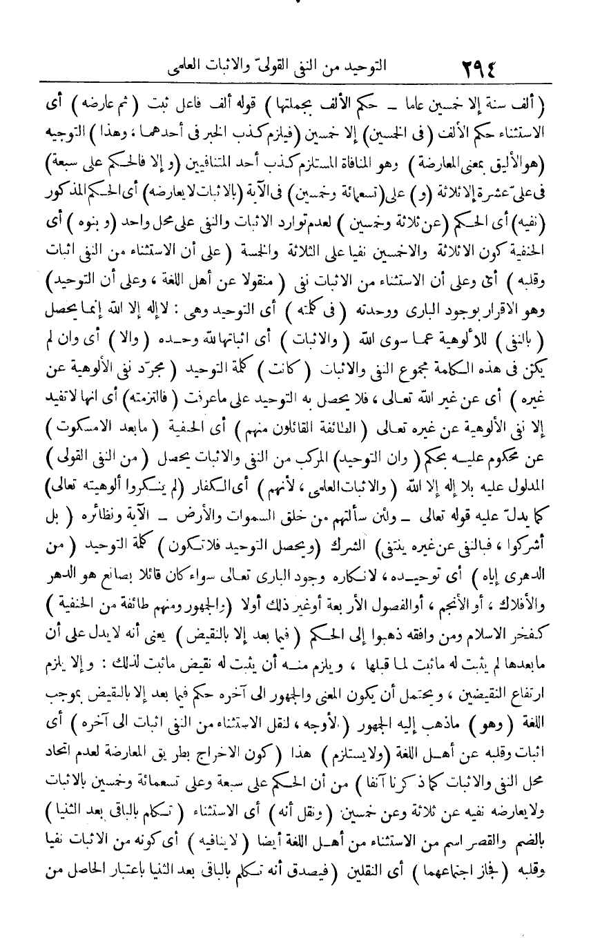 (ألف سنة إِلَّا خمسين عَاما)} - حكم الْألف بجملتها) قَوْله ألف فَاعل ثَبت (ثمَّ عَارضه) أَي الِاسْتِثْنَاء حكم االألف (فِي الْخمسين) إِلَّا خمسين (فَيلْزم كذب الْخَبَر فِي أَحدهمَا، وَهَذَا) التَّوْجِيه (هُوَ الْأَلْيَق بِمَعْنى الْمُعَارضَة) وَهُوَ الْمُنَافَاة المستلزم كذب أحد المتنافيين (وَإِلَّا فَالْحكم على سَبْعَة) فِي عَليّ عشرَة إِلَّا ثَلَاثَة (و) على (تِسْعمائَة وَخمسين) فِي الْآيَة (بالإثبات لَا يُعَارضهُ) أَي الحكم الْمَذْكُور (نَفْيه) أَي الحكم (عَن ثَلَاثَة وَخمسين) لعدم توارد الْإِثْبَات وَالنَّفْي على مَحل وَاحِد (وَبَنوهُ) أَي الْحَنَفِيَّة كَون إِلَّا ثَلَاثَة وَإِلَّا خمسين نفيا على الثَّلَاثَة والخمسة (على أَن الِاسْتِثْنَاء من النَّفْي إِثْبَات وَقَلبه) أَي وعَلى أَن الِاسْتِثْنَاء من الْإِثْبَات نفي (مَنْقُولًا عَن أهل اللُّغَة، وعَلى أَن التَّوْحِيد) وَهُوَ الْإِقْرَار بِوُجُود الْبَارِي ووحدته (فِي كَلمته) أَي التَّوْحِيد وَهِي: لَا إِلَه إِلَّا الله إِنَّمَا يحصل (بِالنَّفْيِ) للألوهية عَمَّا سوى الله (وَالْإِثْبَات) أَي إِثْبَاتهَا لله وَحده (وَإِلَّا) أَي وَإِن لم يكن فِي هَذِه الْكَلِمَة مَجْمُوع النَّفْي وَالْإِثْبَات (كَانَت) كلمة التَّوْحِيد (مُجَرّد نفي الألوهية عَن غَيره) أَي عَن غير الله تَعَالَى، فَلَا يحصل بِهِ التَّوْحِيد على مَا عرفت (فالتزمته) أَي أَنَّهَا لَا تفِيد إِلَّا نفي الألوهية عَن غَيره تَعَالَى (الطَّائِفَة الْقَائِلُونَ مِنْهُم) أَي الْحَنَفِيَّة (مَا بعد إِلَّا مسكوت) عَن مَحْكُوم عَلَيْهِ بِحكم (وَإِن التَّوْحِيد) الْمركب من النَّفْي وَالْإِثْبَات يحصل (من النَّفْي القولي) الْمَدْلُول عَلَيْهِ بِلَا إِلَه إِلَّا الله (وَالْإِثْبَات العلمي لأَنهم) أَي الْكفَّار (لم ينكروا ألوهيته تَعَالَى) كَمَا يدل عَلَيْهِ قَوْله تَعَالَى - {وَلَئِن سَأَلتهمْ من خلق السَّمَوَات وَالْأَرْض} - الْآيَة ونظائره (بل أشركوا، فبالنفي عَن غَيره ينتفى) الشّرك (وَيحصل التَّوْحِيد فَلَا تكون) كلمة التَّوْحِيد (من الدهري إِيَّاه) أَي توحيده، لإنكاره وجود الْبَارِي تَعَالَى سَوَاء كَانَ قَائِلا بصانع هُوَ الدَّهْر والأفلاك، أَو الأنجم، أَو الْفُصُول الْأَرْبَعَة أَو غير ذَلِك أَولا (وَالْجُمْهُور وَمِنْهُم طَائِفَة من الْحَنَفِيَّة) كفخر الْإِسْلَام وَمن وَافقه ذَهَبُوا إِلَى الحكم (فِيمَا بعد إِلَّا بالنقيض) يَعْنِي أَنه لَا يدل على أَن مَا بعْدهَا لم يثبت لَهُ مَا ثَبت لما قبلهَا، وَيلْزم مِنْهُ أَن يثبت لَهُ نقيض مَا ثَبت لذَلِك: وَإِلَّا يلْزم ارْتِفَاع النقيضين، وَيحْتَمل أَن يكون الْمَعْنى وَالْجُمْهُور إِلَى آخِره حكم فِيمَا بعد إِلَّا بالنقيض بِمُوجب اللُّغَة (وَهُوَ) مَا ذهب إِلَيْهِ الْجُمْهُور (الْأَوْجه، لنقل الِاسْتِثْنَاء من النَّفْي إِثْبَات إِلَى آخِره) أَي إِثْبَات وَقَلبه عَن أهل اللُّغَة (وَلَا يسْتَلْزم) هَذَا (كَون الْإِخْرَاج بطرِيق الْمُعَارضَة لعدم اتِّحَاد مَحل النَّفْي وَالْإِثْبَات كَمَا ذكرنَا آنِفا) من أَن الحكم على سَبْعَة وعَلى تِسْعمائَة وَخمسين بالإثبات وَلَا يُعَارضهُ نَفْيه عَن ثَلَاثَة وَعَن خمسين (وَنقل أَنه) أَي الِاسْتِثْنَاء (تكلم بِالْبَاقِي بعد الثنيا) بِالضَّمِّ وَالْقصر اسْم من الِاسْتِثْنَاء من أهل اللُّغَة أَيْضا (لَا يُنَافِيهِ) أَي كَونه من الْإِثْبَات نفيا وَقَلبه (فَجَاز اجْتِمَاعهمَا) أَي النقلين (فَيصدق أَنه تكلم بِالْبَاقِي بعد الثنيا بِاعْتِبَار الْحَاصِل من
