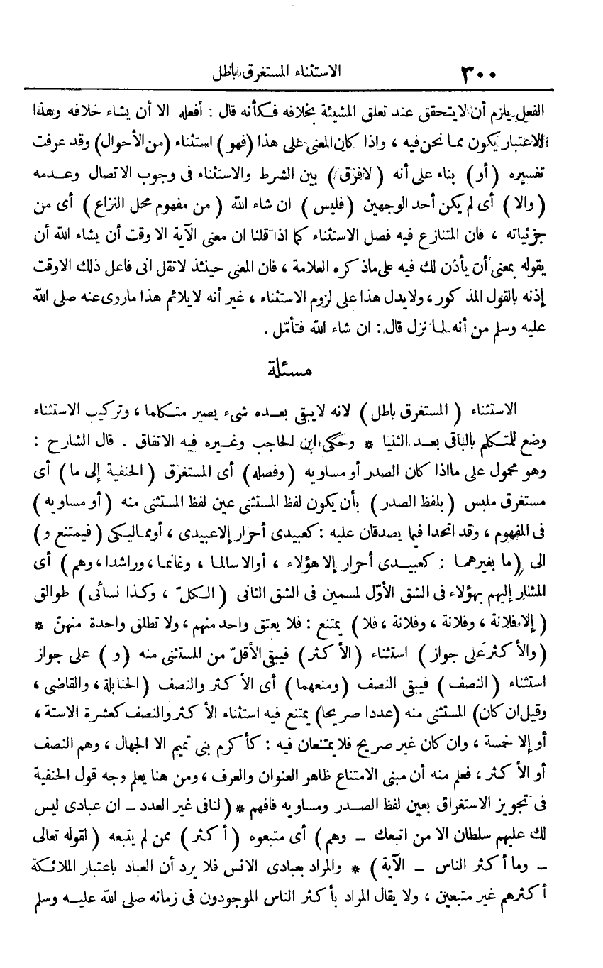 الِاسْتِثْنَاء (الْمُسْتَغْرق بَاطِل) لِأَنَّهُ لَا يبْقى بعده شَيْء يصير متكلما، وتركيب الِاسْتِثْنَاء وضع للمتكلم بِالْبَاقِي بعد الثنيا وَحكى ابْن الْحَاجِب وَغَيره فِيهِ الِاتِّفَاق. قَالَ الشَّارِح: وَهُوَ مَحْمُول على مَا إِذا كَانَ الصَّدْر أَو مساويه (وفصله) أَي الْمُسْتَغْرق (الْحَنَفِيَّة إِلَى مَا) أَي مُسْتَغْرق ملبس (بِلَفْظ الصَّدْر) بِأَن يكون لفظ الْمُسْتَثْنى عين لفظ الْمُسْتَثْنى مِنْهُ (أَو مساويه) فِي الْمَفْهُوم، وَقد اتحدا فِيمَا يصدقان عَلَيْهِ: كعبيدي أَحْرَار إِلَّا عَبِيدِي، أَو مماليكي (فَيمْتَنع و) إِلَى (مَا بِغَيْرِهِمَا: كعبيدي أَحْرَار إِلَّا هَؤُلَاءِ، أَو إِلَّا سالما، وغانما، وراشدا، وهم) أَي الْمشَار إِلَيْهِم بهؤلاء فِي الشق الأول لمسمين فِي الشق الثَّانِي (الْكل، وَكَذَا نسَائِي) طَوَالِق (إِلَّا فُلَانَة، وفلانة، وفلانة، فَلَا) يمْتَنع: فَلَا يعْتق وَاحِد مِنْهُم، وَلَا تطلق وَاحِدَة مِنْهُنَّ (وَالْأَكْثَر على جَوَاز) اسْتثِْنَاء (الْأَكْثَر) فَيبقى الْأَقَل من الْمُسْتَثْنى مِنْهُ (و) على جَوَاز اسْتثِْنَاء (النّصْف) فَيبقى النّصْف (ومنعهما) أَي الْأَكْثَر وَالنّصف (الْحَنَابِلَة، وَالْقَاضِي، وَقيل إِن كَانَ (الْمُسْتَثْنى مِنْهُ (عددا صَرِيحًا) يمْتَنع فِيهِ اسْتثِْنَاء الْأَكْثَر وَالنّصف كعشرة إِلَّا سِتَّة، أَو إِلَّا خَمْسَة، وَإِن كَانَ غير صَرِيح فَلَا يمتنعان فِيهِ: كأكرم بني تَمِيم إِلَّا الْجُهَّال، وهم النّصْف أَو الْأَكْثَر، فَعلم مِنْهُ أَن مَبْنِيّ الِامْتِنَاع ظَاهر العنوان وَالْعرْف، وَمن هُنَا يعلم وَجه قَول الْحَنَفِيَّة فِي تَجْوِيز الِاسْتِغْرَاق بِعَين لفظ الصَّدْر ومساويه فَافْهَم (لنا فِي غير الْعدَد - {إِن عبَادي لَيْسَ لَك عَلَيْهِم سُلْطَان إِلَّا من اتبعك} - وهم) أَي متبعوه (أَكثر) مِمَّن لم يتبعهُ (لقَوْله تَعَالَى - {وَمَا أَكثر النَّاس} - الْآيَة) وَالْمرَاد بعبادي الْإِنْس فَلَا يرد أَن الْعباد بِاعْتِبَار الْمَلَائِكَة أَكْثَرهم غير متبعين، وَلَا يُقَال المُرَاد بِأَكْثَرَ النَّاس الموجودون فِي زَمَانه صلى الله عَلَيْهِ وَسلم