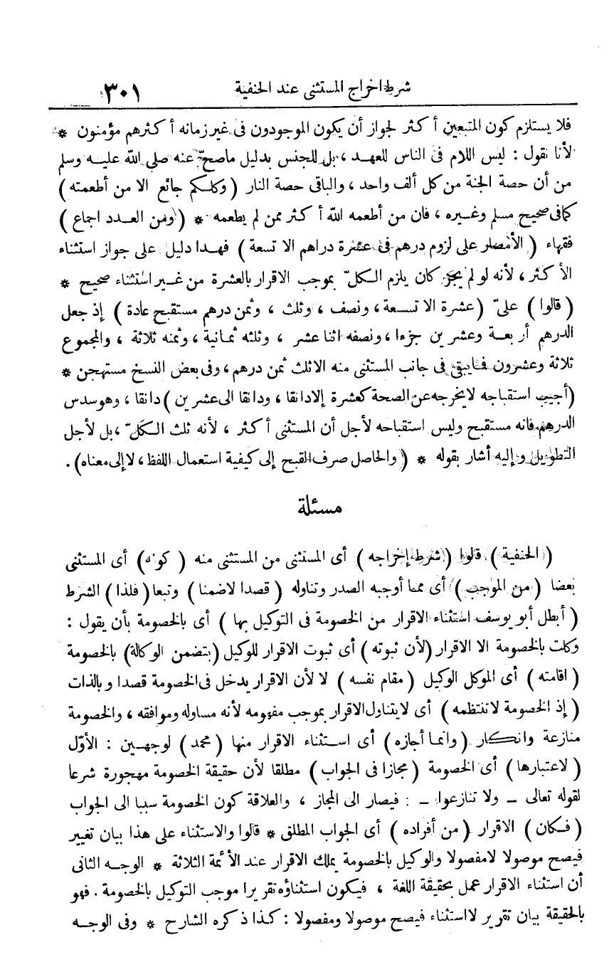 (الْحَنَفِيَّة) قَالُوا (شَرط إِخْرَاجه) أَي المستنثى من الْمُسْتَثْنى مِنْهُ (كَونه) أَي الْمُسْتَثْنى بَعْضًا (من الْمُوجب) أَي مِمَّا أوجبه الصَّدْر وتناوله (قصدا لَا ضمنا) وتبعا (فَلِذَا) الشَّرْط (أبطل أَبُو يُوسُف اسْتثِْنَاء الْإِقْرَار من الْخُصُومَة فِي التَّوْكِيل بهَا) أَي بِالْخُصُومَةِ بِأَن يَقُول: وكلت بِالْخُصُومَةِ إِلَّا الْإِقْرَار (لِأَن ثُبُوته) أَي ثُبُوت الْإِقْرَار للْوَكِيل (بتضمن الْوكَالَة) بِالْخُصُومَةِ (إِقَامَته) أَي الْمُوكل الْوَكِيل (مقَام نَفسه) لَا لِأَن الْإِقْرَار يدْخل فِي الْخُصُومَة قصدا وبالذات (إِذْ الْخُصُومَة لَا تنتظمه) أَي لَا يتَنَاوَل الْإِقْرَار بِمُوجب مَفْهُومه لِأَنَّهُ مسَاوٍ لَهُ وموافقه، وَالْخُصُومَة مُنَازعَة وإنكار (وَإِنَّمَا أجَازه) أَي اسْتثِْنَاء الْإِقْرَار مِنْهَا (مُحَمَّد) لوَجْهَيْنِ: الأول (لاعتبارها) أَي الْخُصُومَة (مجَازًا فِي الْجَواب) مُطلقًا لِأَن حَقِيقَة الْخُصُومَة مهجورة شرعا لقَوْله تَعَالَى - {وَلَا تنازعوا} -: فيصار إِلَى الْمجَاز، والعلاقة كَون الْخُصُومَة سَببا إِلَى الجوانب (فَكَانَ) الاقرار (من أَفْرَاده) أَي الْجَواب الْمُطلق قَالُوا وَالِاسْتِثْنَاء على هَذَا بَيَان تَغْيِير فَيصح مَوْصُولا لَا مَفْصُولًا وَالْوَكِيل بِالْخُصُومَةِ يملك الْإِقْرَار عِنْد الْأَئِمَّة الثَّلَاثَة الْوَجْه الثَّانِي أَن اسْتثِْنَاء الْإِقْرَار عمل بِحَقِيقَة اللُّغَة، فَيكون اسْتِثْنَاؤُهُ تقريرا مُوجب التَّوْكِيل بِالْخُصُومَةِ. فَهُوَ بِالْحَقِيقَةِ بَيَان تَقْرِير لَا اسْتثِْنَاء فَيصح مَوْصُولا ومفصولا: كَذَا ذكره الشَّارِح وَفِي الْوَجْه
