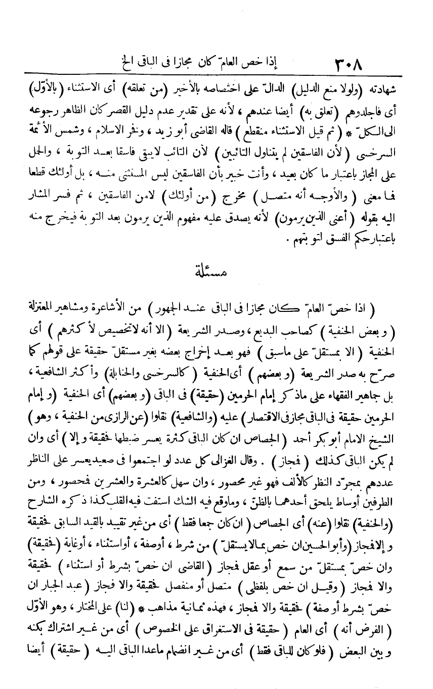 (إِذا خص الْعَام كَانَ مجَازًا فِي الْبَاقِي عِنْد الْجُمْهُور) من الأشاعرة ومشاهير الْمُعْتَزلَة (وَبَعض الْحَنَفِيَّة) كصاحب البديع، وَصدر الشَّرِيعَة (إِلَّا أَنه لَا تَخْصِيص لأكثرهم) أَي الْحَنَفِيَّة (إِلَّا بمستقل على مَا سبق) فَهُوَ بعد إِخْرَاج بعضه بِغَيْر مُسْتَقل حَقِيقَة على قَوْلهم كَمَا صرح بِهِ صدر الشَّرِيعَة (وَبَعْضهمْ) أَي الْحَنَفِيَّة (كالسرخسي والحنابلة) وَأكْثر الشَّافِعِيَّة، بل جَمَاهِير الْفُقَهَاء على مَا ذكر إِمَام الْحَرَمَيْنِ (حَقِيقَة) فِي الْبَاقِي (وَبَعْضهمْ) أَي الْحَنَفِيَّة (وَإِمَام الْحَرَمَيْنِ حَقِيقَة فِي الْبَاقِي مجَاز فِي الِاقْتِصَار) عَلَيْهِ (وَالشَّافِعِيَّة) نقلوا (عَن الرَّازِيّ من الْحَنَفِيَّة، وَهُوَ) الشَّيْخ الإِمَام أَبُو بكر أَحْمد (الْجَصَّاص إِن كَانَ الْبَاقِي كَثْرَة يعسر ضَبطهَا فحقيقة وَإِلَّا) أَي وَإِن لم يكن الْبَاقِي كَذَلِك (فمجاز). وَقَالَ الْغَزالِيّ كل عدد لَو اجْتَمعُوا فِي صَعِيد يعسر على النَّاظر عَددهمْ بِمُجَرَّد النّظر كالألف فَهُوَ غير مَحْصُور، وَإِن سهل كالعشرة وَالْعِشْرين فمحصور، وَمن الطَّرفَيْنِ أوساط يلْحق أَحدهمَا بِالظَّنِّ، وَمَا وَقع فِيهِ الشَّك استفت فِيهِ الْقلب كَذَا ذكره الشَّارِح (وَالْحَنَفِيَّة) نقلوا (عَنهُ) أَي الْجَصَّاص (إِن كَانَ جمعا فَقَط) أَي من غير تَقْيِيد بالقيد السَّابِق فحقيقة وَإِلَّا بمجاز (وَأَبُو الْحُسَيْن إِن خص بِمَا لَا يسْتَقلّ) من شَرط، أَو صفة، أَو اسْتثِْنَاء) أَو غَايَة (فحقيقة) وَإِن خص بمستقل من سمع أَو عقل فمجاز (القَاضِي إِن خص بِشَرْط أَو اسْتثِْنَاء) فحقيقة وَإِلَّا فمجاز (وَقيل إِن خص بلفظي) مُتَّصِل أَو مُنْفَصِل فحقيقة وَإِلَّا فمجاز (عبد الْجَبَّار أَن خص بِشَرْط أَو صفة) فحقيقة وَإِلَّا فمجاز، فَهَذِهِ ثَمَانِيَة مَذَاهِب (لنا) على الْمُخْتَار، وَهُوَ الأول (الْفَرْض أَنه) أَي الْعَام (حَقِيقَة فِي الِاسْتِغْرَاق على الْخُصُوص) أَي من غير اشْتِرَاك بكنه وَبَين الْبَعْض (فَلَو كَانَ للْبَاقِي فَقَط) أَي من غير انضمام مَا عدا الْبَاقِي إِلَيْهِ (حَقِيقَة) أَيْضا