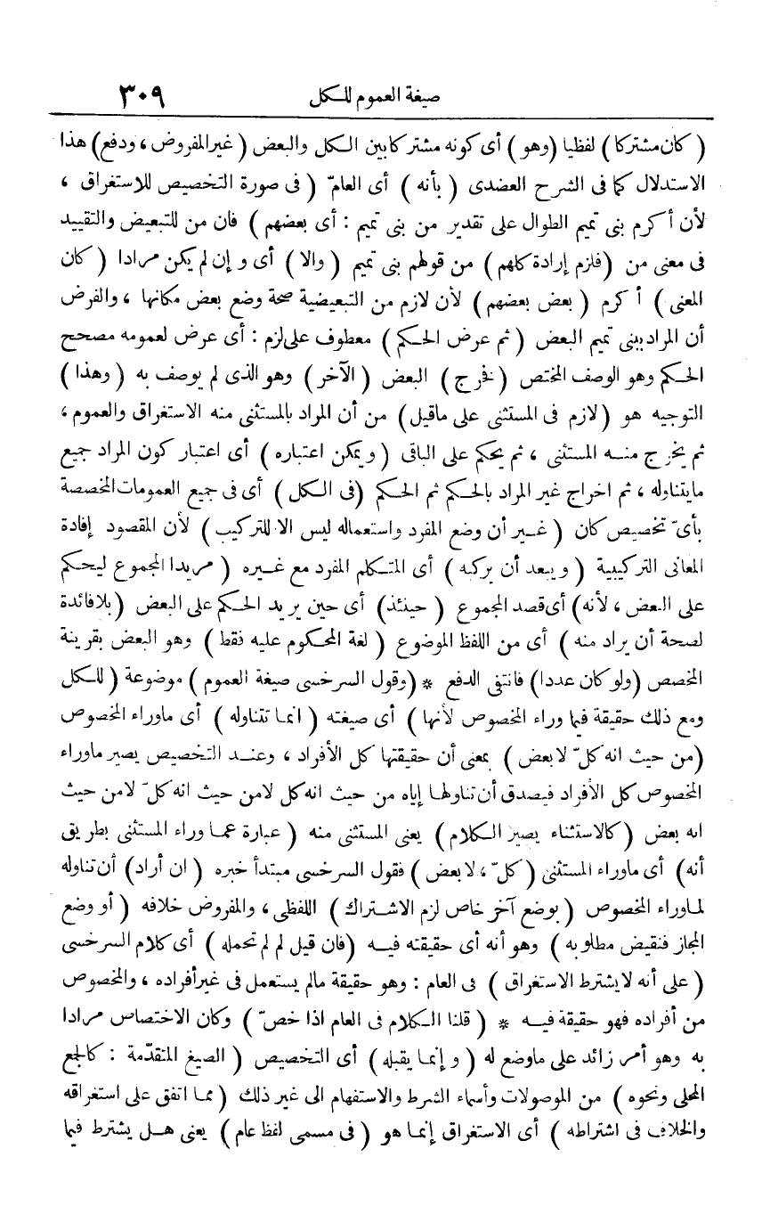 (كَانَ مُشْتَركا) لفظيا (وَهُوَ) أَي كَونه مُشْتَركا بَين الْكل وَالْبَعْض (غير الْمَفْرُوض، وَدفع) هَذَا الِاسْتِدْلَال كَمَا فِي الشَّرْح العضدي (بِأَنَّهُ) أَي الْعَام (فِي صُورَة التَّخْصِيص للاستغراق، لِأَن أكْرم بني تَمِيم الطوَال على تَقْدِير من بني تَمِيم: أَي بَعضهم) فَإِن من للتَّبْعِيض وَالتَّقْيِيد فِي معنى من (فَلَزِمَ إِرَادَة كلهم) من قَوْلهم بني تَمِيم (وَإِلَّا) أَي وَإِن لم يكن مرَادا (كَانَ الْمَعْنى) أكْرم (بعض بَعضهم) لِأَن لَازم من التبعيضية صِحَة وضع بعض مَكَانهَا، وَالْفَرْض أَن المُرَاد ببني تَمِيم الْبَعْض (ثمَّ عرض الحكم) مَعْطُوف على لزم: أَي عرض لعمومه مصحح الحكم وَهُوَ الْوَصْف الْمُخْتَص (فَخرج) الْبَعْض (الآخر) وَهُوَ الَّذِي لم ويصف بِهِ (وَهَذَا) التَّوْجِيه هُوَ (لَازم فِي الْمُسْتَثْنى على مَا قيل) من أَن المُرَاد بالمستثنى مِنْهُ الِاسْتِغْرَاق والعموم، ثمَّ يخرج مِنْهُ الْمُسْتَثْنى، ثمَّ يحكم على الْبَاقِي (وَيُمكن اعْتِبَاره) أَي اعْتِبَار كَون المُرَاد جَمِيع مَا يتَنَاوَلهُ، ثمَّ إِخْرَاج غير المُرَاد بالحكم ثمَّ الحكم (فِي الْكل) أَي فِي جَمِيع العمومات المخصصة بِأَيّ تَخْصِيص كَانَ (غير أَن وضع الْمُفْرد واستعماله لَيْسَ إِلَّا للتركيب) لِأَن الْمَقْصُود إِفَادَة الْمعَانِي التركيبية (وَيبعد أَن يركبه) أَي الْمُتَكَلّم الْمُفْرد مَعَ غَيره (مرِيدا الْمَجْمُوع ليحكم على الْبَعْض، لِأَنَّهُ) أَي قصد الْمَجْمُوع (حِينَئِذٍ) أَي حِين يُرِيد الحكم على الْبَعْض (بِلَا فَائِدَة لصِحَّة أَن يُرَاد مِنْهُ) أَي من اللَّفْظ الْمَوْضُوع (لُغَة الْمَحْكُوم عَلَيْهِ فَقَط) وَهُوَ الْبَعْض بِقَرِينَة الْمُخَصّص (وَلَو كَانَ عددا) فَانْتفى الدّفع (وَقَول السَّرخسِيّ صِيغَة الْعُمُوم) مَوْضُوعَة (للْكُلّ وَمَعَ ذَلِك حَقِيقَة فِيمَا وَرَاء الْمَخْصُوص لِأَنَّهَا) أَي صيغته (إِنَّمَا تتناوله) أَي مَا وَرَاء الْمَخْصُوص (من حَيْثُ أَنه كل لَا بعض) بِمَعْنى أَن حَقِيقَتهَا كل الْأَفْرَاد، وَعند التَّخْصِيص يصير مَا وَرَاء الْمَخْصُوص كل الْأَفْرَاد فَيصدق أَن تنَاولهَا إِيَّاه من حَيْثُ أَنه كل لَا من حَيْثُ أَنه كل لَا من حَيْثُ أَنه بعض (كالاستثناء يصير الْكَلَام) يَعْنِي الْمُسْتَثْنى مِنْهُ (عبارَة عَمَّا وَرَاء الْمُسْتَثْنى بطرِيق أَنه) أَي مَا وَرَاء الْمُسْتَثْنى (كل، لَا بعض) فَقَوْل السَّرخسِيّ مُبْتَدأ خَبره (إِن أَرَادَ) أَن تنَاوله لما وَرَاء الْمَخْصُوص (بِوَضْع آخر خَاص لزم الِاشْتِرَاك) اللَّفْظِيّ، والمفروض خِلَافه (أَو وضع الْمجَاز فنقيض مَطْلُوبه) وَهُوَ أَنه أَي حَقِيقَته فِيهِ (فَإِن قيل لم لم تحمله) أَي كَلَام السَّرخسِيّ (على أَنه لَا يشْتَرط الِاسْتِغْرَاق) فِي الْعَام: وَهُوَ حَقِيقَة مَا لم يسْتَعْمل فِي غير أَفْرَاده، والمخصوص من أَفْرَاده فَهُوَ حَقِيقَة فِيهِ (قُلْنَا الْكَلَام فِي الْعَام إِذا خص) وَكَانَ الِاخْتِصَاص مرَادا بِهِ وَهُوَ أَمر زَائِد على مَا وضع لَهُ (وَإِنَّمَا يقبله) أَي التَّخْصِيص (الصِّيَغ الْمُتَقَدّمَة: كالجمع الْمحلي وَنَحْوه) من الموصولات وَأَسْمَاء الشَّرْط والاستفهام إِلَى غير ذَلِك (مِمَّا اتّفق على استغراقه وَالْخلاف فِي اشْتِرَاطه) أَي الِاسْتِغْرَاق إِنَّمَا هُوَ (فِي مُسَمّى لفظ عَام) يَعْنِي هَل يشْتَرط فِيمَا