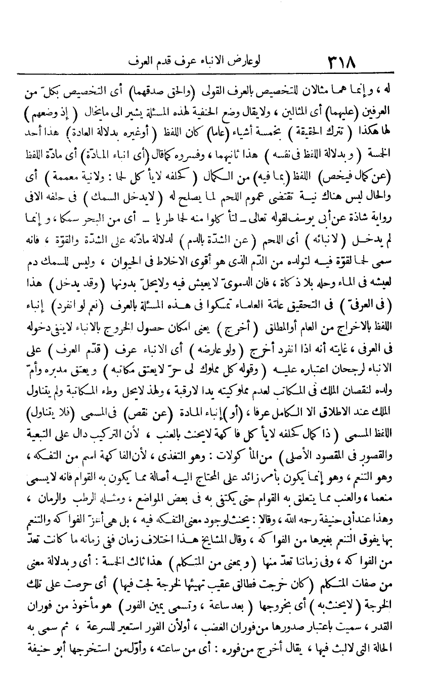 لَهُ، وَإِنَّمَا هما مثالان للتخصيص بِالْعرْفِ القولي (وَالْحق صدقهما) أَي التَّخْصِيص بِكُل من العرفين (عَلَيْهِمَا) أَي المثالين، وَلَا يُقَال وضع الْحَنَفِيَّة لهَذِهِ المسئلة يُشِير إِلَى مَا يخال (إِذْ وضعهم) لَهَا هَكَذَا (تتْرك الْحَقِيقَة) بِخَمْسَة أَشْيَاء (عَاما) كَانَ اللَّفْظ (أَو غَيره بِدلَالَة الْعَادة) هَذَا أحد الْخَمْسَة (وبدلالة اللَّفْظ فِي نَفسه) هَذَا ثَانِيهمَا، وفسروه كَمَا قَالَ (أَي إنباء الْمَادَّة) أَي مَادَّة اللَّفْظ (عَن كَمَال فيخص) اللَّفْظ (بِمَا فِيهِ) من الْكَمَال (كحلفه لَا يَأْكُل لَحْمًا: وَلَا نِيَّة معممة) أَي وَالْحَال لَيْسَ هُنَاكَ نِيَّة تَقْتَضِي عُمُوم اللَّحْم لما يصلح لَهُ (لَا يدْخل السّمك) فِي حلفه إِلَّا فِي رِوَايَة شَاذَّة عَن أبي يُوسُف لقَوْله تَعَالَى - {لتأكلوا مِنْهُ لَحْمًا طريا} - أَي من الْبَحْر سمكًا، وَإِنَّمَا لم يدْخل (لإنبائه) أَي اللَّحْم (عَن الشدَّة بِالدَّمِ) لدلَالَة مادته على الشدَّة وَالْقُوَّة، فَإِنَّهُ سمى لَحْمًا لقُوَّة فِيهِ لتولده من الدَّم الَّذِي هُوَ أقوى الأخلاط فِي الْحَيَوَان، وَلَيْسَ للسمك دم لعيشه فِي المَاء وحله بِلَا ذَكَاة، فَإِن الدموي لَا يعِيش فِيهِ وَلَا يحل بِدُونِهَا (وَقد يدْخل) هَذَا (فِي الْعرفِيّ) فِي التَّحْقِيق عَامَّة الْعلمَاء تمسكوا فِي هَذِه المسئلة بِالْعرْفِ (نعم لَو انْفَرد) إنباء اللَّفْظ بِالْإِخْرَاجِ من الْعَام أَو الْمُطلق (أخرج) يَعْنِي إِمْكَان حُصُول الْخُرُوج بالإنباء لَا يَنْفِي دُخُوله فِي الْعرفِيّ، غَايَته أَنه إِذا انْفَرد أخرج (وَلَو عَارضه) أَي الإنباء عرف (قدم الْعرف) على الإنباء لرجحان اعْتِبَاره عَلَيْهِ (وَقَوله كل مَمْلُوك لي حر لَا يعْتق مكَاتبه) وَيعتق مدبره وَأم وَلَده لنُقْصَان الْملك فِي الْمكَاتب لعدم مملوكيته يدا لَا رَقَبَة، وَلِهَذَا لَا يحل وَطْء الْمُكَاتبَة وَلم يتَنَاوَل الْملك عِنْد الْإِطْلَاق إِلَّا الْكَامِل عرفا، (أَو) إنباء الْمَادَّة (عَن نقص) فِي الْمُسَمّى (فِي يتَنَاوَل) اللَّفْظ الْمُسَمّى (ذَا كَمَال كحلفه لَا يَأْكُل فَاكِهَة لَا يَحْنَث بالعنب، لِأَن التَّرْكِيب دَال على التّبعِيَّة والقصور فِي الْمَقْصُود الْأَصْلِيّ) من المأكولات: وَهُوَ التغذي، لِأَن الْفَاكِهَة اسْم من التفكه، وَهُوَ التنعم، وَهُوَ إِنَّمَا يكون بِأَمْر زَائِد على الْمُحْتَاج إِلَيْهِ أَصَالَة مِمَّا يكون بِهِ القوام فَإِنَّهُ لَا يُسمى منعما، وَالْعِنَب مِمَّا يتَعَلَّق بِهِ القوام حَتَّى يَكْتَفِي بِهِ فِي بعض الْمَوَاضِع، وَمثله الرطب وَالرُّمَّان، وَهَذَا عِنْد أبي حنيفَة رَحمَه الله، وَقَالا: يَحْنَث لوُجُود معنى التفكه فِيهِ، بل هِيَ أعز الْفَوَاكِه والتنعم بهَا يفوق التنعم بغَيْرهَا من الْفَوَاكِه، وَقَالَ الْمَشَايِخ هَذَا اخْتِلَاف زمَان فَفِي زَمَانه مَا كَانَت تعد من الْفَوَاكِه، وَفِي زَمَاننَا تعد مِنْهَا (وَبِمَعْنى من الْمُتَكَلّم) هَذَا ثَالِث الْخَمْسَة: أَي وبدلالة معنى من صِفَات الْمُتَكَلّم (كَانَ خرجت فطالق عقيب تهيئها لخرجة لجت فِيهَا) أَي حرصت على تِلْكَ الخرجة (لَا يَحْنَث بِهِ) أَي بخروجها (بعد سَاعَة، وَتسَمى يَمِين الْفَوْر) هُوَ مَأْخُوذ من فوران الْقدر، سميت بِاعْتِبَار صدورها من فوران الْغَضَب، أَو لِأَن الْفَوْر استعير للسرعة، ثمَّ سمى بِهِ الْحَالة الَّتِي لَا لبث فِيهَا، يُقَال أخرج من فوره: أَي من سَاعَته، وَأول من استخرجها أَبُو حنيفَة