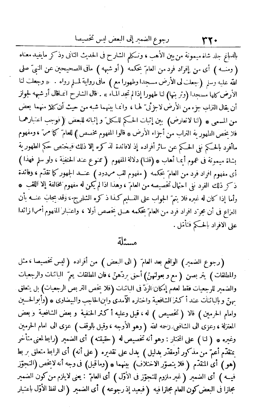 بالدباغ جلد شَاة مَيْمُونَة من بَين الأهب، وَتكلم الشَّارِح فِي الحَدِيث الثَّانِي وَذكر مَا يُفِيد مَعْنَاهُ (وَمِنْه) أَي من إِفْرَاد فَرد من الْعَام بِحكمِهِ (أَو شبهه) مَا فِي الصَّحِيحَيْنِ عَن النَّبِي صلى الله عَلَيْهِ وَسلم (جعلت لي الأَرْض مَسْجِدا وَطهُورًا مَعَ) مَا فِي رِوَايَة لمُسلم رَوَاهُ. " وَجعلت لنا الأَرْض كلهَا مَسْجِدا (وتربتها) لنا طهُورا إِذا لم تَجِد المَاء ". قَالَ الشَّارِح إِنَّمَا قَالَ أَو شبهه لجَوَاز أَن يُقَال التُّرَاب جُزْء من الأَرْض لَا جزئي لَهَا، وَإِنَّمَا بَينهمَا شبه من حَيْثُ أَن كلا مِنْهُمَا بعض من الْمُسَمّى (لنا لَا تعَارض) بَين إِثْبَات الحكم للْكُلّ وإثباته للْبَعْض (فَوَجَبَ اعتبارهما فَلَا يخص الطّهُورِيَّة التُّرَاب من أَجزَاء الأَرْض قَالُوا الْمَفْهُوم مُخَصص) للعام كَمَا مر، وَمَفْهُوم مَا أفرد بالحكم نفى الحكم عَن سَائِر أَفْرَاده إِذا لَا فَائِدَة لذكره إِلَّا ذَلِك فَيخْتَص حكم الطّهُورِيَّة بِشَاة مَيْمُونَة فِي عُمُوم أَيّمَا أهاب (قُلْنَا) دلَالَة الْمَفْهُوم (مَمْنُوع عِنْد الْحَنَفِيَّة، وَلَو سلم فَهَذَا) أَي مَفْهُوم إِفْرَاد فَرد من الْعَام بِحكمِهِ (مَفْهُوم لقب مَرْدُود) عِنْد الْجُمْهُور كَمَا تقدم، وَفَائِدَة ذكر ذَلِك الْفَرد نفى احْتِمَال تَخْصِيصه من الْعَام، وَهَذَا إِذا لم يكن لَهُ مَفْهُوم مُخَالفَة إِلَّا اللقب وَأما إِذا كَانَ لَهُ غَيره فَلَا يتم الْجَواب على التَّسْلِيم كَذَا ذكره الشَّارِح، وَقد يُجَاب عَنهُ بِأَن النزاع فِي أَن مُجَرّد إِفْرَاد فَرد من الْعَام بِحكمِهِ هَل يخصص أَولا، وَاعْتِبَار الْمَفْهُوم أمرا زَائِدا على الْإِفْرَاد بالحكم فَتَأمل.