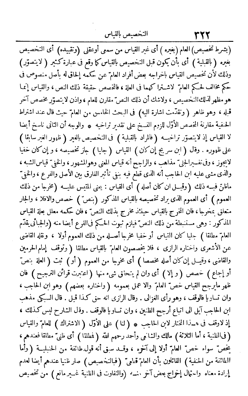 (بِشَرْط تَخْصِيص) الْعَام (بِغَيْرِهِ) أَي غير الْقيَاس من سَمْعِي أَو عَقْلِي (وتقييده) أَي التَّخْصِيص بِغَيْرِهِ (بالقبلية) أَي بِأَن يكون قبل التَّخْصِيص بِالْقِيَاسِ كَمَا وَقع فِي عبارَة كثير (لَا يتَصَوَّر) وَذَلِكَ لِأَن تَخْصِيص الْقيَاس بِإِخْرَاجِهِ بعض أَفْرَاد الْعَام عَن حكمه إِلْحَاق لَهُ بِأَصْل مَنْصُوص فِي حكم مُخَالف لحكم الْعَام لاشْتِرَاكهمَا فِي الْعلَّة، فالمخصص حَقِيقَة ذَلِك النَّص، وَالْقِيَاس إِنَّمَا هُوَ مظهر لذَلِك التَّخْصِيص، وَلَا شكّ أَن ذَلِك النَّص مُقَارن للعام، وَإِذن لَا يتَصَوَّر مُخَصص آخر قبله، وَهُوَ ظَاهر (وَتَقَدَّمت إِشَارَة إِلَيْهِ) فِي الْبَحْث الْخَامِس من الْعَام حَيْثُ قَالَ عِنْد اشْتِرَاط الْحَنَفِيَّة مُقَارنَة الْمُخَصّص الأول للُزُوم النّسخ على تَقْدِير تراخيه وَالْوَجْه أَن الثَّانِي نَاسخ أَيْضا لَا الْقيَاس إِذْ لَا يتَصَوَّر تراخيه (فَالْمُرَاد بالقبلية) فِي التَّخْصِيص بِالْغَيْر (ظُهُور الْغَيْر سَابِقًا) على ظُهُوره. وَقَالَ (ابْن سُرَيج إِن كَانَ) الْقيَاس (جليا) جَازَ تَخْصِيصه، وَإِن كَانَ خفِيا لَا يجوز، وَفِي تَفْسِير الْجَلِيّ مَذَاهِب، وَالرَّاجِح أَنه قِيَاس الْمَعْنى وَهُوَ الْمَشْهُور، والخفي قِيَاس الشّبَه، وَالَّذِي مَشى عَلَيْهِ ابْن الْحَاجِب أَنه الَّذِي قطع فِيهِ بِنَفْي تَأْثِير الْفَارِق بَين الأَصْل وَالْفرع، والخفي مَا ظن فِيهِ ذَلِك (وَقيل إِن كَانَ أَصله) أَي الْقيَاس: يَعْنِي الْمَقِيس عَلَيْهِ (مخرجا من ذَلِك الْعُمُوم) أَي الْعُمُوم الَّذِي يُرَاد تَخْصِيصه بِالْقِيَاسِ الْمَذْكُور (بِنَصّ) خصص وَإِلَّا فَلَا، وَالْجَار مُتَعَلق بمخرجا، فَإِن الْمخْرج بِالْقِيَاسِ حِينَئِذٍ مخرج بذلك النَّص، فَإِن حكمه مُعَلل بعلة الْقيَاس الْمَذْكُور: وَهِي مستنبطة من ذَلِك النَّص فَيلْزم ثُبُوت الحكم فِي الْفَرْع أَيْضا مِنْهُ (والجبائي يقدم الْعَام مُطلقًا) جليا كَانَ الْقيَاس أَو خفِيا مخرجا أَصله من ذَلِك الْعُمُوم أَولا، وَنَقله القَاضِي عَن الْأَشْعَرِيّ وَاخْتَارَهُ الرَّازِيّ، فَلَا يخصصون الْعَام بِالْقِيَاسِ مُطلقًا (وَتوقف إِمَام الْحَرَمَيْنِ وَالْقَاضِي، وَقيل إِن كَانَ أَصله مُخَصّصا) أَي مخرجا من الْعُمُوم (أَو) ثَبت (الْعلَّة بِنَصّ أَو إِجْمَاع) خصص (وَإِلَّا) أَي وَإِن لم يتَحَقَّق شَيْء مِنْهَا (اعْتبرت قَرَائِن التَّرْجِيح) فَإِن ظهر مَا يرجح الْقيَاس خص الْعَام وَإِلَّا عمل بِعُمُومِهِ (وَاخْتَارَهُ بَعضهم) وَهُوَ ابْن الْحَاجِب، وَإِن تَسَاويا فالوقف، وَهُوَ رَأْي الْغَزالِيّ. وَقَالَ الرَّازِيّ أَنه حق كَذَا قيل. قَالَ السُّبْكِيّ مَذْهَب ابْن الْحَاجِب آيل إِلَى اتِّبَاع أرجح الظنين، وَإِن تَسَاويا فالوقف. وَقَالَ الشَّارِح لَيْسَ كَذَلِك، إِذْ لَا وقف فِي هَذَا الْمُخْتَار لِابْنِ الْحَاجِب (لنا) على الأول (الِاشْتِرَاك) للعام وَالْقِيَاس (فِي الظنية، أما الثَّلَاثَة) مَالك وَالشَّافِعِيّ وَأحمد رَحِمهم الله (فمطلقا) أَي ظَنِّي مُطلقًا فعندهم، يخص سَوَاء خص الْعَام أَولا إِلَى آخِره، وَقد سبق أَنه قَول طَائِفَة من الحنبلية (وَأما الطَّائِفَة من الْحَنَفِيَّة) الْقَائِلُونَ بِأَن الْعَام قَطْعِيّ (فبالتخصيص) صَار ظنيا عِنْدهم أَيْضا لعدم إِرَادَة مَعْنَاهُ وَاحْتِمَال إِخْرَاج بعض آخر مِنْهُ (والتفاوت فِي الظنية غير مَانع) من تَخْصِيص