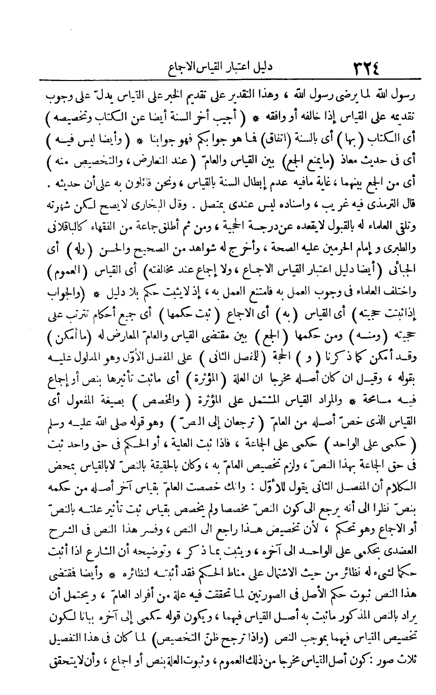 رَسُول الله لما يرضى رَسُول الله، وَهَذَا التَّقْدِير على تَقْدِيم الْخَبَر على الْقيَاس يدل على وجوب تَقْدِيمه على الْقيَاس إِذا خَالفه أَو وَافقه (أُجِيب أخر السّنة أَيْضا عَن الْكتاب وتخصيصه) أَي الْكتاب (بهَا) أَي بِالسنةِ (اتِّفَاق) فَمَا هُوَ جوابكم فَهُوَ جَوَابنَا (وَأَيْضًا لَيْسَ فِيهِ) أَي فِي حَدِيث معَاذ (مَا يمْنَع الْجمع) بَين الْقيَاس وَالْعَام (عِنْد التَّعَارُض، والتخصيص مِنْهُ) أَي من الْجمع بَينهمَا، غَايَة مَا فِيهِ عدم إبِْطَال السّنة بِالْقِيَاسِ، وَنحن قَائِلُونَ بِهِ على أَن حَدِيثه. قَالَ التِّرْمِذِيّ فِيهِ غَرِيب، وَإِسْنَاده لَيْسَ عِنْدِي بِمُتَّصِل. وَقَالَ البُخَارِيّ لَا يَصح لَكِن شهرته وتلقى الْعلمَاء لَهُ بِالْقبُولِ لَا يقعده عَن دَرَجَة الحجية، وَمن ثمَّ أطلق جمَاعَة من الْفُقَهَاء كالباقلاني والطبري وَإِمَام الْحَرَمَيْنِ عَلَيْهِ الصِّحَّة، وَأخرج لَهُ شَوَاهِد من الصَّحِيح وَالْحسن (وَله) أَي الجبائي (أَيْضا دَلِيل اعْتِبَار الْقيَاس الْإِجْمَاع، وَلَا إِجْمَاع عِنْد مُخَالفَته) أَي الْقيَاس (الْعُمُوم) وَاخْتلف الْعلمَاء فِي وجوب الْعَمَل بِهِ فَامْتنعَ الْعَمَل بِهِ، إِذْ لَا يثبت حكم بِلَا دَلِيل (وَالْجَوَاب إِذا ثبتَتْ حجيته) أَي الْقيَاس (بِهِ) أَي الْإِجْمَاع (ثَبت حكمهَا) أَي جَمِيع أَحْكَام تترتب على حجيته (وَمِنْه) وَمن حكمهَا (الْجمع) بَين مُقْتَضى الْقيَاس وَالْعَام الْمعَارض لَهُ (مَا أمكن) وَقد أمكن كَمَا ذكرنَا (و) الْحجَّة (للمفصل الثَّانِي) على الْمفصل الأول وَهُوَ الْمَدْلُول عَلَيْهِ بقوله، وَقيل إِن كَانَ أَصله مخرجا أَن الْعلَّة (المؤثرة) أَي مَا ثَبت تأثيرها بِنَصّ أَو إِجْمَاع فِيهِ مُسَامَحَة وَالْمرَاد الْقيَاس الْمُشْتَمل على المؤثرة (والمخصص) بِصِيغَة الْمَفْعُول أَي الْقيَاس الَّذِي خص أَصله من الْعَام (تَرْجِعَانِ إِلَى النَّص) وَهُوَ قَوْله صلى الله عَلَيْهِ وَسلم (حكمي على الْوَاحِد) حكمي على الْجَمَاعَة، فَإِذا ثَبت الْعلية، أَو الحكم فِي حق وَاحِد ثَبت فِي حق الْجَمَاعَة بِهَذَا النَّص، وَلزِمَ تَخْصِيص الْعَام بِهِ، وَكَانَ بِالْحَقِيقَةِ بِالنَّصِّ لَا بِالْقِيَاسِ بمحض الْكَلَام أَن الْمفصل الثَّانِي يَقُول للْأولِ: وَأَنَّك خصصت الْعَام بِقِيَاس آخر أَصله من حكمه بِنَصّ نظرا إِلَى أَنه يرجع إِلَى كَون النَّص مُخَصّصا وَلم يخصص بِقِيَاس ثَبت تَأْثِير علته بِالنَّصِّ أَو الْإِجْمَاع وَهُوَ تحكم، لِأَن تَخْصِيص هَذَا رَاجع إِلَى النَّص، وَفسّر هَذَا النَّص فِي الشَّرْح العضدي بحكمي على الْوَاحِد إِلَى آخِره، وَيثبت بِمَا ذكر، وتوضيحه أَن الشَّارِع إِذا أثبت حكما لشَيْء لَهُ نَظَائِر من حَيْثُ الاشتمال على منَاط الحكم فقد أثْبته لنظائره وَأَيْضًا فَمُقْتَضى هَذَا النَّص ثُبُوت حكم الأَصْل فِي الصُّورَتَيْنِ لما تحققت فِيهِ عِلّة من أَفْرَاد الْعَام، وَيحْتَمل أَن يُرَاد بِالنَّصِّ الْمَذْكُور مَا ثَبت بِهِ أصل الْقيَاس فيهمَا، وَيكون قَوْله حكمي إِلَى آخِره بَيَانا لكَون تَخْصِيص الْقيَاس فيهمَا بِمُوجب النَّص (وَإِذا ترجح ظن التَّخْصِيص) لما كَانَ فِي هَذَا التَّفْصِيل ثَلَاث صور: كَون أصل الْقيَاس مخرجا من ذَلِك الْعُمُوم، وَثُبُوت الْعلَّة بِنَصّ أَو إِجْمَاع، وَأَن لَا يتَحَقَّق