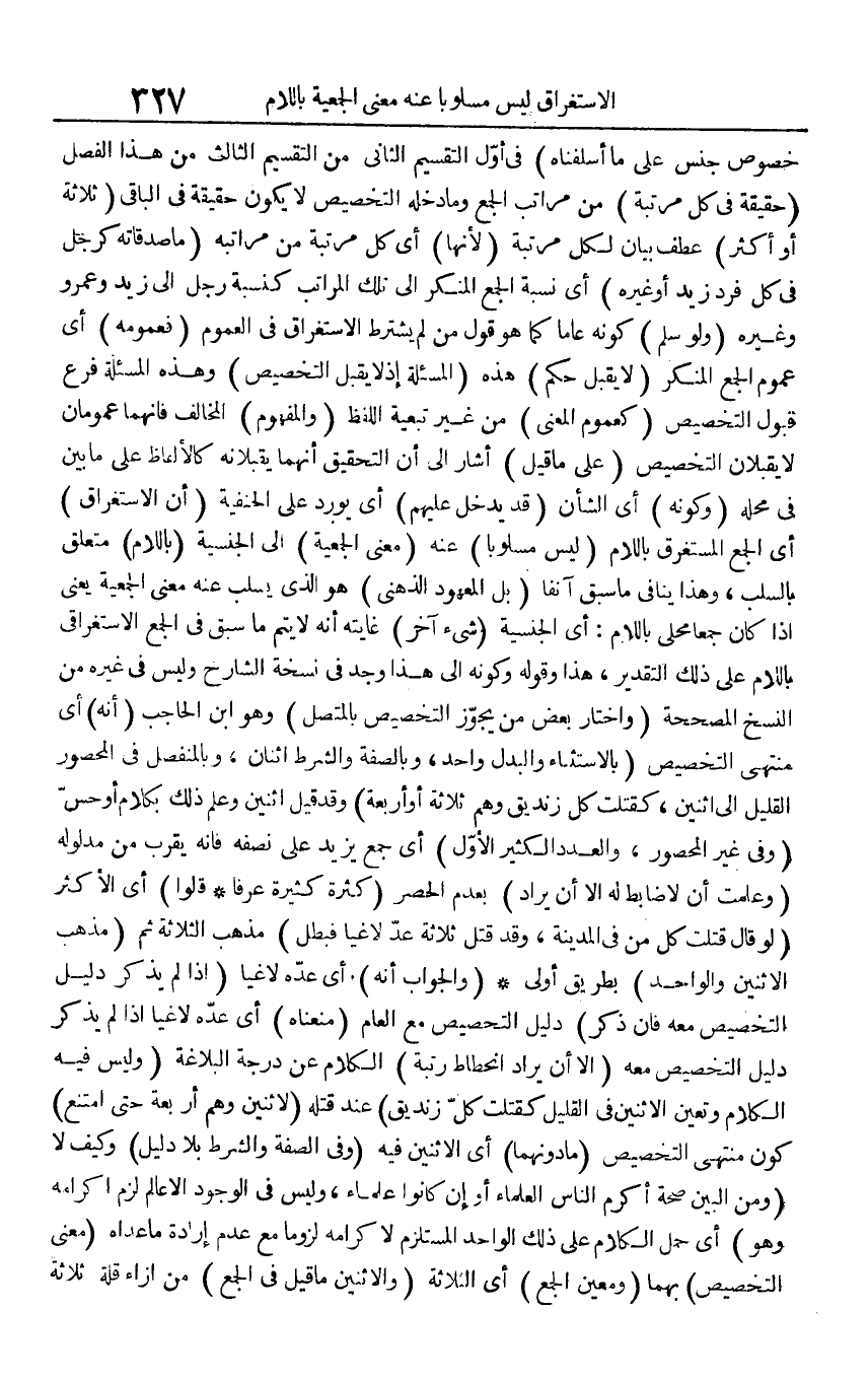 خُصُوص جنس على مَا أسلفناه) فِي أول التَّقْسِيم الثَّانِي من التَّقْسِيم الثَّالِث من هَذَا الْفَصْل (حَقِيقَة فِي كل مرتبَة) من مَرَاتِب الْجمع وَمَا دخله التَّخْصِيص لَا يكون حَقِيقَة فِي الْبَاقِي (ثَلَاثَة أَو أَكثر) عطف بَيَان لكل مرتبَة (لِأَنَّهَا) أَي كل مرتبَة من مراتبه (مَا صدقاته كَرجل فِي كل فَرد زيد أَو غَيره) أَي نِسْبَة الْجمع الْمُنكر إِلَى تِلْكَ الْمَرَاتِب كنسبة رجل إِلَى زيد وَعَمْرو وَغَيره (وَلَو سلم) كَونه عَاما كَمَا هُوَ قَول من لم يشْتَرط الِاسْتِغْرَاق فِي الْعُمُوم (فعمومه) أَي عُمُوم الْجمع الْمُنكر (لَا يقبل حكم) هَذِه (المسئلة إِذْ لَا يقبل التَّخْصِيص) وَهَذِه المسئلة فرع قبُول التَّخْصِيص (كعموم الْمَعْنى) من غير تَبَعِيَّة اللَّفْظ (وَالْمَفْهُوم) الْمُخَالف فَإِنَّهُمَا عمومان لَا يقبلان التَّخْصِيص (على مَا قيل) أَشَارَ إِلَى أَن التَّحْقِيق أَنَّهُمَا يقبلانه كالألفاظ على مَا بَين فِي مَحَله (وَكَونه) أَي الشَّأْن (قد يدْخل عَلَيْهِم) أَي يُورد على الْحَنَفِيَّة (أَن الِاسْتِغْرَاق) أَي الْجمع الْمُسْتَغْرق بِاللَّامِ (لَيْسَ مسلوبا) عَنهُ (معنى الجمعية) إِلَى الجنسية (بِاللَّامِ) مُتَعَلق بالسلب، وَهَذَا يُنَافِي مَا سبق آنِفا (بل الْمَعْهُود الذهْنِي) هُوَ الَّذِي يسلب عَنهُ معنى الجمعية يَعْنِي إِذا كَانَ جمعا محلى بِاللَّامِ: أَي الجنسية (شَيْء آخر) غَايَته أَنه لَا يتم مَا سبق فِي الْجمع الاستغراقي بِاللَّامِ على ذَلِك التَّقْدِير، هَذَا وَقَوله وَكَونه إِلَى هَذَا وجد فِي نُسْخَة الشَّارِح وَلَيْسَ فِي غَيره من النّسخ المصححة (وَاخْتَارَ بعض من يجوز التَّخْصِيص بالمتصل) وَهُوَ ابْن الْحَاجِب (أَنه) أَي مُنْتَهى التَّخْصِيص (بِالِاسْتِثْنَاءِ وَالْبدل وَاحِد، وبالصفة وَالشّرط اثْنَان، وبالمنفصل فِي المحصور الْقَلِيل إِلَى اثْنَيْنِ، كقتلت كل زنديق وهم ثَلَاثَة أَو أَرْبَعَة) وَقد قيل اثْنَيْنِ وَعلم ذَلِك بِكَلَام أَو حس (وَفِي غير المحصور، وَالْعدَد الْكثير الأول) أَي جمع يزِيد على نصفه فَإِنَّهُ يقرب من مَدْلُوله (وَعلمت أَن لَا ضَابِط لَهُ إِلَّا أَن يُرَاد) بِعَدَمِ الْحصْر (كَثْرَة كَثِيرَة عرفا قَالُوا) أَي الْأَكْثَر (لَو قَالَ قتلت كل من فِي الْمَدِينَة، وَقد قتل ثَلَاثَة عد لاغيا فَبَطل) مَذْهَب الثَّلَاثَة ثمَّ (مَذْهَب الِاثْنَيْنِ وَالْوَاحد) بطرِيق أولى (وَالْجَوَاب أَنه) أَي عدَّة لاغيا (إِذا لم يذكر دَلِيل التَّخْصِيص مَعَه فَإِن ذكر) دَلِيل التَّخْصِيص مَعَ الْعَام (منعناه) أَي عدَّة لاغيا إِذا لم يذكر دَلِيل التَّخْصِيص مَعَه (إِلَّا أَن يُرَاد انحطاط رُتْبَة) الْكَلَام عَن دَرَجَة البلاغة (وَلَيْسَ فِيهِ الْكَلَام وَتعين الِاثْنَيْنِ فِي الْقَلِيل كقتلت كل زنديق) عِنْد قَتله (لاثْنَيْنِ وهم أَرْبَعَة حَتَّى امْتنع) كَون مُنْتَهى التَّخْصِيص (مَا دونهمَا) أَي الِاثْنَيْنِ فِيهِ (وَفِي الصّفة وَالشّرط بِلَا دَلِيل) وَكَيف لَا (وَمن الْبَين صِحَة أكْرم النَّاس الْعلمَاء أَو إِن كَانُوا عُلَمَاء، وَلَيْسَ فِي الْوُجُود إِلَّا عَالم لزم إكرامه وَهُوَ) أَي حمل الْكَلَام على ذَلِك الْوَاحِد المستلزم لإكرامه لُزُوما مَعَ عدم إِرَادَة مَا عداهُ (معنى التَّخْصِيص) بهما (ومعين الْجمع) أَي الثَّلَاثَة (والاثنين مَا قيل فِي الْجمع) من إزاء قلَّة ثَلَاثَة