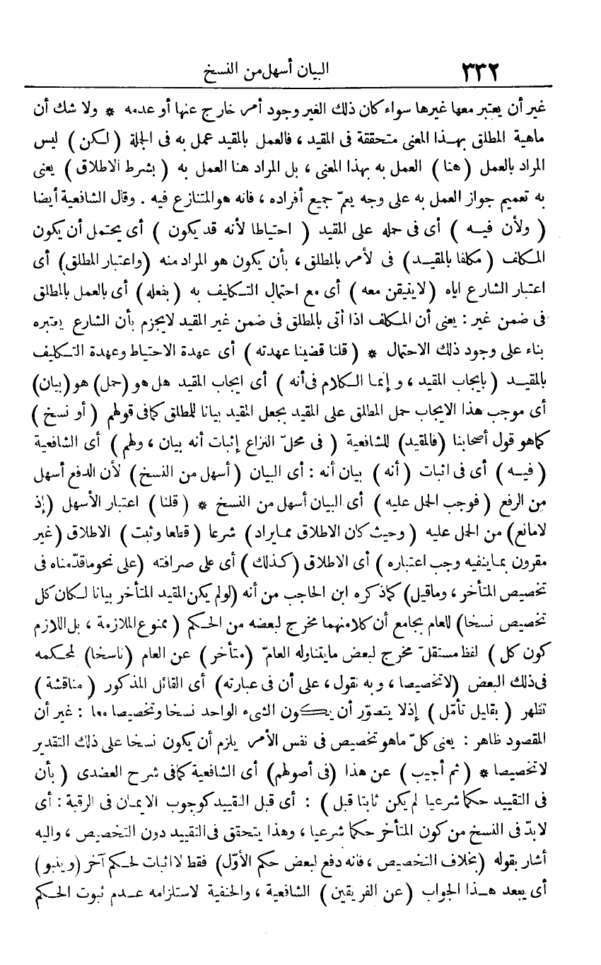 غير أَن يعْتَبر مَعهَا غَيرهَا سَوَاء كَانَ ذَلِك الْغَيْر وجود أَمر خَارج عَنْهَا أَو عَدمه وَلَا شكّ أَن مَاهِيَّة الْمُطلق بِهَذَا الْمَعْنى متحققة فِي الْمُقَيد، فَالْعَمَل بالمقيد عمل بِهِ فِي الْجُمْلَة (لَكِن) لَيْسَ المُرَاد بِالْعَمَلِ (هُنَا) الْعَمَل بِهِ بِهَذَا الْمَعْنى، بل المُرَاد هُنَا الْعَمَل بِهِ (بِشَرْط الْإِطْلَاق) يَعْنِي بِهِ تَعْمِيم جَوَاز الْعَمَل بِهِ على وَجه يعم جَمِيع أَفْرَاده، فَإِنَّهُ هُوَ الْمُتَنَازع فِيهِ. وَقَالَ الشَّافِعِيَّة أَيْضا (وَلِأَن فِيهِ) أَي فِي حمله على الْمُقَيد (احْتِيَاطًا لِأَنَّهُ قد يكون) أَي يحْتَمل أَن يكون الْمُكَلف (مُكَلّفا بالمقيد) فِي لأمر بالمطلق، بِأَن يكون هُوَ المُرَاد مِنْهُ (وَاعْتِبَار الْمُطلق) أَي اعْتِبَار الشَّارِع إِيَّاه (لَا يتَيَقَّن مَعَه) أَي مَعَ احْتِمَال التَّكْلِيف بِهِ (بِفِعْلِهِ) أَي بِالْعَمَلِ بالمطلق فِي ضمن غير: يَعْنِي أَن الْمُكَلف إِذا أَتَى بالمطلق فِي ضمن غير الْمُقَيد لَا يجْزم بِأَن الشَّارِع يعتبره بِنَاء على وجود ذَلِك الِاحْتِمَال (قُلْنَا قضينا عهدته) أَي عُهْدَة الِاحْتِيَاط وعهدة التَّكْلِيف بالمقيد (بِإِيجَاب الْمُقَيد، وَإِنَّمَا الْكَلَام فِي أَنه) أَي إِيجَاب الْمُقَيد هَل هُوَ (حمل) هُوَ (بَيَان) أَي مُوجب هَذَا الْإِيجَاب حمل الْمُطلق على الْمُقَيد بِجعْل الْمُقَيد بَيَانا للمطلق كَمَا فِي قَوْلهم (أَو نسخ) كَمَا هُوَ قَول أَصْحَابنَا (فالمقيد) للشَّافِعِيَّة (فِي مَحل النزاع إِثْبَات أَنه بَيَان، وَلَهُم) أَي الشَّافِعِيَّة (فِيهِ) أَي فِي إِثْبَات (أَنه) بَيَان أَنه: أَي الْبَيَان (أسهل من النّسخ) لِأَن الدّفع أسهل من الرّفْع (فَوَجَبَ الْحمل عَلَيْهِ) أَي الْبَيَان أسهل من النّسخ (قُلْنَا) اعْتِبَار الأسهل (إِذْ لَا مَانع) من الْحمل عَلَيْهِ (وَحَيْثُ كَانَ الْإِطْلَاق مِمَّا يُرَاد) شرعا (قطعا وَثَبت) الْإِطْلَاق (غير مقرون بِمَا يَنْفِيه وَجب اعْتِبَاره) أَي الْإِطْلَاق (كَذَلِك) أَي على صرافته (على نَحْو مَا قدمْنَاهُ فِي تَخْصِيص الْمُتَأَخر، وَمَا قيل) كَمَا ذكره ابْن الْحَاجِب من أَنه (لَو لم يكن الْمُقَيد الْمُتَأَخر بَيَانا لَكَانَ كل تَخْصِيص نسخا) للعام بِجَامِع أَن كلا مِنْهُمَا مخرج لبعضه من الحكم (مَمْنُوع الْمُلَازمَة، بل اللَّازِم كَون كل) لفظ مُسْتَقل مخرج لبَعض مَا يتَنَاوَلهُ الْعَام (مُتَأَخّر) عَن الْعَام (نَاسِخا) لمحكمه فِي ذَلِك الْبَعْض (لَا تَخْصِيصًا، وَبِه نقُول، على أَن فِي عِبَارَته) أَي الْقَائِل الْمَذْكُور (مناقشة) تظهر (بِقَلِيل تَأمل) إِذْ لَا يتَصَوَّر أَن يكون الشَّيْء الْوَاحِد نسخا وتخصيصا مَعًا: غير أَن الْمَقْصُود ظَاهر: يَعْنِي كل مَا هُوَ تَخْصِيص فِي نفس الْأَمر يلْزم أَن يكون نسخا على ذَلِك التَّقْدِير لَا تَخْصِيصًا (ثمَّ أُجِيب) عَن هَذَا (فِي أصولهم) أَي الشَّافِعِيَّة كَمَا فِي شرح العضدي (بِأَن فِي التَّقْيِيد حكما شَرْعِيًّا لم يكن ثَابتا قبل): أَي قبل التَّقْيِيد كوجوب الْإِيمَان فِي الرَّقَبَة: أَي لَا بُد فِي النّسخ من كَون الْمُتَأَخر حكما شَرْعِيًّا، وَهَذَا يتَحَقَّق فِي التَّقْيِيد دون التَّخْصِيص، وَإِلَيْهِ أَشَارَ بقوله (بِخِلَاف التَّخْصِيص، فَإِنَّهُ دفع لبَعض حكم الأول) فَقَط لَا إِثْبَات لحكم آخر (وينبو) أَي يبعد هَذَا الْجَواب (عَن الْفَرِيقَيْنِ) الشَّافِعِيَّة، وَالْحَنَفِيَّة لاستلزامه عدم ثُبُوت الحكم