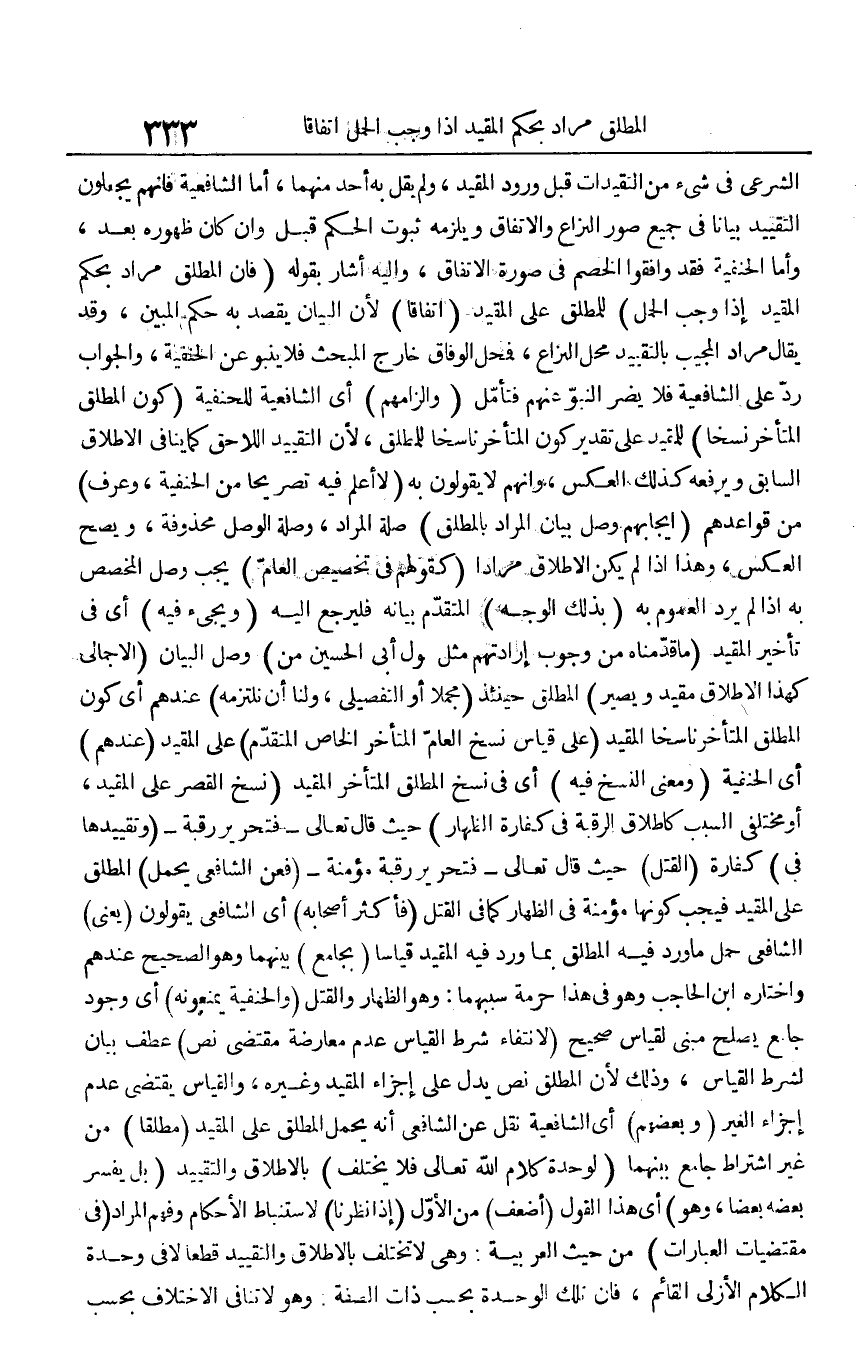 الشَّرْعِيّ فِي شَيْء من التقيدات قبل وُرُود الْمُقَيد، وَلم يقل بِهِ أحد مِنْهُمَا، أما الشَّافِعِيَّة فَإِنَّهُم يجْعَلُونَ التَّقْيِيد بَيَانا فِي جَمِيع صور النزاع والاتفاق وَيلْزمهُ ثُبُوت الحكم قبل وَإِن كَانَ ظُهُوره بعد، وَأما الْحَنَفِيَّة فقد وافقوا الْخصم فِي صُورَة الِاتِّفَاق، وَإِلَيْهِ أَشَارَ بقوله (فَإِن الْمُطلق مُرَاد بِحكم الْمُقَيد إِذا وَجب الْحمل) للمطلق على الْمُقَيد (اتِّفَاقًا) لِأَن الْبَيَان يقْصد بِهِ حكم الْمُبين، وَقد يُقَال مُرَاد الْمُجيب بالتقييد مَحل النزاع، فَمحل الْوِفَاق خَارج المبحث فَلَا ينبو عَن الْحَنَفِيَّة، وَالْجَوَاب رد على الشَّافِعِيَّة فَلَا يضر النبو عَنْهُم فَتَأمل (وإلزامهم) أَي الشَّافِعِيَّة للحنفية (كَون الْمُطلق الْمُتَأَخر نسخا) للمقيد على تَقْدِير كَون الْمُتَأَخر نَاسِخا للمطلق، لِأَن التَّقْيِيد اللَّاحِق كَمَا يُنَافِي الْإِطْلَاق السَّابِق وَيَرْفَعهُ كَذَلِك الْعَكْس، وَأَنَّهُمْ لَا يَقُولُونَ بِهِ (لَا أعلم فِيهِ تَصْرِيحًا من الْحَنَفِيَّة، وَعرف) من قواعدهم (ايجابهم وصل بَيَان المُرَاد بالمطلق) صلَة المُرَاد، وصلَة الْوَصْل محذوفة، وَيصِح الْعَكْس، وَهَذَا إِذا لم يكن الْإِطْلَاق مرَادا (كَقَوْلِهِم فِي تَخْصِيص الْعَام) يجب وصل الْمُخَصّص بِهِ إِذا لم يرد الْعُمُوم بِهِ (بذلك الْوَجْه) الْمُتَقَدّم بَيَانه فَليرْجع إِلَيْهِ (وَيَجِيء فِيهِ) أَي فِي تَأْخِير الْمُقَيد (مَا قدمْنَاهُ من وجوب إرادتهم مثل قَول أبي الْحُسَيْن من) وصل الْبَيَان (الإجمالي كَهَذا الْإِطْلَاق مُقَيّد وَيصير) الْمُطلق حِينَئِذٍ (مُجملا أَو التفصيلي، وَلنَا أَن نلتزمه) عِنْدهم أَي كَون الْمُطلق الْمُتَأَخر نَاسِخا الْمُقَيد (على قِيَاس نسخ الْعَام الْمُتَأَخر الْخَاص الْمُتَقَدّم) على الْمُقَيد (عِنْدهم) أَي الْحَنَفِيَّة (وَمعنى النّسخ فِيهِ) أَي فِي نسخ الْمُطلق الْمُتَأَخر الْمُقَيد (نسخ الْقصر على الْمُقَيد، أَو مختلفي السَّبَب كإطلاق الرَّقَبَة فِي كَفَّارَة الظِّهَار) حَيْثُ قَالَ تَعَالَى - {فَتَحْرِير رَقَبَة} - (وتقييدها فِي) كَفَّارَة (الْقَتْل) حَيْثُ قَالَ تَعَالَى - {فَتَحْرِير رَقَبَة مُؤمنَة} - (فَعَن الشَّافِعِي يحمل) الْمُطلق على الْمُقَيد فَيجب كَونهَا مُؤمنَة فِي الظِّهَار كَمَا فِي الْقَتْل (فَأكْثر أَصْحَابه) أَي الشَّافِعِي يَقُولُونَ (يَعْنِي) الشَّافِعِي حمل مَا ورد فِيهِ الْمُطلق بِمَا ورد فِيهِ الْمُقَيد قِيَاسا (بِجَامِع) بَينهمَا وَهُوَ الصَّحِيح عِنْدهم وَاخْتَارَهُ ابْن الْحَاجِب وَهُوَ فِي هَذَا حُرْمَة سببهما: وَهُوَ الظِّهَار وَالْقَتْل (وَالْحَنَفِيَّة يمنعونه) أَي وجود جَامع يصلح مبْنى لقياس صَحِيح (لانْتِفَاء شَرط الْقيَاس عدم مُعَارضَة مُقْتَضى نَص) عطف بَيَان لشرط الْقيَاس، وَذَلِكَ لِأَن الْمُطلق نَص يدل على إِجْزَاء الْمُقَيد وَغَيره، وَالْقِيَاس يَقْتَضِي عدم إِجْزَاء الْغَيْر (وَبَعْضهمْ) أَي الشَّافِعِيَّة نقل عَن الشَّافِعِي أَنه يحمل الْمُطلق على الْمُقَيد (مُطلقًا) من غير اشْتِرَاط جَامع بَينهمَا (لوحدة كَلَام الله تَعَالَى فَلَا يخْتَلف) بِالْإِطْلَاقِ وَالتَّقْيِيد (بل يُفَسر بعضه بَعْضًا، وَهُوَ) أَي هَذَا القَوْل (أَضْعَف) من الأول (إِذا نَظرنَا) لاستنباط الْأَحْكَام وَفهم المُرَاد (فِي مقتضيات الْعبارَات) من حَيْثُ الْعَرَبيَّة: وَهِي لَا تخْتَلف بِالْإِطْلَاقِ وَالتَّقْيِيد قطعا لَا فِي وحدة الْكَلَام الأزلي الْقَائِم، فَإِن تِلْكَ الْوحدَة بِحَسب ذَات الصّفة: وَهُوَ لَا تنَافِي الِاخْتِلَاف بِحَسب