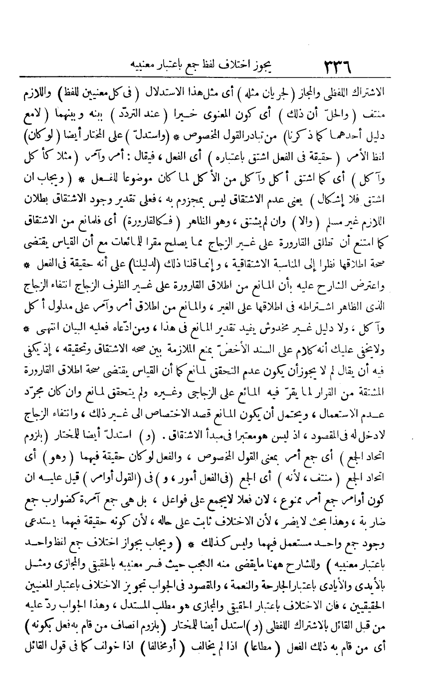 الِاشْتِرَاك اللَّفْظِيّ وَالْمجَاز (لجَرَيَان مثله) أَي مثل هَذَا الِاسْتِدْلَال (فِي كل مَعْنيين للفظ) وَاللَّازِم مُنْتَفٍ (والحل أَن ذَلِك) أَي كَون الْمَعْنَوِيّ خيرا (عِنْد التَّرَدُّد) بَينه وَبَينهمَا (لَا مَعَ دَلِيل أَحدهمَا كَمَا ذكرنَا) من تبادر القَوْل الْمَخْصُوص (وَاسْتدلَّ) على الْمُخْتَار أَيْضا (لَو كَانَ) لفظ الْأَمر (حَقِيقَة فِي الْفِعْل اشتق بِاعْتِبَارِهِ) أَي الْفِعْل، فَيُقَال: أَمر وآمر (مثلا كَأَكْل وآكل) أَي كَمَا اشتق أكل وآكل من الْأكل لما كَانَ مَوْضُوعا للْفِعْل (وَيُجَاب إِن اشتق فَلَا إِشْكَال) يَعْنِي عدم الِاشْتِقَاق لَيْسَ بمجزوم بِهِ، فعلى تَقْدِير وجود الِاشْتِقَاق بطلَان اللَّازِم غير مُسلم (وَإِلَّا) وَإِن لم يشتق، وَهُوَ الظَّاهِر (فكالقارورة) أَي فلمانع من الِاشْتِقَاق كَمَا امْتنع أَن تطلق القارورة على غير الزّجاج مِمَّا يصلح مقرا للمائعات مَعَ أَن الْقيَاس يَقْتَضِي صِحَة إِطْلَاقهَا نظرا إِلَى الْمُنَاسبَة الاشتقاقية، وَإِنَّمَا قُلْنَا ذَلِك (لدليلنا) على أَنه حَقِيقَة فِي الْفِعْل وَاعْترض الشَّارِح عَلَيْهِ بِأَن الْمَانِع من إِطْلَاق القارورة على غير الظّرْف الزّجاج انْتِفَاء الزّجاج الَّذِي الظَّاهِر اشْتِرَاطه فِي إِطْلَاقهَا على الْغَيْر، وَالْمَانِع من إِطْلَاق أَمر وآمر على مَدْلُول أكل وآكل، وَلَا دَلِيل على مخدوش يُفِيد تَقْدِير الْمَانِع فِي هَذَا، وَمن ادَّعَاهُ فَعَلَيهِ الْبَيَان انْتهى وَلَا يخفى عَلَيْك أَنه كَلَام على السَّنَد الْأَخَص بِمَنْع الْمُلَازمَة بَين صِحَة الِاشْتِقَاق وتحقيقه، إِذْ يَكْفِي فِيهِ أَن يُقَال لم لَا يجوز أَن يكون عدم التحقق لمَانع كَمَا أَن الْقيَاس يَقْتَضِي صِحَة إِطْلَاق القارورة المشتقة من الْقَرار لما يقر فِيهِ الْمَائِع على الزجاجي وَغَيره وَلم يتَحَقَّق لمَانع وَإِن كَانَ مُجَرّد عدم الِاسْتِعْمَال، وَيحْتَمل أَن يكون الْمَانِع قصد الِاخْتِصَاص إِلَى غير ذَلِك، وَانْتِفَاء الزّجاج لَا دخل لَهُ فِي الْمَقْصُود، إِذْ لَيْسَ هُوَ مُعْتَبرا فِي مبدأ الِاشْتِقَاق. (و) اسْتدلَّ أَيْضا للمختار (بِلُزُوم اتِّحَاد الْجمع) أَي جمع أَمر بِمَعْنى القَوْل الْمَخْصُوص، وَالْفِعْل لَو كَانَ حَقِيقَة فيهمَا (وَهُوَ) أَي اتِّحَاد الْجمع (مُنْتَفٍ، لِأَنَّهُ) أَي الْجمع (فِي الْفِعْل أُمُور، و) فِي (القَوْل أوَامِر) قيل عَلَيْهِ أَن كَون أوَامِر جمع أَمر مَمْنُوع، لِأَن فعلا لَا يجمع على فواعل، بل هِيَ جمع آمرة كضوارب جمع ضاربة، وَهَذَا بحث لَا يضرّهُ، لِأَن الِاخْتِلَاف ثَابت على حَاله، لِأَن كَونه حَقِيقَة فيهمَا يَسْتَدْعِي وجود جمع وَاحِد مُسْتَعْمل فيهمَا وَلَيْسَ كَذَلِك (وَيُجَاب بِجَوَاز اخْتِلَاف جمع لفظ وَاحِد بِاعْتِبَار معنيية) وللشارح هَهُنَا مَا يقْضِي مِنْهُ الْعجب حَيْثُ فسر معنييه بالحقيقي والمجازي وَمثل بِالْأَيْدِي والأيادي بِاعْتِبَار الْجَارِحَة وَالنعْمَة، وَالْمَقْصُود فِي الْجَواب تَجْوِيز الِاخْتِلَاف بِاعْتِبَار الْمَعْنيين الحقيقيين، فَإِن الِاخْتِلَاف بِاعْتِبَار الْحَقِيقِيّ والمجازي هُوَ مطلب الْمُسْتَدلّ، وَهَذَا الْجَواب رد عَلَيْهِ من قبل الْقَائِل بالاشتراك اللَّفْظِيّ (و) اسْتدلَّ أَيْضا للمختار (بِلُزُوم إنصاف من قَامَ بِهِ فعل بِكَوْنِهِ) أَي من قَامَ بِهِ ذَلِك الْفِعْل (مُطَاعًا) إِذا لم يُخَالف (أَو مُخَالفا) إِذا خُولِفَ كَمَا فِي قَول الْقَائِل