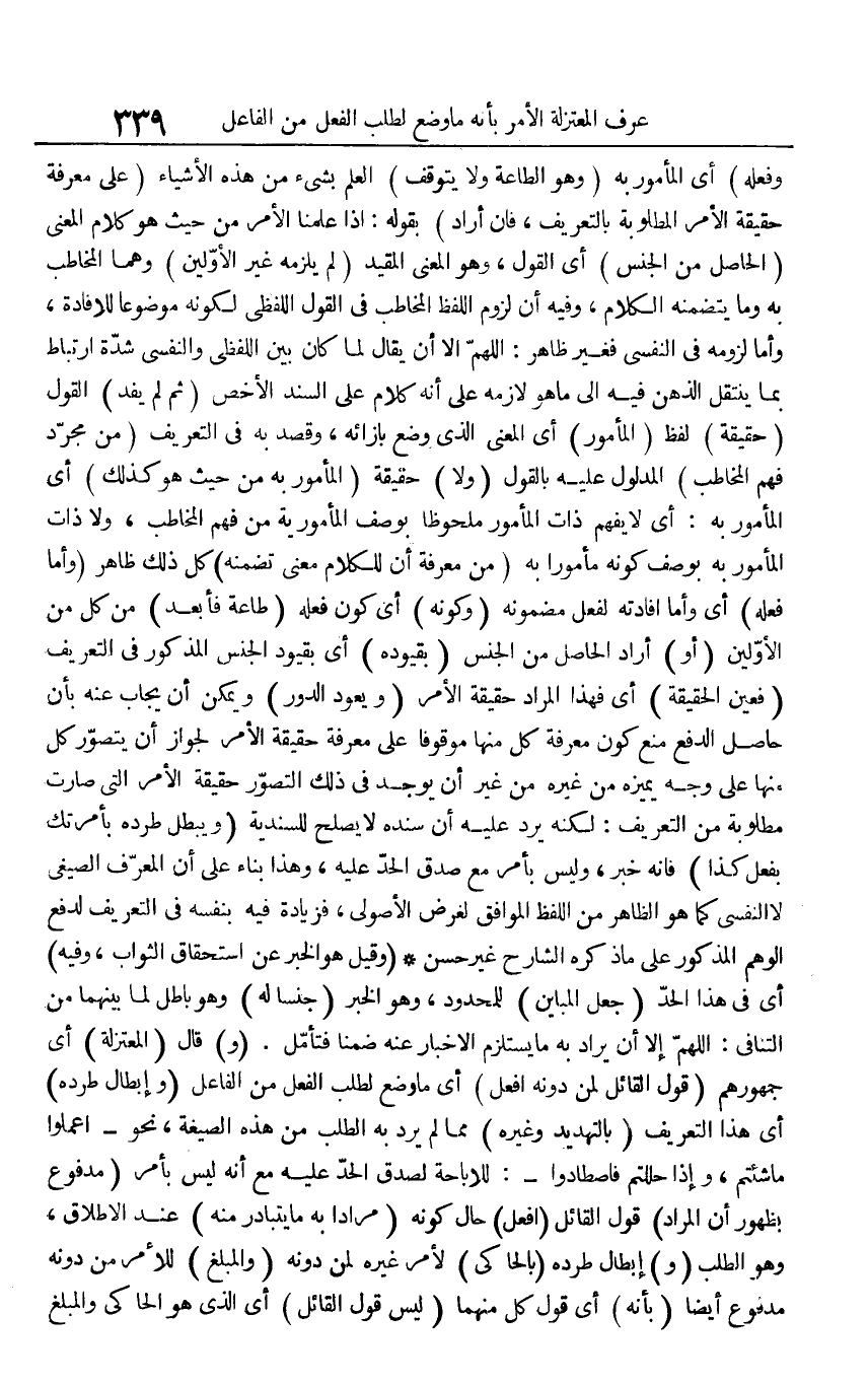 وَفعله) أَي الْمَأْمُور بِهِ (وَهُوَ الطَّاعَة وَلَا يتَوَقَّف) الْعلم بِشَيْء من هَذِه الْأَشْيَاء (على معرفَة حَقِيقَة الْأَمر الْمَطْلُوبَة بالتعريف، فَإِن أَرَادَ) بقوله: إِذا علمنَا الْأَمر من حَيْثُ هُوَ كَلَام الْمَعْنى (الْحَاصِل من الْجِنْس) أَي القَوْل، وَهُوَ الْمَعْنى الْمُقَيد (لم يلْزمه غير الْأَوَّلين) وهما الْمُخَاطب بِهِ وَمَا يتضمنه الْكَلَام، وَفِيه أَن لُزُوم اللَّفْظ الْمُخَاطب فِي القَوْل اللَّفْظِيّ لكَونه مَوْضُوعا للإفادة، وَأما لُزُومه فِي النَّفْسِيّ فَغير ظَاهر: اللَّهُمَّ إِلَّا أَن يُقَال لما كَانَ بَين اللَّفْظِيّ والنفسي شدَّة ارتباط بِمَا ينْتَقل الذِّهْن فِيهِ إِلَى مَا هُوَ لَازمه على أَنه كَلَام على السَّنَد الْأَخَص (ثمَّ لم يفد) القَوْل (حَقِيقَة) لفظ (الْمَأْمُور) أَي الْمَعْنى الَّذِي وضع بإزائه، وَقصد بِهِ فِي التَّعْرِيف (من مُجَرّد فهم الْمُخَاطب) الْمَدْلُول عَلَيْهِ بالْقَوْل (وَلَا) حَقِيقَة (الْمَأْمُور بِهِ من حَيْثُ هُوَ كَذَلِك) أَي الْمَأْمُور بِهِ: أَي لَا يفهم ذَاك الْمَأْمُور ملحوظا يُوصف المأمورية من فهم الْمُخَاطب، وَلَا ذَات الْمَأْمُور بِهِ بِوَصْف كَونه مَأْمُورا بِهِ (من معرفَة أَن للْكَلَام معنى تضمنه) كل ذَلِك ظَاهر (وَأما فعله) أَي وَأما إفادته لفعل مضمونه (وَكَونه) أَي كَون فعله (طَاعَة فأبعد) من كل من الْأَوَّلين (أَو) أَرَادَ الْحَاصِل من الْجِنْس (بقيوده) أَي بقيود الْجِنْس الْمَذْكُور فِي التَّعْرِيف (فعين الْحَقِيقَة) أَي فَهَذَا المُرَاد حَقِيقَة الْأَمر (وَيعود الدّور) وَيُمكن أَن يُجَاب عَنهُ بِأَن حَاصِل الدّفع منع كَون معرفَة كل مِنْهَا مَوْقُوفا على معرفَة حَقِيقَة الْأَمر لجَوَاز أَن يتَصَوَّر كل مِنْهَا على وَجه يميزه من غَيره من غير أَن يُوجد فِي ذَلِك التَّصَوُّر حَقِيقَة الْأَمر الَّتِي صَارَت مَطْلُوبَة من التَّعْرِيف: لكنه يرد عَلَيْهِ أَن سَنَده لَا يصلح للسندية (وَيبْطل طرده بأمرتك بِفعل كَذَا) فَإِنَّهُ خبر، وَلَيْسَ بِأَمْر مَعَ صدق الْحَد عَلَيْهِ، وَهَذَا بِنَاء على أَن الْمُعَرّف الصيغي لَا النَّفْسِيّ كَمَا هُوَ الظَّاهِر من اللَّفْظ الْمُوَافق لغَرَض الأصولي، فَزِيَادَة فِيهِ بِنَفسِهِ فِي التَّعْرِيف لدفع الْوَهم الْمَذْكُور على مَا ذكره الشَّارِح غير حسن (وَقيل هُوَ الْخَبَر عَن اسْتِحْقَاق الثَّوَاب، وَفِيه) أَي فِي هَذَا الْحَد (جعل المباين) للمحدود، وَهُوَ الْخَبَر (جِنْسا لَهُ) وَهُوَ بَاطِل لما بَينهمَا من التَّنَافِي: اللَّهُمَّ إِلَّا أَن يُرَاد بِهِ مَا يسْتَلْزم الْإِخْبَار عَنهُ ضمنا فَتَأمل. (و) قَالَ (الْمُعْتَزلَة) أَي جمهورهم (قَول الْقَائِل لمن دونه افْعَل) أَي مَا وضع لطلب الْفِعْل من الْفَاعِل (وَإِبْطَال طرده) أَي هَذَا التَّعْرِيف (بالتهديد وَغَيره) مِمَّا لم يرد بِهِ الطّلب من هَذِه الصِّيغَة، نَحْو - اعْمَلُوا مَا شِئْتُم، {وَإِذا حللتم فاصطادوا} -: للْإِبَاحَة لصدق الْحَد عَلَيْهِ مَعَ أَنه لَيْسَ بِأَمْر (مَدْفُوع بِظُهُور أَن المُرَاد) قَول الْقَائِل (افْعَل) حَال كَونه (مرَادا بِهِ مَا يتَبَادَر مِنْهُ) عِنْد الْإِطْلَاق، وَهُوَ الطّلب (و) إبِْطَال طرده (بالحاكي) لأمر غَيره لمن دونه (والمبلغ) لِلْأَمْرِ من دونه مَدْفُوع أَيْضا (بِأَنَّهُ) أَي قَول كل مِنْهُمَا (لَيْسَ قَول الْقَائِل) أَي الَّذِي هُوَ الحاكي والمبلغ