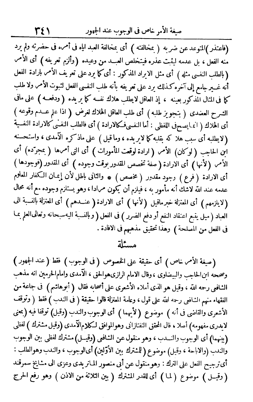(صِيغَة الْأَمر خَاص) أَي حَقِيقَة على الْخُصُوص (فِي الْوُجُوب) فَقَط (عِنْد الْجُمْهُور) وَصَححهُ ابْن الْحَاجِب والبيضاوي، وَقَالَ الإِمَام الرَّازِيّ هُوَ الْحق، الْآمِدِيّ وَإِمَام الْحَرَمَيْنِ أَنه مَذْهَب الشَّافِعِي رَحمَه الله، وَقيل هُوَ الَّذِي أملاه الْأَشْعَرِيّ على أَصْحَابه فَقَالَ (أَبُو هَاشم) فِي جمَاعَة من الْفُقَهَاء مِنْهُم الشَّافِعِي رَحمَه الله على قَول، وَعَامة الْمُعْتَزلَة قَالُوا حَقِيقَة (فِي النّدب) فَقَط (وَتوقف الْأَشْعَرِيّ وَالْقَاضِي فِي أَنه) مَوْضُوع (لأيهما) أَي الْوُجُوب وَالنَّدْب (وَقيل) توقفا فِيهِ (بِمَعْنى لَا يدْرِي مَفْهُومه) أصلا، قَالَ الْمُحَقق التَّفْتَازَانِيّ وَهُوَ الْمُوَافق لكَلَام الْآمِدِيّ (وَقيل مُشْتَرك) لَفْظِي (بَينهمَا) أَي الْوُجُوب وَالنَّدْب، وَهُوَ مَنْقُول عَن الشَّافِعِي (وَقيل) مُشْتَرك لَفْظِي بَين الْوُجُوب وَالنَّدْب (وَالْإِبَاحَة، وَقيل) مَوْضُوع (للمشترك بَين الْأَوَّلين) أَي الْوُجُوب، وَالنَّدْب وَهُوَ الطّلب: أَي تَرْجِيح الْفِعْل على التّرْك: وَهُوَ مَنْقُول عَن أبي مَنْصُور الماتريدي وعزى إِلَى مَشَايِخ سَمَرْقَنْد (وَقيل) مَوْضُوع (لما) أَي للقدر الْمُشْتَرك (بَين الثَّلَاثَة من الْأذن) وَهُوَ رفع الْحَرج