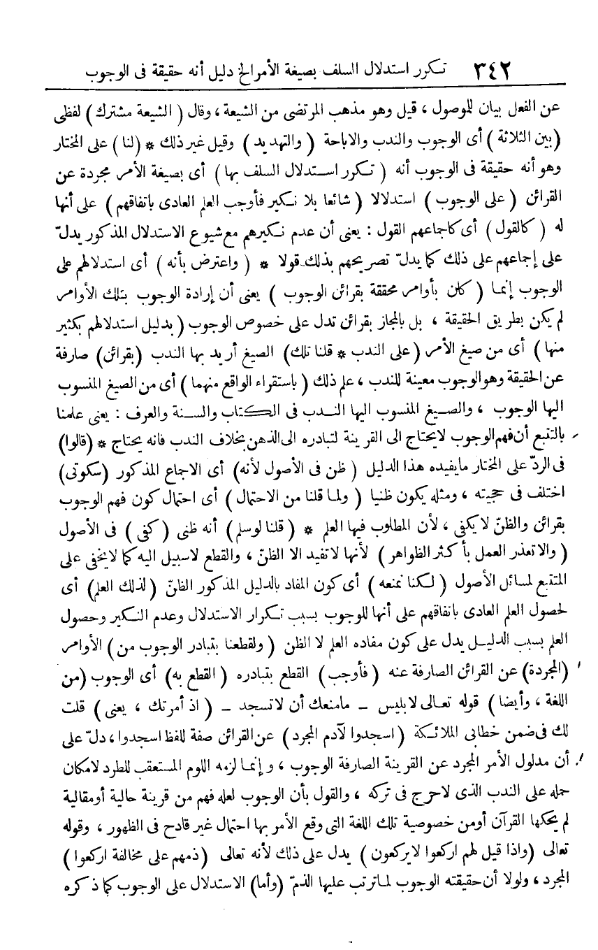 عَن الْفِعْل بَيَان للموصول، قيل وَهُوَ مَذْهَب المرتضى من الشِّيعَة، وَقَالَ (الشِّيعَة مُشْتَرك) لَفْظِي (بَين الثَّلَاثَة) أَي الْوُجُوب وَالنَّدْب وَالْإِبَاحَة (والتهديد) وَقيل غير ذَلِك (لنا) على الْمُخْتَار وَهُوَ أَنه حَقِيقَة فِي الْوُجُوب أَنه (تكَرر اسْتِدْلَال السّلف بهَا) أَي بِصِيغَة الْأَمر مُجَرّدَة عَن الْقَرَائِن (على الْوُجُوب) اسْتِدْلَالا (شَائِعا بِلَا نَكِير فَأوجب الْعلم العادي باتفاقهم) على أَنَّهَا لَهُ (كالقول) أَي كإجماعهم القَوْل: يَعْنِي أَن عدم نكيرهم مَعَ شيوع الِاسْتِدْلَال الْمَذْكُور يدل على إِجْمَاعهم على ذَلِك كَمَا يدل تصريحهم بذلك قولا (وَاعْترض بِأَنَّهُ) أَي استدلالهم على الْوُجُوب إِنَّمَا (كَانَ بأوامر مُحَققَة بقرائن الْوُجُوب) يَعْنِي أَن إِرَادَة الْوُجُوب بِتِلْكَ الْأَوَامِر لم يكن بطرِيق الْحَقِيقَة، بل بالمجاز بقرائن تدل على خُصُوص الْوُجُوب (بِدَلِيل استدلالهم بِكَثِير مِنْهَا) أَي من صِيغ الْأَمر (على النّدب قُلْنَا تِلْكَ) الصِّيَغ أُرِيد بهَا النّدب (بقرائن) صارفة عَن الْحَقِيقَة وَهُوَ الْوُجُوب مُعينَة للنَّدْب، علم ذَلِك (باستقراء الْوَاقِع مِنْهُمَا) أَي من الصِّيَغ الْمَنْسُوب إِلَيْهَا الْوُجُوب، والصيغ الْمَنْسُوب إِلَيْهَا النّدب فِي الْكتاب وَالسّنة وَالْعرْف: يَعْنِي علمنَا بالتتبع أَن فهم الْوُجُوب لَا يحْتَاج إِلَى الْقَرِينَة لتبادره إِلَى الذِّهْن بِخِلَاف النّدب فَإِنَّهُ يحْتَاج (قَالُوا) فِي الرَّد على الْمُخْتَار مَا يفِيدهُ هَذَا الدَّلِيل (ظن فِي الْأُصُول لِأَنَّهُ) أَي الْإِجْمَاع الْمَذْكُور (سكوتي) اخْتلف فِي حجيته، وَمثله يكون ظنيا (وَلما قُلْنَا من الِاحْتِمَال) أَي احْتِمَال كَون فهم الْوُجُوب بقرائن وَالظَّن لَا يَكْفِي، لِأَن الْمَطْلُوب فِيهَا الْعلم (قُلْنَا لَو سلم) أَنه ظَنِّي (كفى) فِي الْأُصُول (وَإِلَّا تعذر الْعَمَل بِأَكْثَرَ الظَّوَاهِر) لِأَنَّهَا لَا تفِيد إِلَّا الظَّن، وَالْقطع لَا سَبِيل إِلَيْهِ كَمَا لَا يخفى على المتتبع لمسائل الْأُصُول (لَكنا نمنعه) أَي كَون المفاد بِالدَّلِيلِ الْمَذْكُور الظَّن (لذَلِك الْعلم) أَي لحُصُول الْعلم العادي باتفاقهم على أَنَّهَا للْوُجُوب بِسَبَب تكْرَار الِاسْتِدْلَال وَعدم النكير وَحُصُول الْعلم بِسَبَب الدَّلِيل يدل على كَون مفاده الْعلم إِلَّا الظَّن (ولقطعنا بتبادر الْوُجُوب من) الْأَوَامِر (الْمُجَرَّدَة) عَن الْقَرَائِن الصارفة عَنهُ (فَأوجب) الْقطع بتبادره (الْقطع بِهِ) أَي الْوُجُوب (من اللُّغَة، وَأَيْضًا) قَوْله تَعَالَى لإبليس - {مَا مَنعك أَن لَا تسْجد} - (إِذْ أَمرتك، يَعْنِي) قلت لَك فِي ضمن خطابي الْمَلَائِكَة {اسجدوا لآدَم} الْمُجَرّد) عَن الْقَرَائِن صفة للفظ اسجدوا، دلّ على أَن مَدْلُول الْأَمر الْمُجَرّد عَن الْقَرِينَة الصارفة للْوُجُوب، وَإِنَّمَا لزمَه اللوم المستعقب للطرد لَا مَكَان حمله على النّدب الَّذِي لَا حرج فِي تَركه، وَالْقَوْل بِأَن الْوُجُوب لَعَلَّه فهم من قرينَة حَالية أَو مقالية لم يحكها الْقُرْآن أَو من خُصُوصِيَّة تِلْكَ اللُّغَة الَّتِي وَقع الْأَمر بهَا احْتِمَال غير قَادِح فِي الظُّهُور، وَقَوله تَعَالَى {وَإِذا قيل لَهُم ارْكَعُوا لَا يَرْكَعُونَ} يدل على ذَلِك لِأَنَّهُ تَعَالَى (ذمهم على مُخَالفَة ارْكَعُوا) الْمُجَرّد، وَلَوْلَا أَن حَقِيقَته الْوُجُوب لما ترَتّب عَلَيْهَا الذَّم (وَأما) الِاسْتِدْلَال على الْوُجُوب كَمَا ذكره