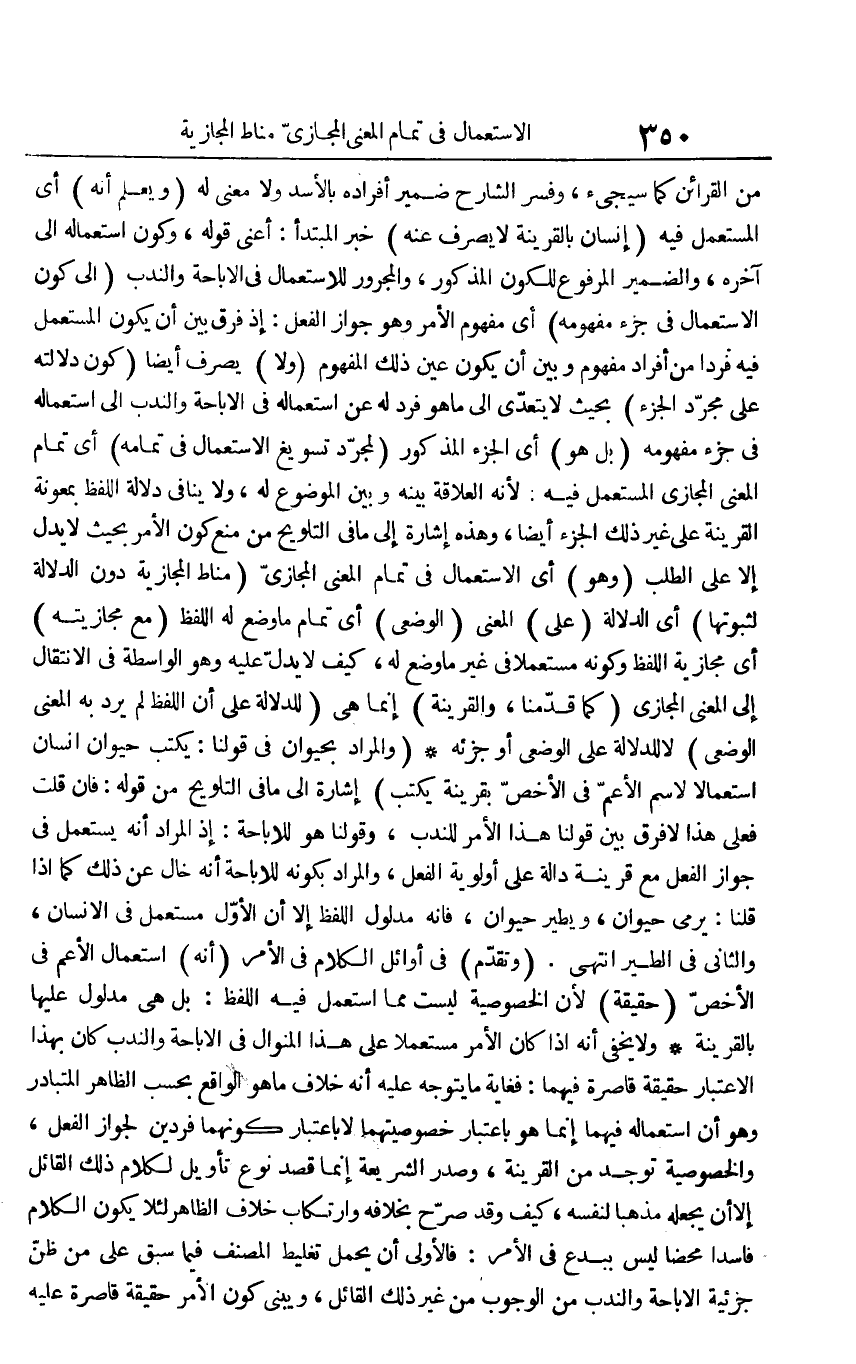 من الْقَرَائِن كَمَا سَيَجِيءُ، وَفسّر الشَّارِح ضمير أَفْرَاده بالأسد وَلَا معنى لَهُ (وَيعلم أَنه) أَي الْمُسْتَعْمل فِيهِ (إِنْسَان بِالْقَرِينَةِ لَا يصرف عَنهُ) خبر الْمُبْتَدَأ: أَعنِي قَوْله، وَكَون اسْتِعْمَاله إِلَى آخِره، وَالضَّمِير الْمَرْفُوع للكون الْمَذْكُور، وَالْمَجْرُور للاستعمال فِي الْإِبَاحَة وَالنَّدْب (إِلَى كَون الِاسْتِعْمَال فِي جُزْء مَفْهُومه) أَي مَفْهُوم الْأَمر وَهُوَ جَوَاز الْفِعْل: إِذْ فرق بَين أَن يكون الْمُسْتَعْمل فِيهِ فَردا من أَفْرَاد مَفْهُوم وَبَين أَن يكون عين ذَلِك الْمَفْهُوم (وَلَا) يصرف أَيْضا (كَون دلَالَته على مُجَرّد الْجُزْء) بِحَيْثُ لَا يتَعَدَّى إِلَى ماهو فَرد لَهُ عَن اسْتِعْمَاله فِي الْإِبَاحَة وَالنَّدْب إِلَى اسْتِعْمَاله فِي جُزْء مَفْهُومه (بل هُوَ) أَي الْجُزْء الْمَذْكُور (لمُجَرّد تسويغ الِاسْتِعْمَال فِي تَمَامه) أَي تَمام الْمَعْنى الْمجَازِي الْمُسْتَعْمل فِيهِ: لِأَنَّهُ العلاقة بَينه وَبَين الْمَوْضُوع لَهُ، وَلَا ينافى دلَالَة اللَّفْظ بمعونة الْقَرِينَة على غير ذَلِك الْجُزْء أَيْضا، وَهَذِه إِشَارَة إِلَى مَا فِي التَّلْوِيح من منع كَون الْأَمر بِحَيْثُ لَا يدل إِلَّا على الطّلب (وَهُوَ) أَي الِاسْتِعْمَال فِي تَمام الْمَعْنى الْمجَازِي (منَاط المجازية دون الدّلَالَة لثبوتها) أَي الدّلَالَة (على) الْمَعْنى (الوضعي) أَي تَمام مَا وضع لَهُ اللَّفْظ (مَعَ مجازيته) أَي مجازية اللَّفْظ وَكَونه مُسْتَعْملا فِي غير مَا وضع لَهُ، كَيفَ لَا يدل عَلَيْهِ وَهُوَ الْوَاسِطَة فِي الِانْتِقَال إِلَى الْمَعْنى الْمجَازِي (كَمَا قدمنَا، والقرينة) إِنَّمَا هِيَ (للدلالة على أَن اللَّفْظ لم يرد بِهِ الْمَعْنى الوضعي) لَا للدلالة على الوضعي أَو جزئه (وَالْمرَاد بحيوان فِي قَوْلنَا: يكْتب حَيَوَان إِنْسَان اسْتِعْمَالا لاسم الْأَعَمّ فِي الْأَخَص بِقَرِينَة يكْتب) إِشَارَة إِلَى مَا فِي التَّلْوِيح من قَوْله: فَإِن قلت فعلى هَذَا لَا فرق بَين قَوْلنَا هَذَا الْأَمر للنَّدْب، وَقَوْلنَا هُوَ للْإِبَاحَة: إِذْ المُرَاد أَنه يسْتَعْمل فِي جَوَاز الْفِعْل مَعَ قرينَة دَالَّة على أَوْلَوِيَّة الْفِعْل، وَالْمرَاد بِكَوْنِهِ للْإِبَاحَة أَنه خَال عَن ذَلِك كَمَا إِذا قُلْنَا: يَرْمِي حَيَوَان، ويطير حَيَوَان، فَإِنَّهُ مَدْلُول اللَّفْظ إِلَّا أَن الأول مُسْتَعْمل فِي الْإِنْسَان، وَالثَّانِي فِي الطير انْتهى. (وَتقدم) فِي أَوَائِل الْكَلَام فِي الْأَمر (أَنه) اسْتِعْمَال الْأَعَمّ فِي الْأَخَص (حَقِيقَة) لِأَن الخصوصية لَيست مِمَّا اسْتعْمل فِيهِ اللَّفْظ: بل هِيَ مَدْلُول عَلَيْهَا بِالْقَرِينَةِ وَلَا يخفى أَنه إِذا كَانَ الْأَمر مُسْتَعْملا على هَذَا المنوال فِي الْإِبَاحَة وَالنَّدْب كَانَ بِهَذَا الِاعْتِبَار حَقِيقَة قَاصِرَة فيهمَا: فغاية مَا يتَوَجَّه عَلَيْهِ أَنه خلاف مَا هُوَ الْوَاقِع بِحَسب الظَّاهِر الْمُتَبَادر وَهُوَ أَن اسْتِعْمَاله فيهمَا إِنَّمَا هُوَ بِاعْتِبَار خصوصيتهما لَا بِاعْتِبَار كَونهمَا فردين لجَوَاز الْفِعْل، والخصوصية تُوجد من الْقَرِينَة، وَصدر الشَّرِيعَة إِنَّمَا قصد نوع تَأْوِيل لكَلَام ذَلِك الْقَائِل إِلَّا أَن يَجعله مذهبا لنَفسِهِ، كَيفَ وَقد صرح بِخِلَافِهِ وارتكاب خلاف الظَّاهِر لِئَلَّا يكون الْكَلَام فَاسِدا مَحْضا لَيْسَ ببدع فِي الْأَمر: فَالْأولى أَن يحمل تغليط المُصَنّف فِيمَا سبق على من ظن جزئية الْإِبَاحَة وَالنَّدْب من الْوُجُوب من غير ذَلِك الْقَائِل، وَيَبْنِي كَون الْأَمر حَقِيقَة قَاصِرَة عَلَيْهِ