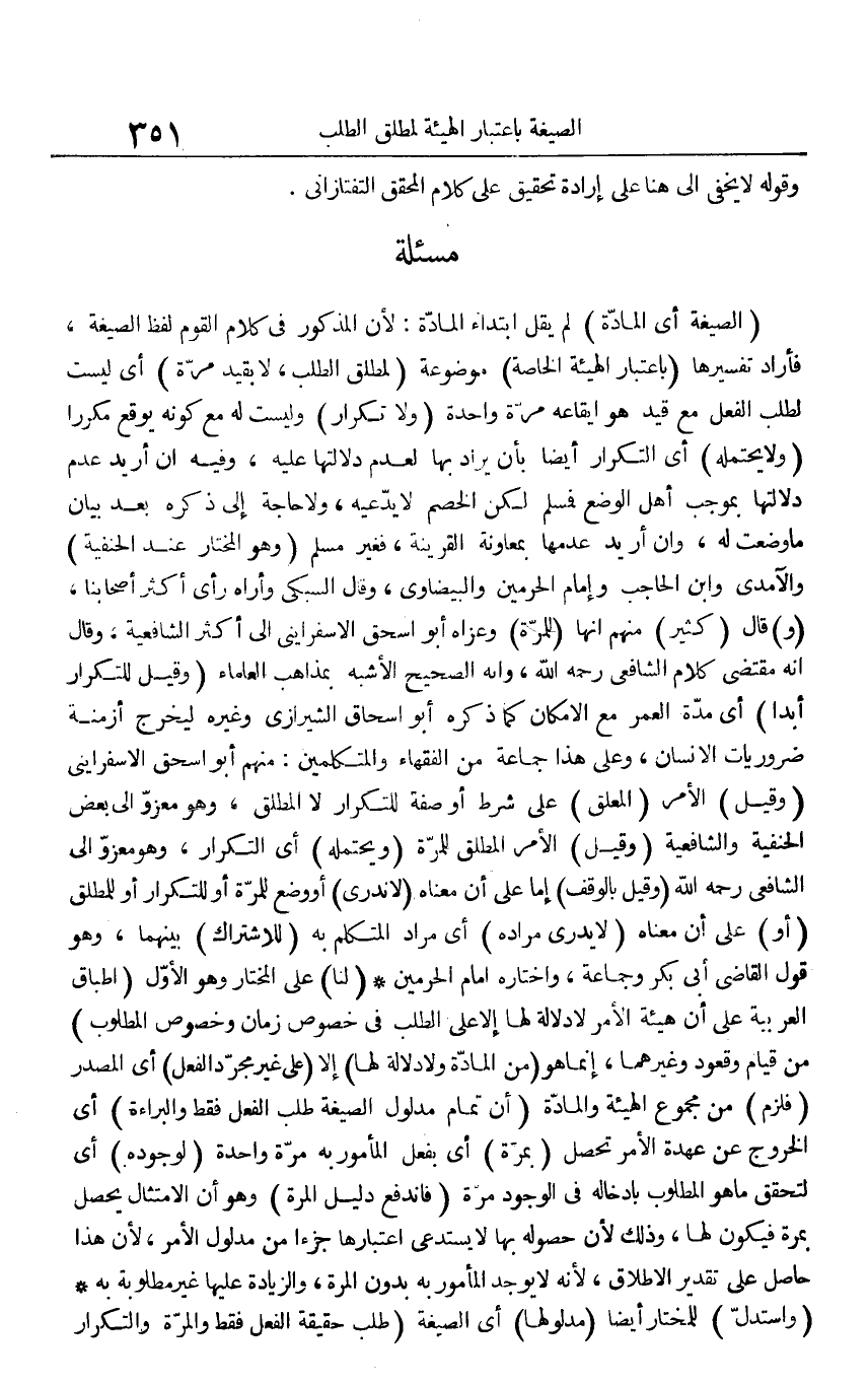 (الصِّيغَة أَي الْمَادَّة) لم يقل ابْتِدَاء الْمَادَّة: لِأَن الْمَذْكُور فِي كَلَام الْقَوْم لفظ الصِّيغَة، فَأَرَادَ تَفْسِيرهَا (بِاعْتِبَار الْهَيْئَة الْخَاصَّة) مَوْضُوعَة (لمُطلق الطّلب، لَا بِقَيْد مرّة) أَي لَيست لطلب الْفِعْل مَعَ قيد هُوَ إِيقَاعه مرّة وَاحِدَة (وَلَا تكْرَار) وَلَيْسَت لَهُ مَعَ كَونه يُوقع مكررا (وَلَا يحْتَملهُ) أَي التّكْرَار أَيْضا بِأَن يُرَاد بهَا لعدم دلالتها عَلَيْهِ، وَفِيه إِن أُرِيد عدم دلالتها بِمُوجب أهل الْوَضع فَمُسلم لَكِن الْخصم لَا يَدعِيهِ، وَلَا حَاجَة إِلَى ذكره بعد بَيَان مَا وضعت لَهُ، وَإِن أُرِيد عدمهَا بمعاونة الْقَرِينَة، فَغير مُسلم (وَهُوَ الْمُخْتَار عِنْد الْحَنَفِيَّة) والآمدي وَابْن الْحَاجِب وَإِمَام الْحَرَمَيْنِ والبيضاوي، وَقَالَ السُّبْكِيّ وَأرَاهُ رَأْي أَكثر أَصْحَابنَا، (و) قَالَ (كثير) مِنْهُم أَنَّهَا (للمرة) وَعَزاهُ أَبُو إِسْحَق الاسفرايني إِلَى أَكثر الشَّافِعِيَّة، وَقَالَ أَنه مُقْتَضى كَلَام الشَّافِعِي رَحمَه الله، وَأَنه الصَّحِيح الْأَشْبَه بمذاهب الْعلمَاء (وَقيل للتكرار أبدا) أَي مُدَّة الْعُمر مَعَ الْإِمْكَان كَمَا ذكره أَبُو إِسْحَاق الشِّيرَازِيّ وَغَيره ليخرج أزمنة ضروريات الْإِنْسَان، وعَلى هَذَا جمَاعَة من الْفُقَهَاء والمتكلمين: مِنْهُم أَبُو إِسْحَق الاسفرايني (وَقيل) الْأَمر (الْمُعَلق) على شَرط أَو صفة للتكرار لَا الْمُطلق، وَهُوَ معزو إِلَى بعض الْحَنَفِيَّة وَالشَّافِعِيَّة (وَقيل) الْأَمر الْمُطلق للمرة (ويحتمله) أَي التّكْرَار، وَهُوَ معزو إِلَى الشَّافِعِي رَحمَه الله (وَقيل بِالْوَقْفِ) إِمَّا على أَن مَعْنَاهُ (لَا نَدْرِي) أَو وضع للمرة أَو للتكرار أَو للمطلق (أَو) على أَن مَعْنَاهُ (لَا يدْرِي مُرَاده) أَي مُرَاد الْمُتَكَلّم بِهِ (للاشتراك) بَينهمَا، وَهُوَ قَول القَاضِي أبي بكر وَجَمَاعَة، وَاخْتَارَهُ إِمَام الْحَرَمَيْنِ (لنا) على الْمُخْتَار وَهُوَ الأول (إطباق الْعَرَبيَّة على أَن هَيْئَة الْأَمر لَا دلَالَة لَهَا إِلَّا على الطّلب فِي خُصُوص زمَان وخصوص الْمَطْلُوب) من قيام وقعود وَغَيرهمَا، إِنَّمَا هُوَ (من الْمَادَّة وَلَا دلَالَة لَهَا) إِلَّا (على غير مُجَرّد الْفِعْل) أَي الْمصدر (فَلَزِمَ) من مَجْمُوع الْهَيْئَة والمادة (أَن تَمام مَدْلُول الصِّيغَة طلب الْفِعْل فَقَط والبراءة) أَي الْخُرُوج عَن عُهْدَة الْأَمر تحصل (بِمرَّة) أَي بِفعل الْمَأْمُور بِهِ مرّة وَاحِدَة (لوُجُوده) أَي لتحَقّق مَا هُوَ الْمَطْلُوب بإدخاله فِي الْوُجُود مرّة (فَانْدفع دَلِيل الْمرة) وَهُوَ أَن الِامْتِثَال يحصل بِمرَّة فَيكون لَهَا، وَذَلِكَ لِأَن حُصُوله بهَا لَا يستدعى اعْتِبَارهَا جُزْءا من مَدْلُول الْأَمر، لِأَن هَذَا حَاصِل على تَقْدِير الْإِطْلَاق، لِأَنَّهُ لَا يُوجد الْمَأْمُور بِهِ بِدُونِ الْمرة، وَالزِّيَادَة عَلَيْهَا غير مَطْلُوبَة بِهِ (وَاسْتدلَّ) للمختار أَيْضا (مدلولها) أَي الصِّيغَة (طلب حَقِيقَة الْفِعْل فَقَط والمرة والتكرار