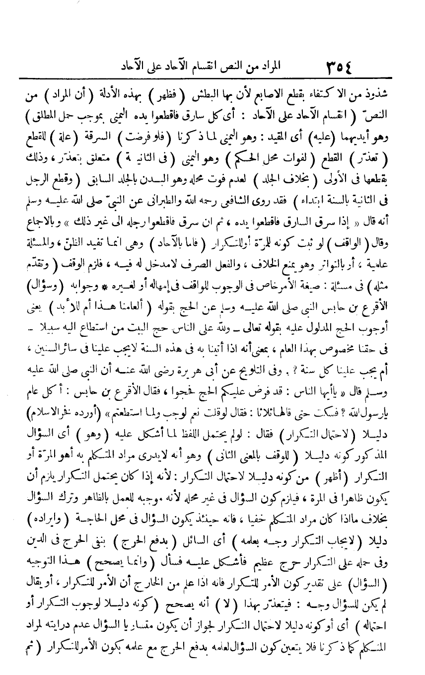 شذوذ من الِاكْتِفَاء بِقطع الْأَصَابِع لِأَن بهَا الْبَطْش (فَظهر) بِهَذِهِ الْأَدِلَّة (أَن المُرَاد) من النَّص (انقسام الْآحَاد على الْآحَاد: أَي كل سَارِق فَاقْطَعُوا يَده الْيُمْنَى بِمُوجب حمل الْمُطلق) وَهُوَ أَيْدِيهِمَا (عَلَيْهِ) أَي الْمُقَيد: وَهُوَ الْيُمْنَى لما ذكرنَا (فَلَو فرضت) السّرقَة (عِلّة) للْقطع (تعذر) الْقطع (لفَوَات مَحل الحكم) وَهُوَ الْيُمْنَى (فِي الثَّانِيَة) مُتَعَلق بتعذر، وَذَلِكَ بقطعها فِي الأولى (بِخِلَاف الْجلد) لعدم فَوت مَحَله وَهُوَ الْبدن بِالْجلدِ السَّابِق (وَقطع الرجل فِي الثَّانِيَة بِالسنةِ ابْتِدَاء) فقد روى الشَّافِعِي رَحمَه الله وَالطَّبَرَانِيّ عَن النَّبِي صلى الله عَلَيْهِ وَسلم أَنه قَالَ " إِذا سرق السَّارِق فَاقْطَعُوا يَده، ثمَّ إِن سرق فَاقْطَعُوا رجله إِلَى غير ذَلِك وبالإجماع وَقَالَ (الْوَاقِف) لَو ثَبت كَونه للمرة أَو للتكرار (فَأَما بالآحاد) وَهِي إِنَّمَا تفِيد الظَّن، والمسئلة علمية، أَو بالتواتر وَهُوَ يمْنَع الْخلاف، وَالْفِعْل الصّرْف لَا مدْخل لَهُ فِيهِ، فَلَزِمَ الْوَقْف (وَتقدم مثله) فِي مسئلة: صِيغَة الْأَمر خَاص فِي الْوُجُوب للْوَاقِف فِي إمهاله أَو لغيره وَجَوَابه (وسؤال) الْأَقْرَع بن حَابِس النَّبِي صلى الله عَلَيْهِ وَسلم عَن الْحَج بقوله (ألعامنا هَذَا أم لِلْأَبَد) يَعْنِي أوجوب الْحَج الْمَدْلُول عَلَيْهِ بقوله تَعَالَى - {وَللَّه على النَّاس حج الْبَيْت من اسْتَطَاعَ إِلَيْهِ سَبِيلا} - فِي حَقنا مَخْصُوص بِهَذَا الْعَام، بِمَعْنى أَنه إِذا أَتَيْنَا بِهِ فِي هَذِه السّنة لَا يجب علينا فِي سَائِر السنين، أم يجب علينا كل سنة؟. وَفِي التَّلْوِيح عَن أبي هُرَيْرَة رَضِي الله عَنهُ أَن النَّبِي صلى الله عَلَيْهِ وَسلم قَالَ " يَا أَيهَا النَّاس: قد فرض عَلَيْكُم الْحَج فحجوا، فَقَالَ الْأَقْرَع بن حَابِس: أكل عَام يَا رَسُول الله؟ فَسكت حَتَّى قَالَهَا ثَلَاثًا: فَقَالَ لَو قلت نعم لوَجَبَ وَلما اسْتَطَعْتُم " (أوردهُ فَخر الْإِسْلَام) دَلِيلا (لاحْتِمَال التّكْرَار) فَقَالَ: لَو لم يحْتَمل اللَّفْظ لما أشكل عَلَيْهِ (وَهُوَ) أَي السُّؤَال الْمَذْكُور كَونه دَلِيلا (للْوَقْف بِالْمَعْنَى الثَّانِي) وَهُوَ أَنه لَا يدْرِي مُرَاد الْمُتَكَلّم بِهِ أهوَ الْمرة أَو التّكْرَار (أظهر) من كَونه دَلِيلا لاحْتِمَال التّكْرَار: لِأَنَّهُ إِذا كَانَ يحْتَمل التّكْرَار يلْزم أَن يكون ظَاهرا فِي الْمرة، فَيلْزم كَون السُّؤَال فِي غير مَحَله لِأَنَّهُ مُوجبه للْعَمَل بِالظَّاهِرِ وَترك السُّؤَال بِخِلَاف مَا إِذا كَانَ مُرَاد الْمُتَكَلّم خفِيا، فَإِنَّهُ حِينَئِذٍ يكون السُّؤَال فِي مَحل الْحَاجة (وإيراده) دَلِيلا (لإِيجَاب التّكْرَار وَجه بِعِلْمِهِ) أَي السَّائِل (بِدفع الْحَرج) بِنَفْي الْحَرج فِي الدّين وَفِي حمله على التّكْرَار حرج عَظِيم فأشكل عَلَيْهِ فَسَأَلَ (وَإِنَّمَا يصحح) هَذَا التَّوْجِيه (السُّؤَال) على تَقْدِير كَون الْأَمر للتكرار فَإِنَّهُ إِذا علم من الْخَارِج أَن الْأَمر للتكرار، أَو يُقَال لم يكن للسؤال وَجه: فيتعذر بِهَذَا (لَا) أَنه يصحح (كَونه دَلِيلا لوُجُوب التّكْرَار أَو احْتِمَاله) أَي أَو كَونه دَلِيلا لاحْتِمَال التّكْرَار لجَوَاز أَن يكون مُتَسَاوِيا السُّؤَال عدم درايته لمراد الْمُتَكَلّم كَمَا ذكرنَا فَلَا يتَعَيَّن كَون السُّؤَال لعلمه بِدفع الْحَرج مَعَ علمه بِكَوْن الْأَمر للتكرار (ثمَّ