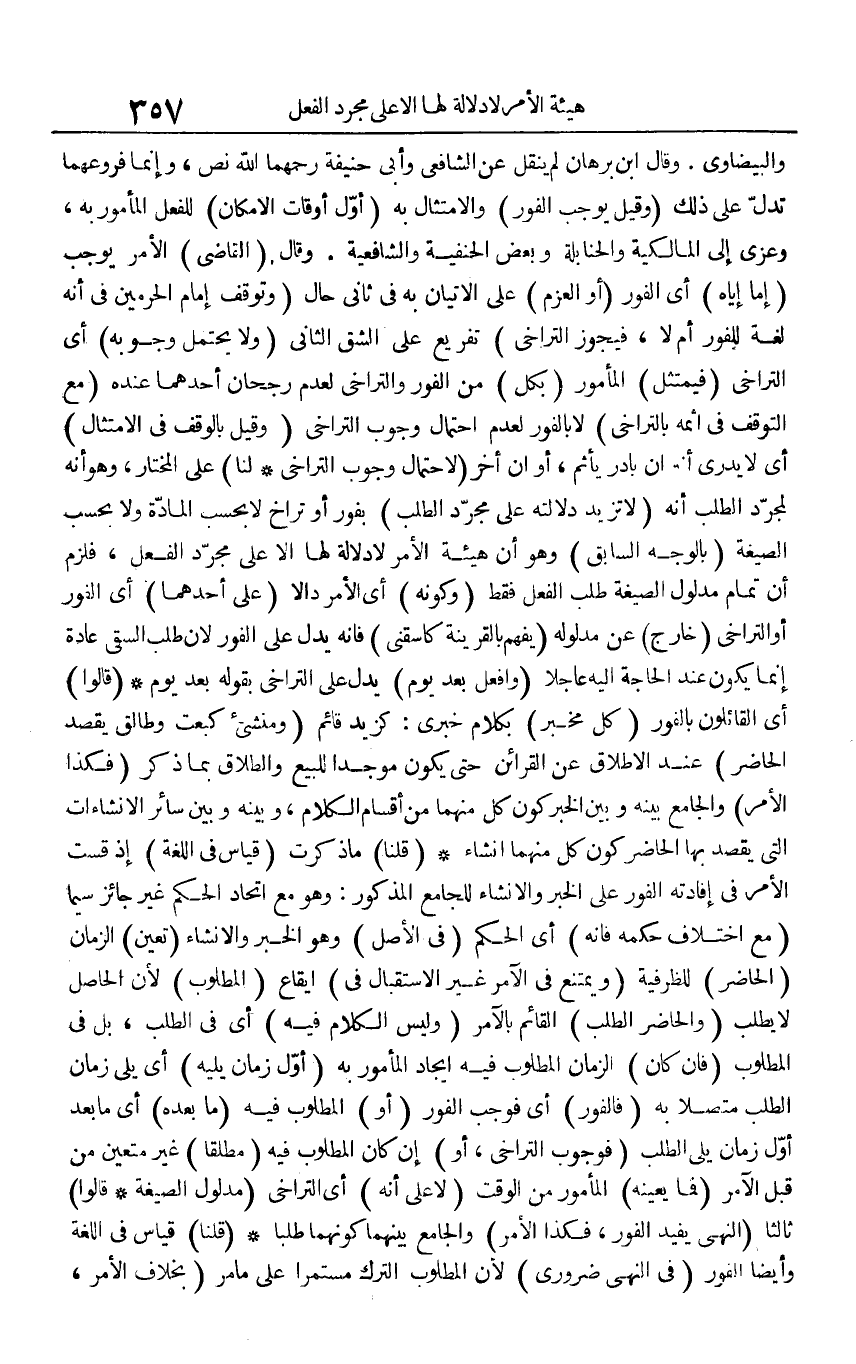 والبيضاوي. وَقَالَ ابْن برهَان لم ينْقل عَن الشَّافِعِي وَأبي حنيفَة رحمهمَا الله نَص، وَإِنَّمَا فروعهما تدل على ذَلِك (وَقيل يُوجب الْفَوْر) والامتثال بِهِ (أول أَوْقَات الْإِمْكَان) للْفِعْل الْمَأْمُور بِهِ، وعزى إِلَى الْمَالِكِيَّة والحنابلة وَبَعض الْحَنَفِيَّة وَالشَّافِعِيَّة. وَقَالَ (القَاضِي) الْأَمر يُوجب (إِمَّا إِيَّاه) أَي الْفَوْر (أَو الْعَزْم) على الْإِتْيَان بِهِ فِي ثَانِي حَال (وَتوقف إِمَام الْحَرَمَيْنِ فِي أَنه لُغَة للفور أم لَا، فَيجوز التَّرَاخِي) تَفْرِيع على الشق الثَّانِي (وَلَا يحْتَمل وُجُوبه) أَي التَّرَاخِي (فيمتثل) الْمَأْمُور (بِكُل) من الْفَوْز والتراخي لعدم رُجْحَان أَحدهمَا عِنْده (مَعَ التَّوَقُّف فِي أثمه بالتراخي) لَا بالفوز لعدم احْتِمَال وجوب التَّرَاخِي (وَقيل بِالْوَقْفِ فِي الِامْتِثَال) أَي لَا يدْرِي أَنه إِن بَادر يَأْثَم، أَو إِن أخر (لاحْتِمَال وجوب التَّرَاخِي لنا) على الْمُخْتَار، وَهُوَ أَنه لمُجَرّد الطّلب أَنه (لَا تزيد دلَالَته على مُجَرّد الطّلب) بفور أَو تزاخ لَا بِحَسب الْمَادَّة وَلَا بِحَسب الصِّيغَة (بِالْوَجْهِ السَّابِق) وَهُوَ أَن هَيْئَة الْأَمر لَا دلَالَة لَهَا إِلَّا على مُجَرّد الْفِعْل، فَلَزِمَ أَن تَمام مَدْلُول الصِّيغَة طلب الْفِعْل فَقَط (وَكَونه) أَي الْأَمر دَالا (على أَحدهمَا) أَي الْفَوْر أَو التَّرَاخِي (خَارج) عَن مَدْلُوله (يفهم بِالْقَرِينَةِ كاسقني) فَإِنَّهُ يدل على الْفَوْر لِأَن طلب السَّقْي عَادَة إِنَّمَا يكون عِنْد الْحَاجة إِلَيْهِ عَاجلا (وَافْعل بعد يَوْم) يدل على التَّرَاخِي بقوله بعد يَوْم (قَالُوا) أَي الْقَائِلُونَ بالفور (كل مخبر) بِكَلَام خبري: كزيد قَائِم (ومنشئ كبعت وَطَالِق يقْصد الْحَاضِر) عِنْد الْإِطْلَاق عَن الْقَرَائِن حَتَّى يكون موجدا للْبيع وَالطَّلَاق بِمَا ذكر (فَكَذَا الْأَمر) وَالْجَامِع بَينه وَبَين الْخَبَر كَون كل مِنْهُمَا من أَقسَام الْكَلَام، وَبَينه وَبَين سَائِر الإنشاءات الَّتِي يقْصد بهَا الْحَاضِر كَون كل مِنْهُمَا إنْشَاء (قُلْنَا) مَا ذكرت (قِيَاس فِي اللُّغَة) إِذْ قست الْأَمر فِي إفادته الْفَوْر على الْخَبَر والإنشاء للجامع الْمَذْكُور: وَهُوَ مَعَ اتِّحَاد الحكم غير جَائِز سِيمَا (مَعَ اخْتِلَاف حكمه فَإِنَّهُ) أَي الحكم (فِي الأَصْل) وَهُوَ الْخَبَر والإنشاء (تعين) الزَّمَان (الْحَاضِر) للظرفية (وَيمْتَنع فِي الْآمِر غير الِاسْتِقْبَال فِي) إِيقَاع (الْمَطْلُوب) لِأَن الْحَاصِل لَا يطْلب (والحاضر الطّلب) الْقَائِم بالآمر (وَلَيْسَ الْكَلَام فِيهِ) أَي فِي الطّلب، بل فِي الْمَطْلُوب (فَإِن كَانَ) الزَّمَان الْمَطْلُوب فِيهِ إِيجَاد الْمَأْمُور بِهِ (أول زمَان يَلِيهِ) أَي يَلِي زمَان الطّلب مُتَّصِلا بِهِ (فالفور) أَي فَوَجَبَ الْفَوْر (أَو) الْمَطْلُوب فِيهِ (مَا بعده) أَي مَا بعد أول زمَان يَلِي الطّلب (فوجوب التَّرَاخِي، أَو) إِن كَانَ الْمَطْلُوب فِيهِ (مُطلقًا) غير مُتَعَيّن من قبل الْآمِر (فَمَا يعنيه) الْمَأْمُور من الْوَقْت (لَا على أَنه) أَي التَّرَاخِي (مَدْلُول الصِّيغَة قَالُوا) ثَالِثا (النَّهْي يُفِيد الْفَوْر، فَكَذَا الْأَمر) وَالْجَامِع بَينهمَا كَونهمَا طلبا (قُلْنَا) قِيَاس فِي اللُّغَة وَأَيْضًا الْفَوْر (فِي النَّهْي ضَرُورِيّ) لِأَن الْمَطْلُوب التّرْك مستمرا على مَا مر (بِخِلَاف الْأَمر،